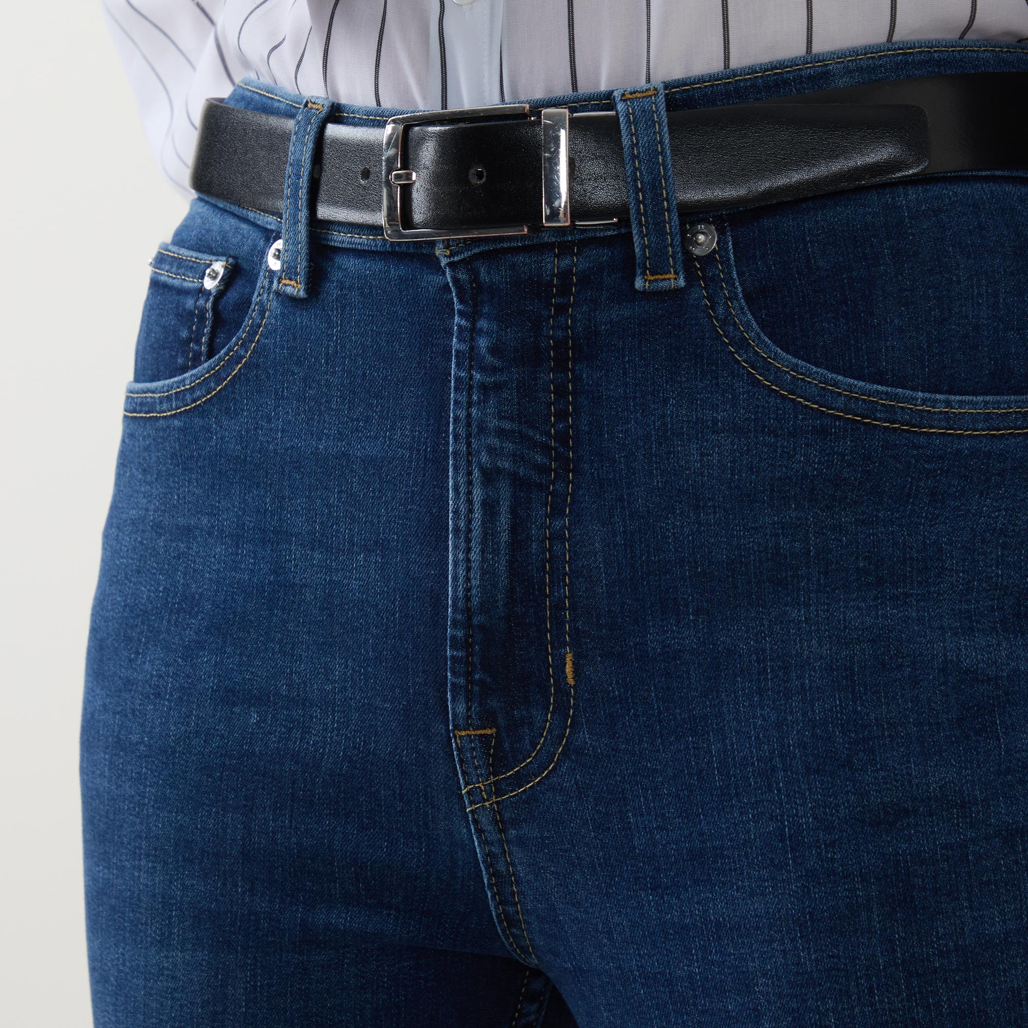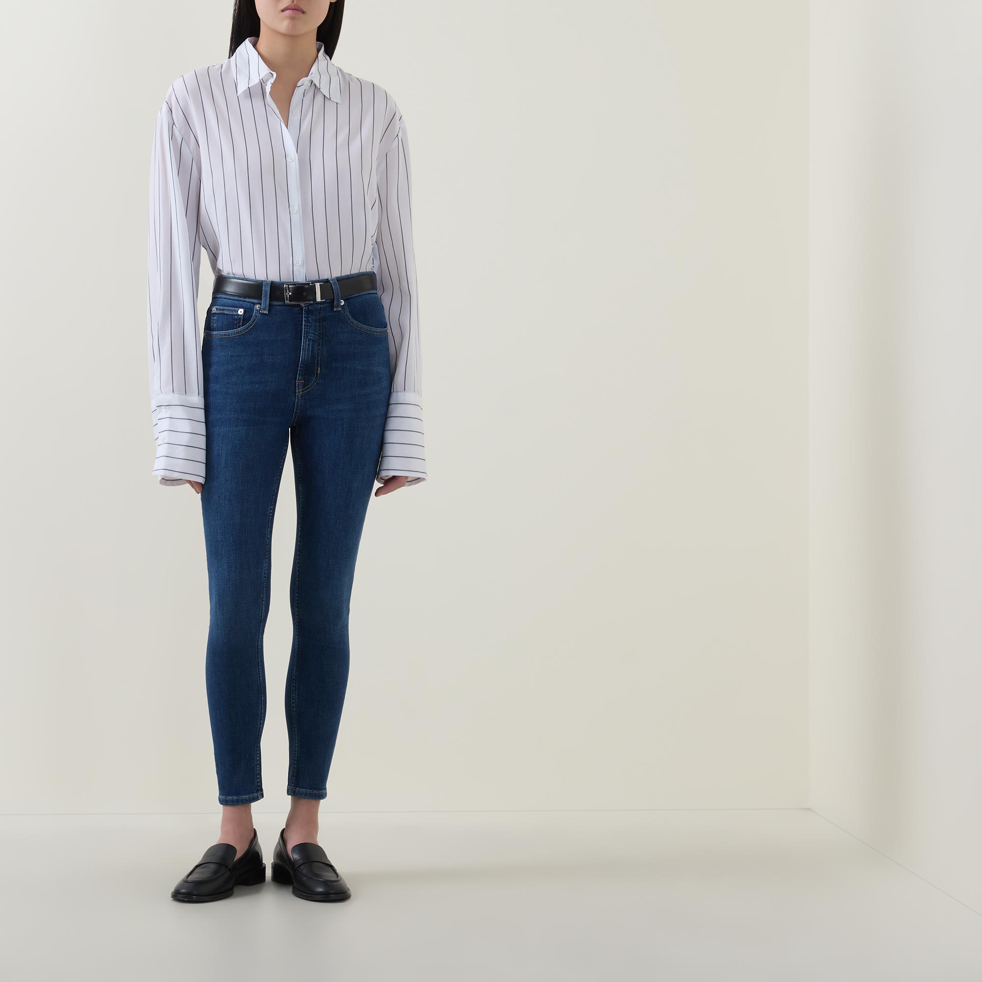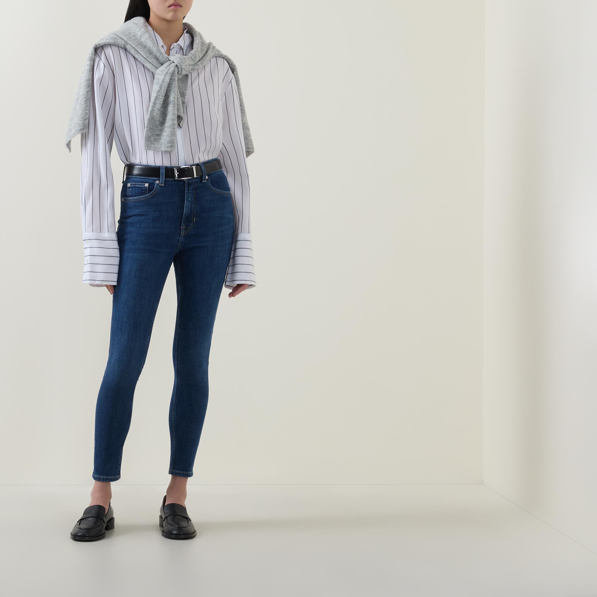 • High rise, skinny leg, belt loops, concealed fly and button fastening, five-pocket styling, clean hems, tobacco stitching, mid wash finish