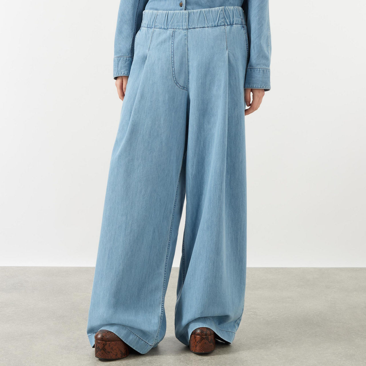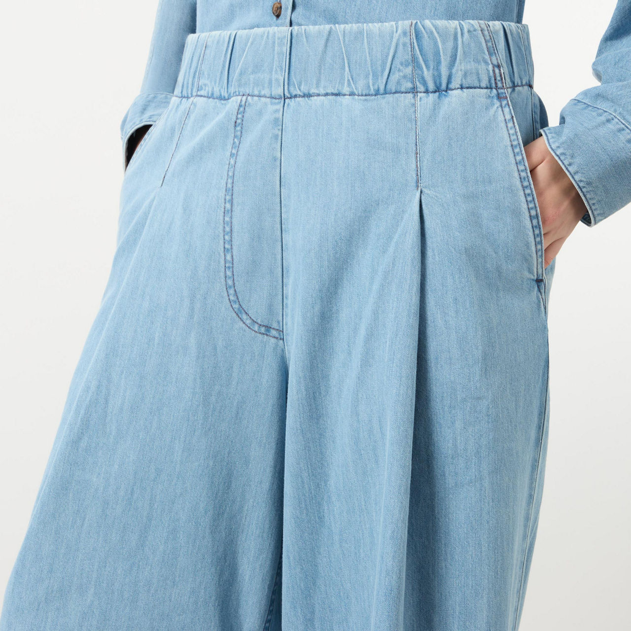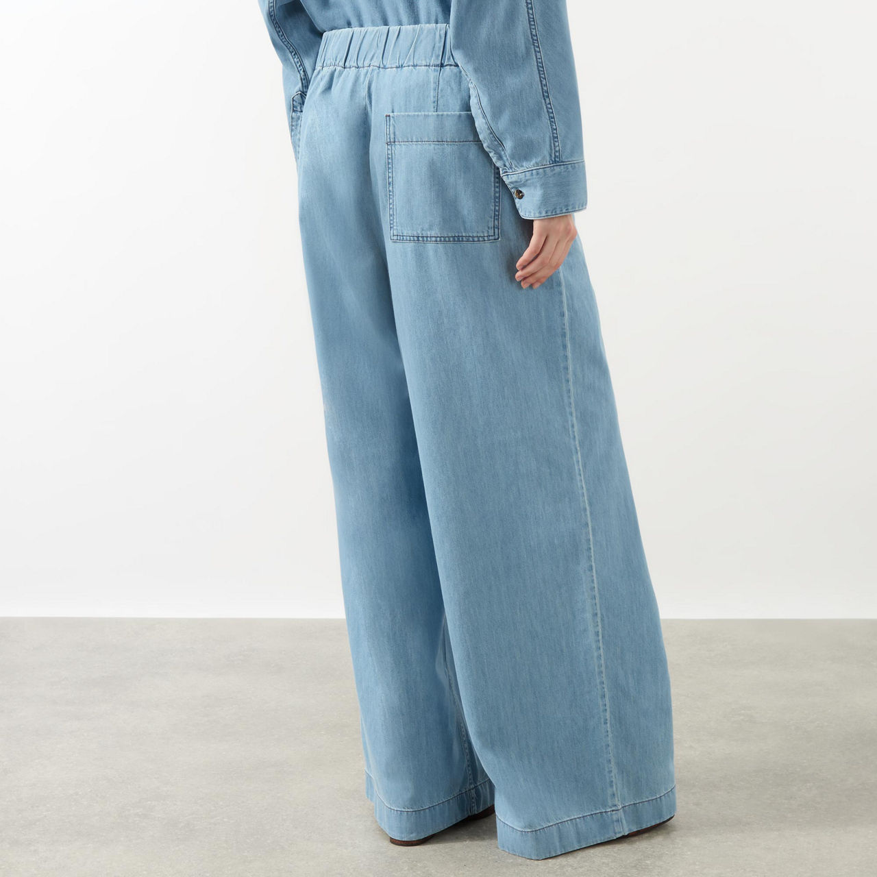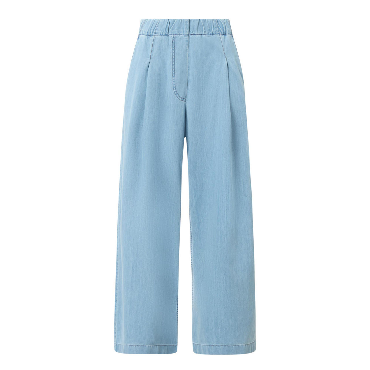 - Mid-rise, wide-leg, covered elasticated waistband, mock fly, front pleated detailing, two side slit pockets, one rear patch pocket, clean hems