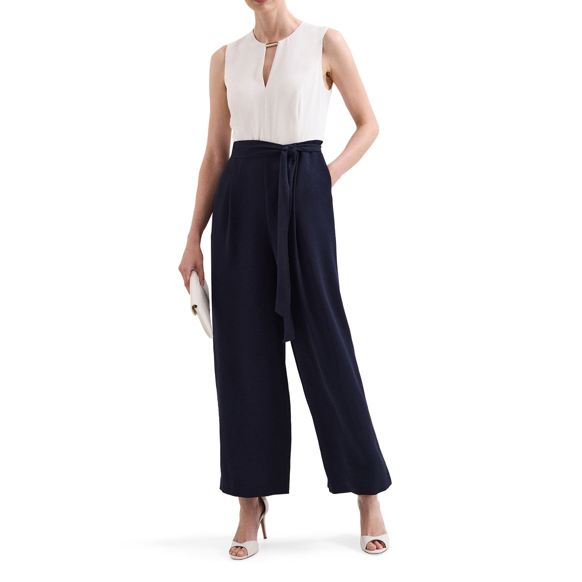 - Sleeveless, collared V-neckline, tie-fastening waist, two side in-seam pockets, wide-cut leg