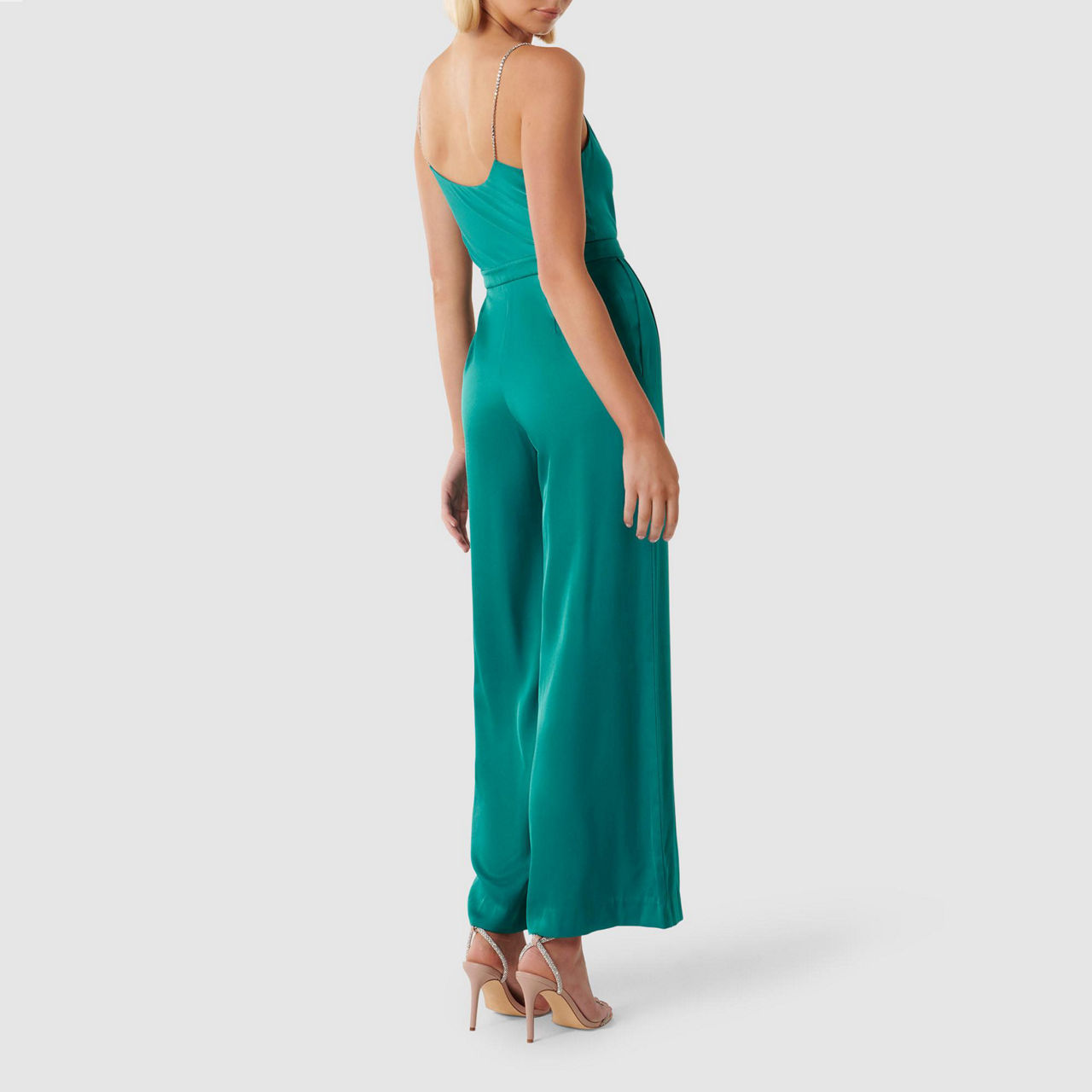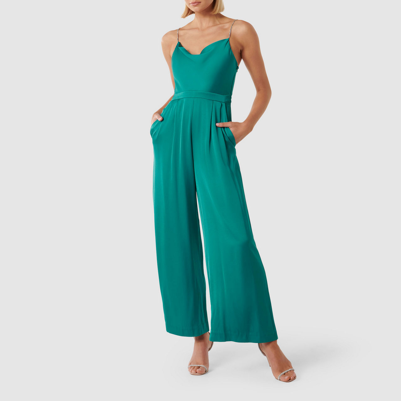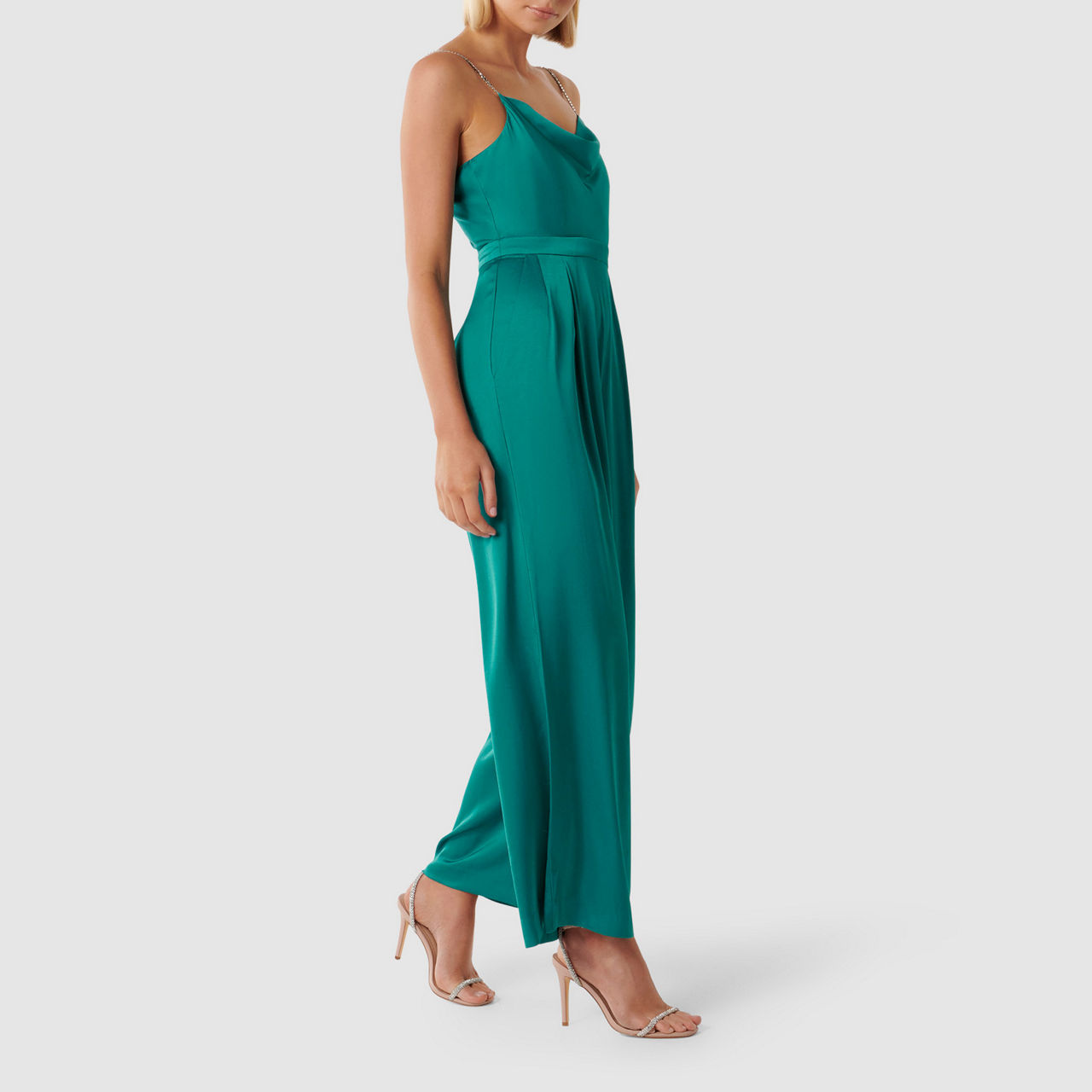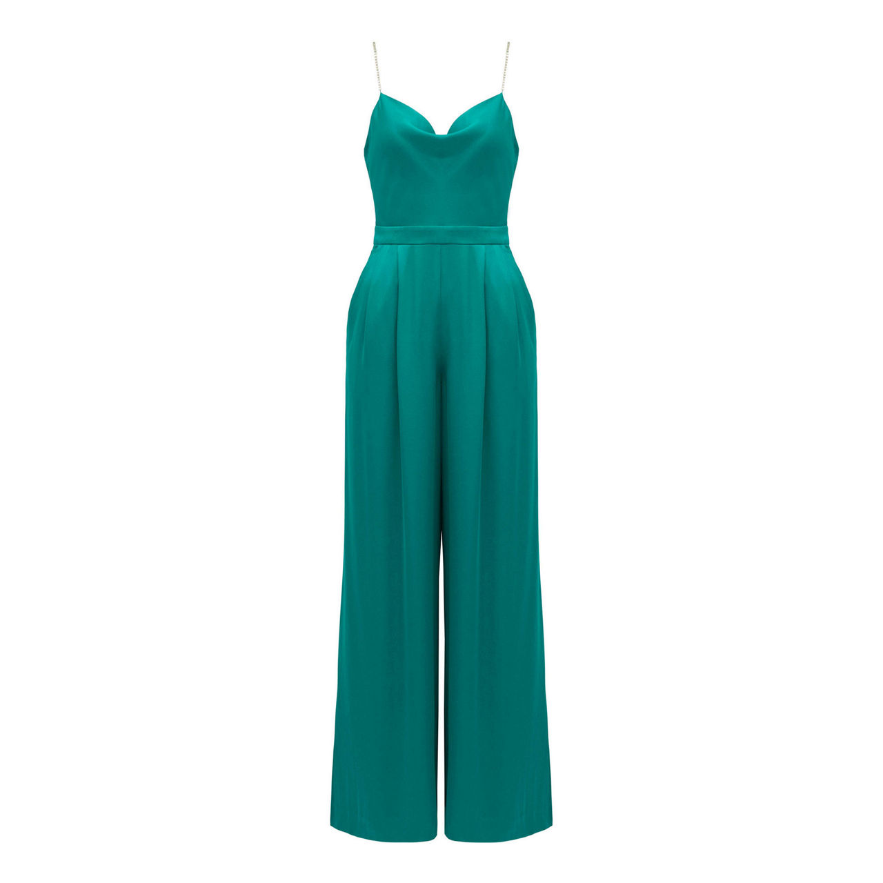 - Lustrous satin fabrication, cowl neckline, diamante straps, seamed waistband, wide, full-length leg, side pockets, concealed side zip fastening