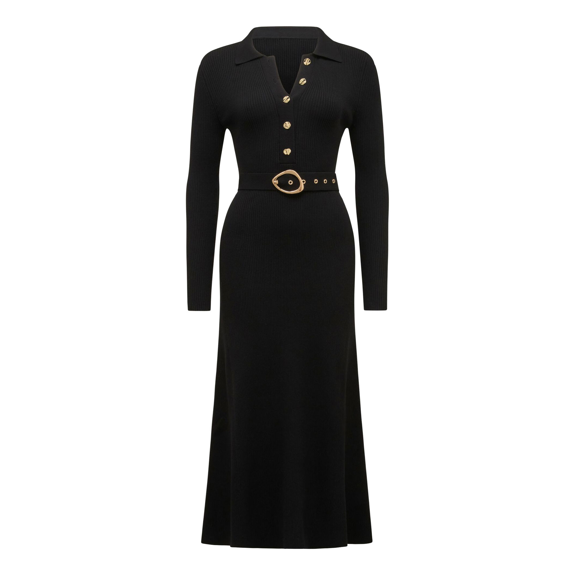 - Classic collar with placket, long fitted sleeves, adjustable belted waist, slightly flared column skirt, gold-tone buckle, button front placket