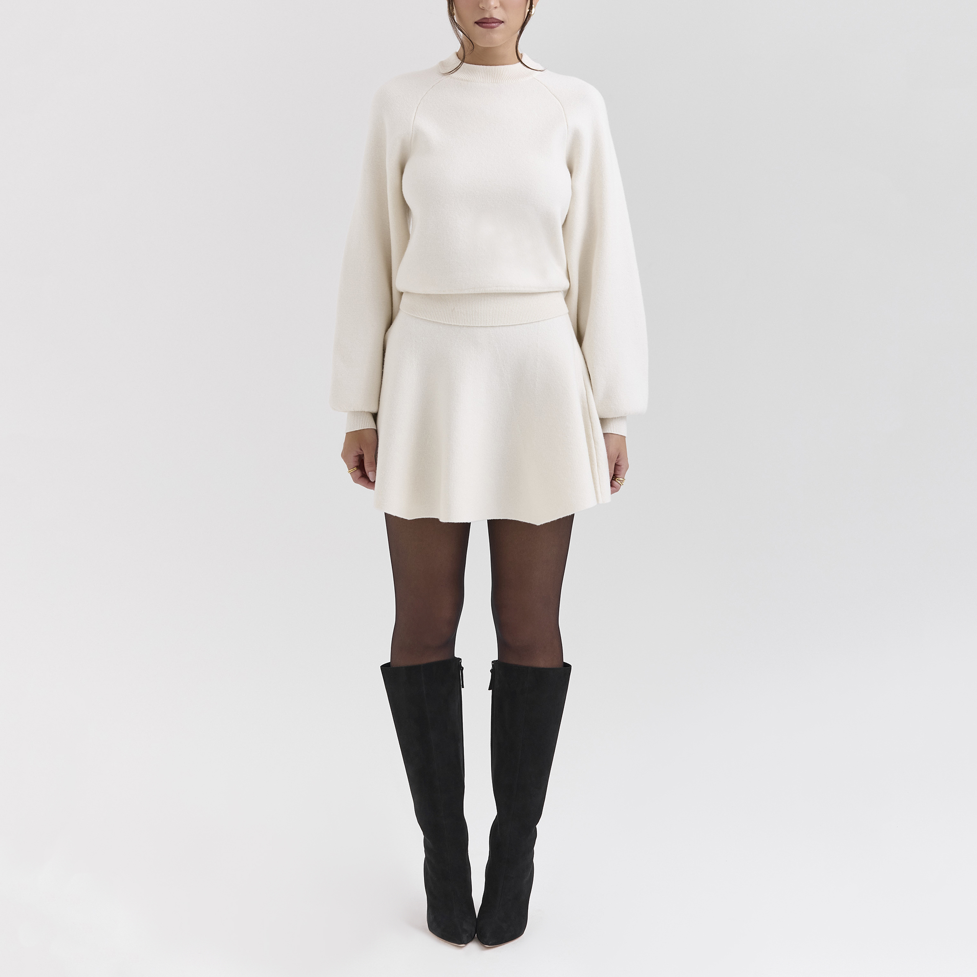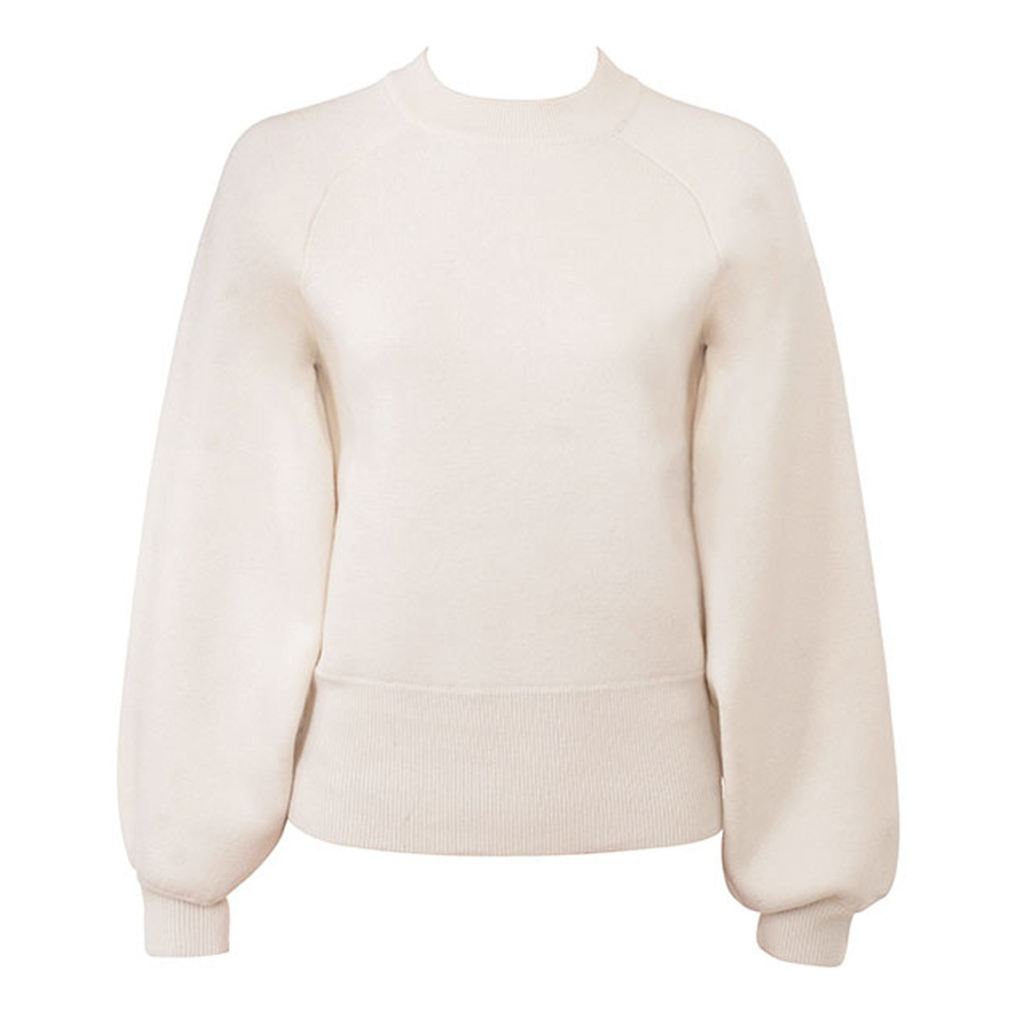 - Heavyweight wool-cashmere blend, crew neckline, long balloon sleeves, ribbed trims