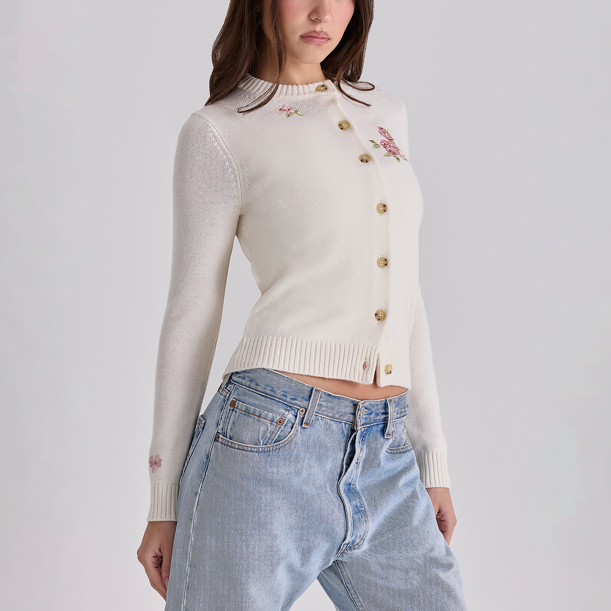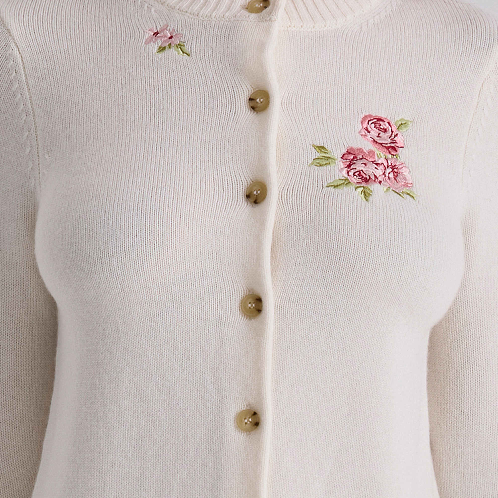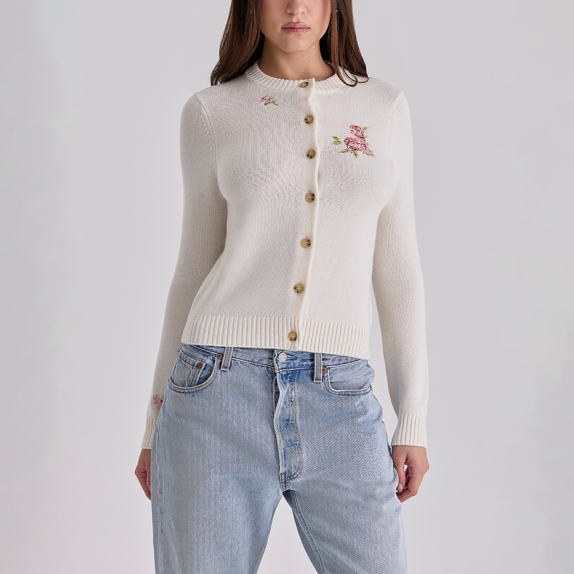 • Round neck, long sleeves, button-down front, straight hem, ribbed trims, feminine chest embroidery, ultra-luxe wool and cashmere, classic silhouette