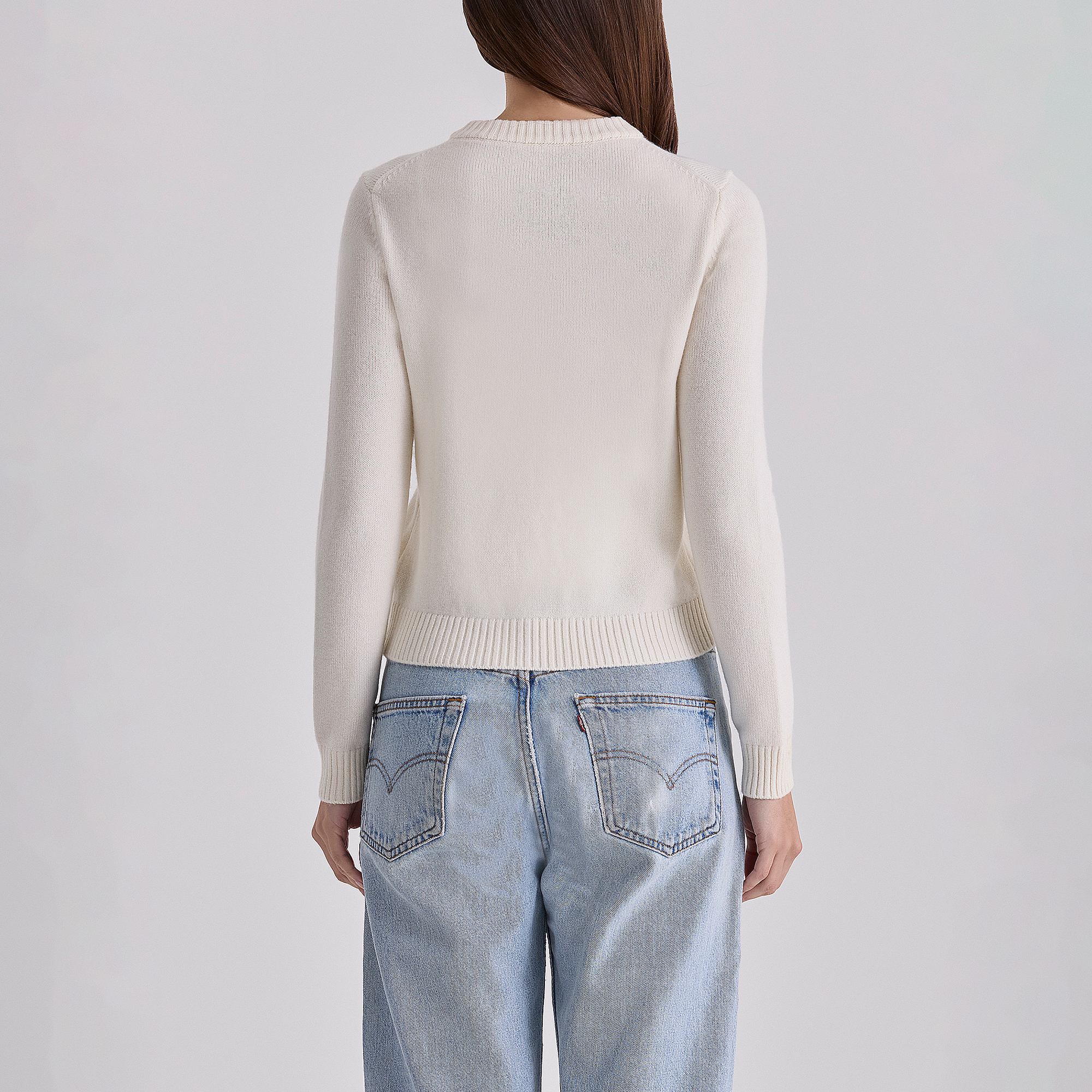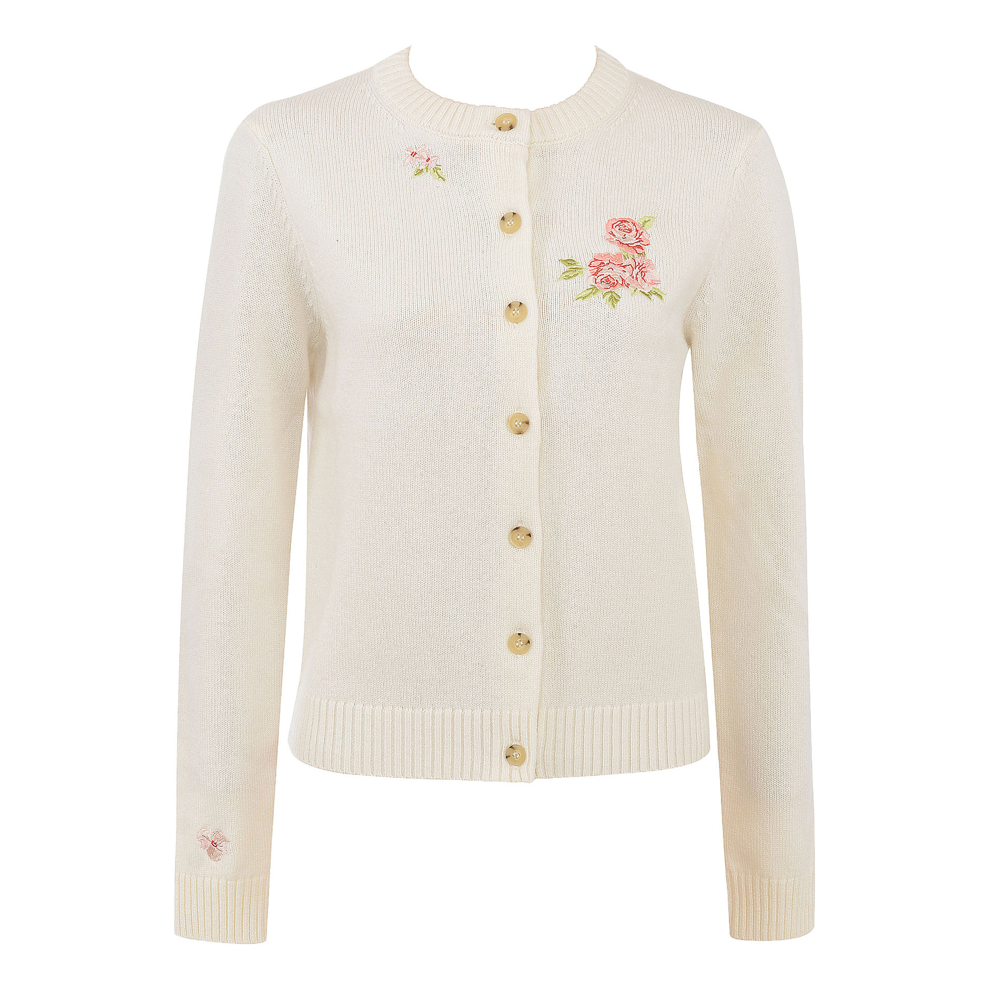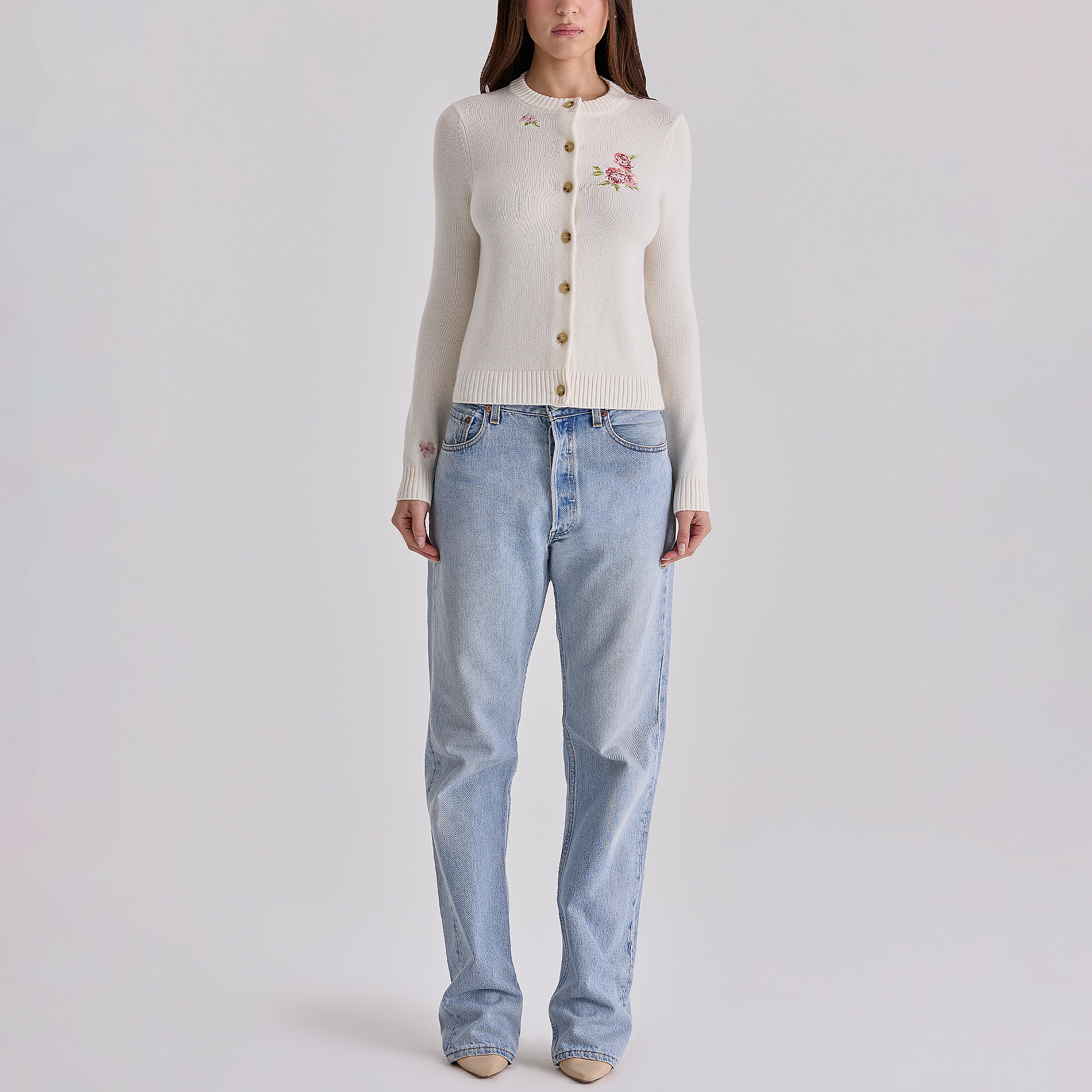 • Round neck, long sleeves, button-down front, straight hem, ribbed trims, feminine chest embroidery, ultra-luxe wool and cashmere, classic silhouette