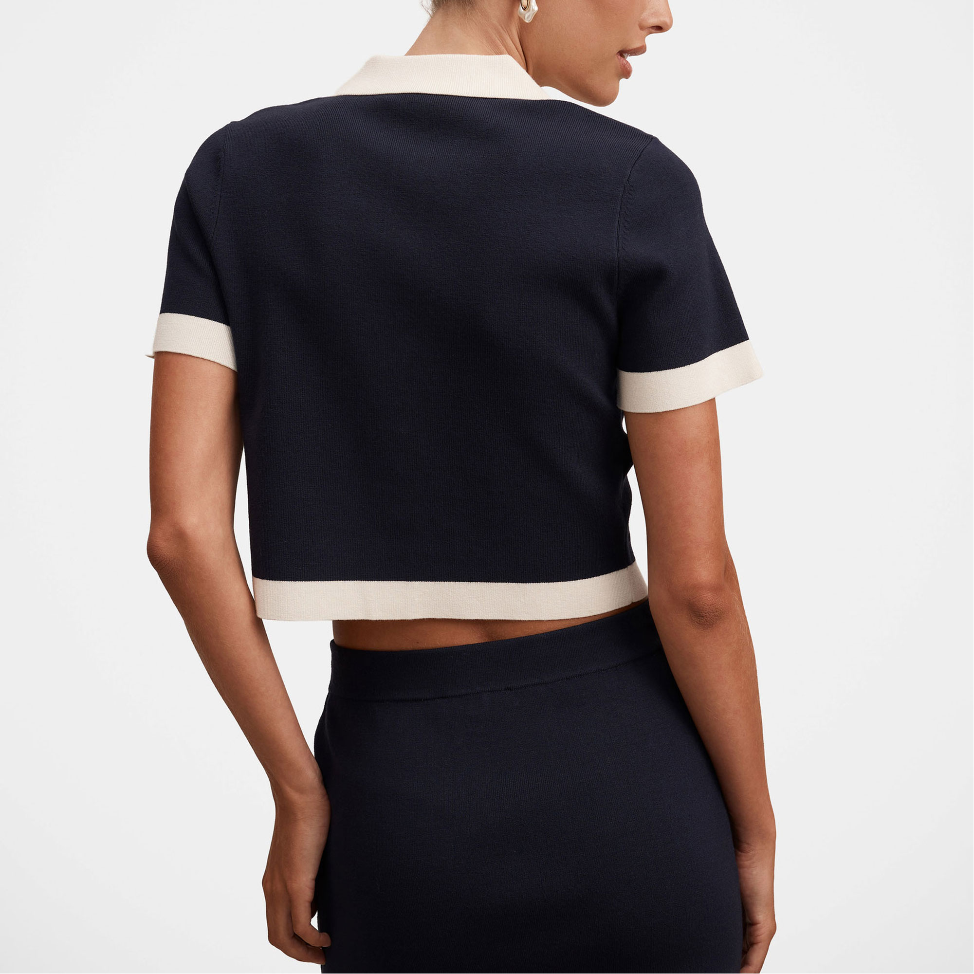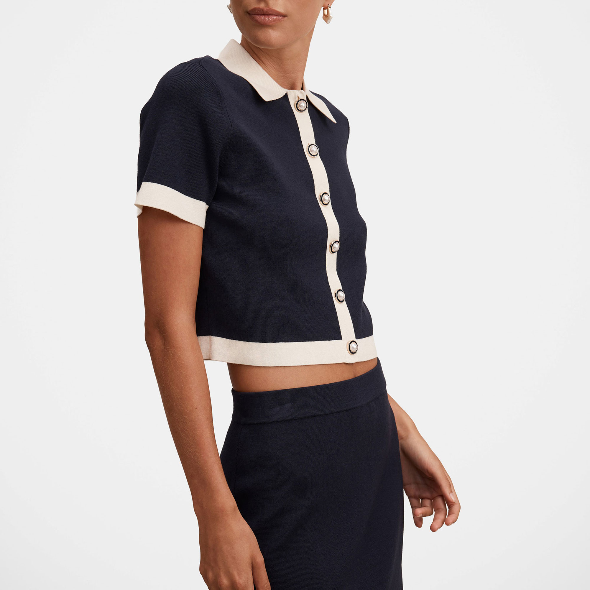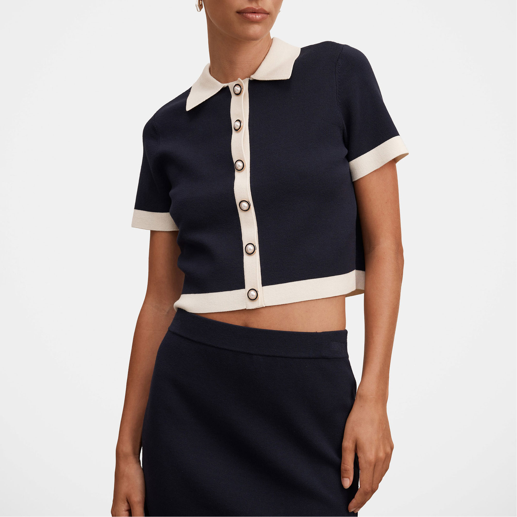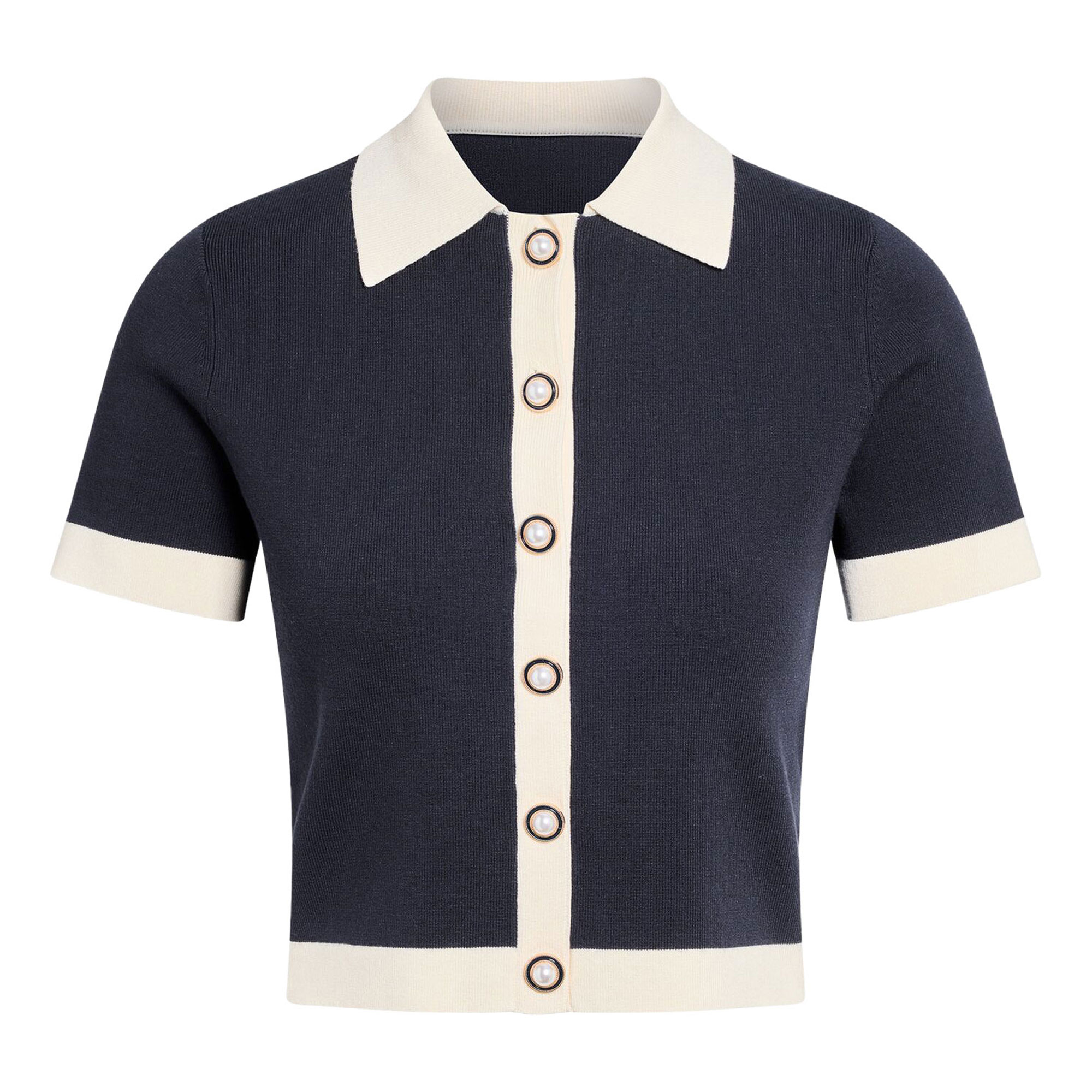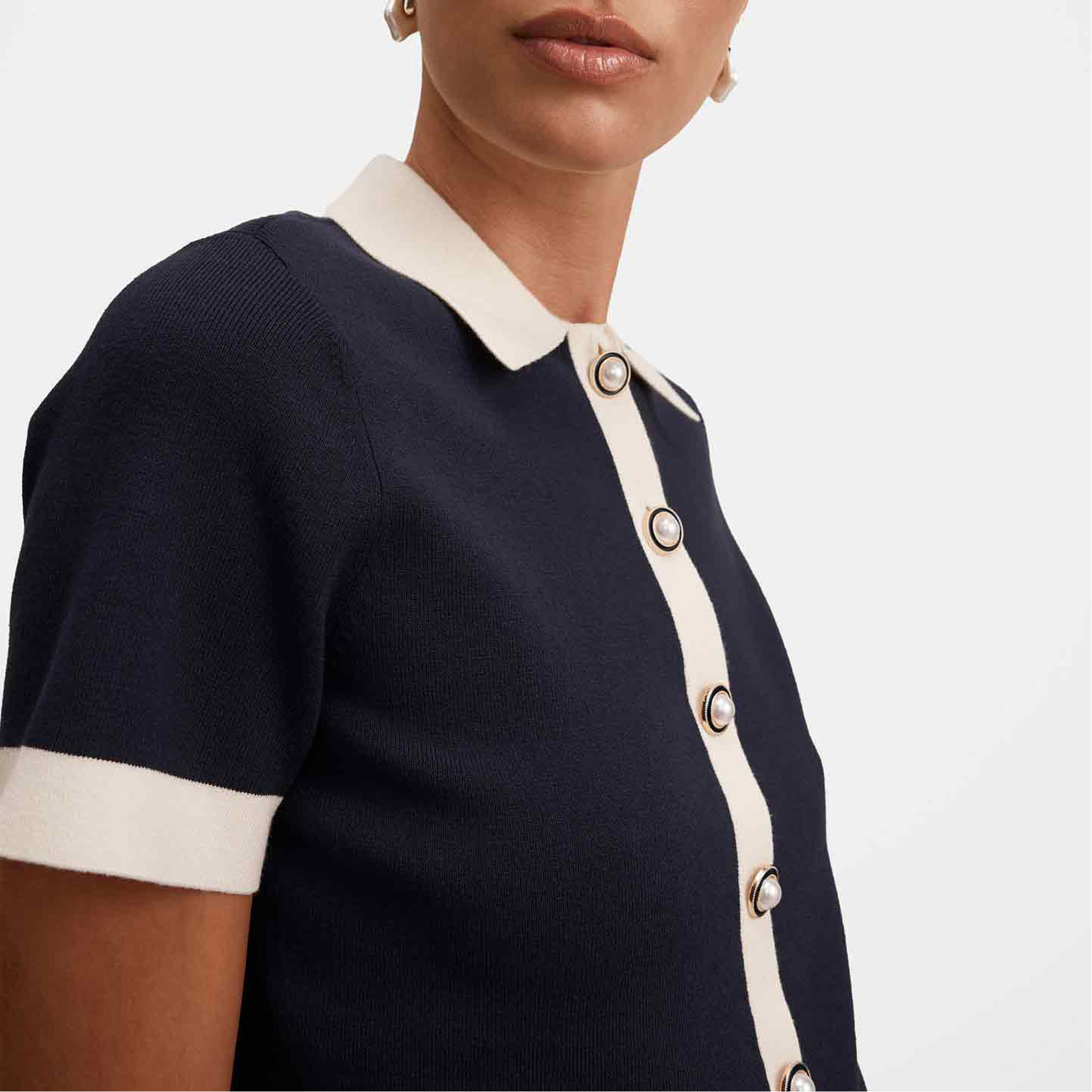 - Soft knit fabrication, fold-down collar, short sleeves, contrast trims, button front fastening