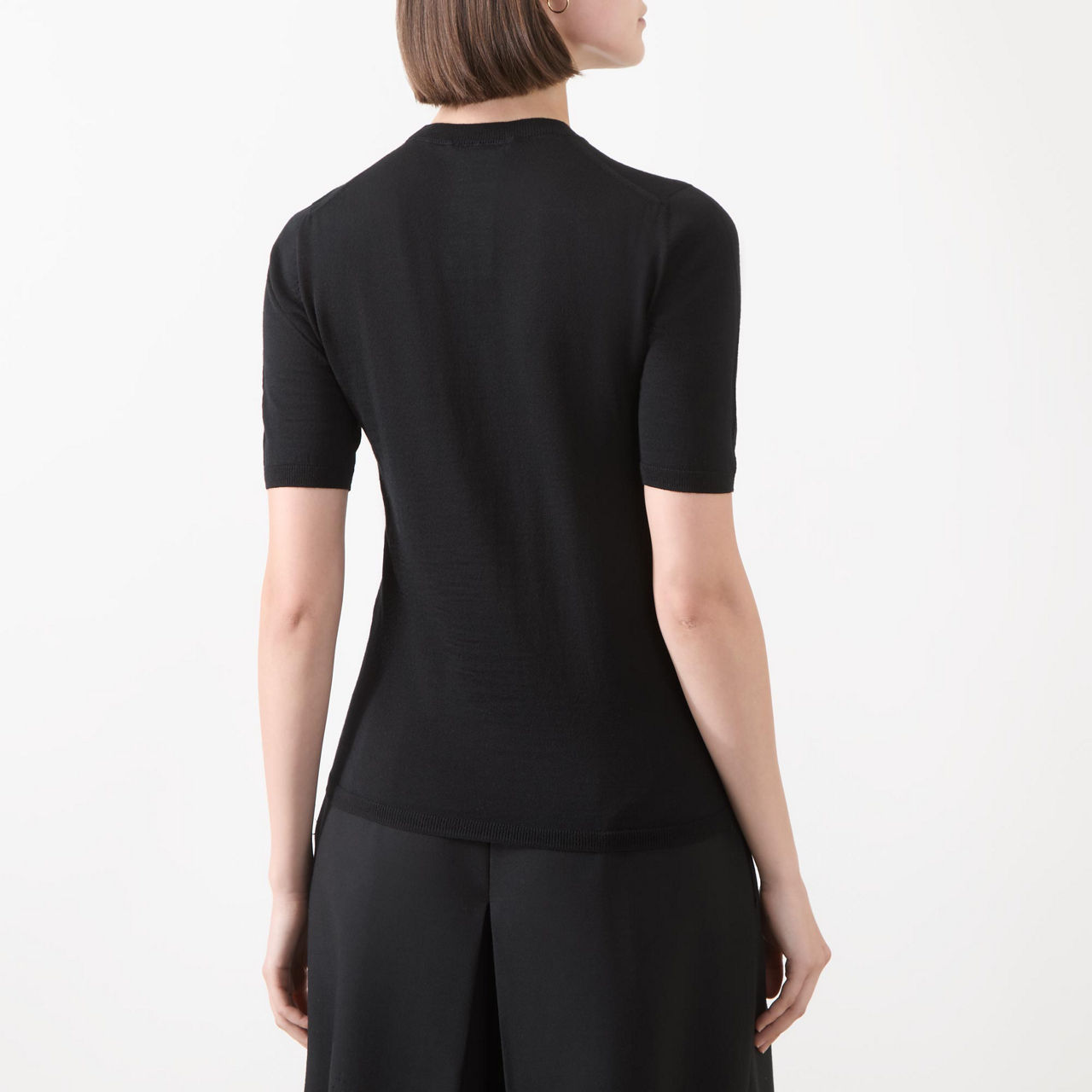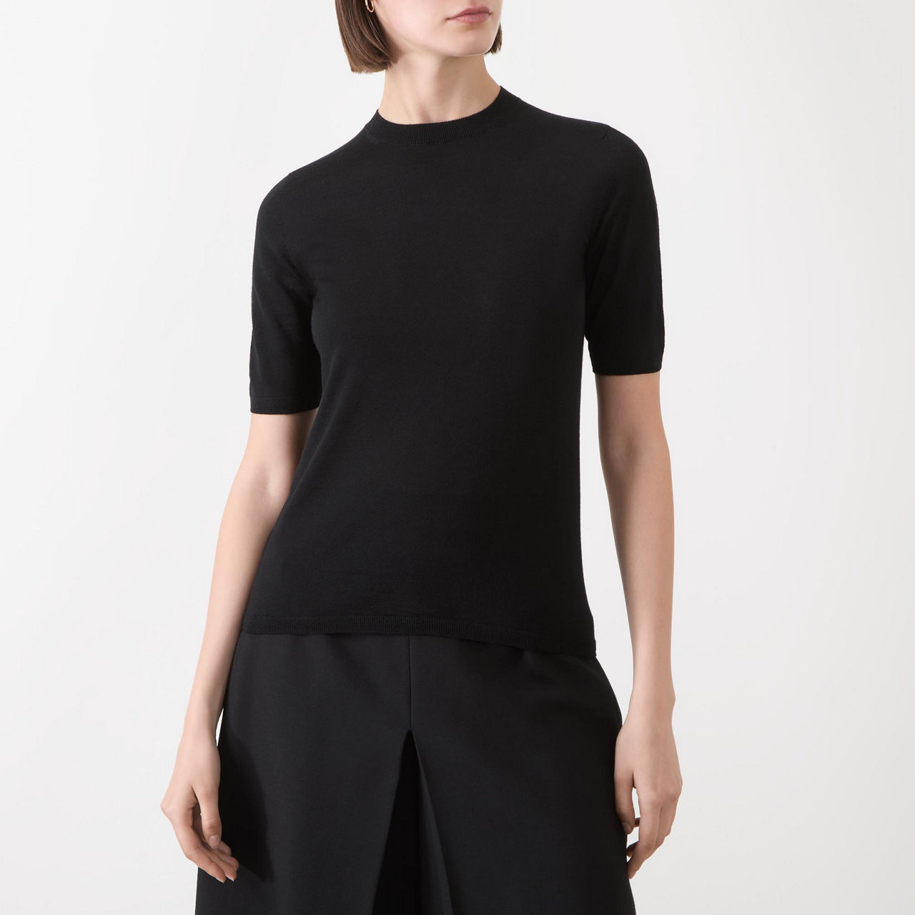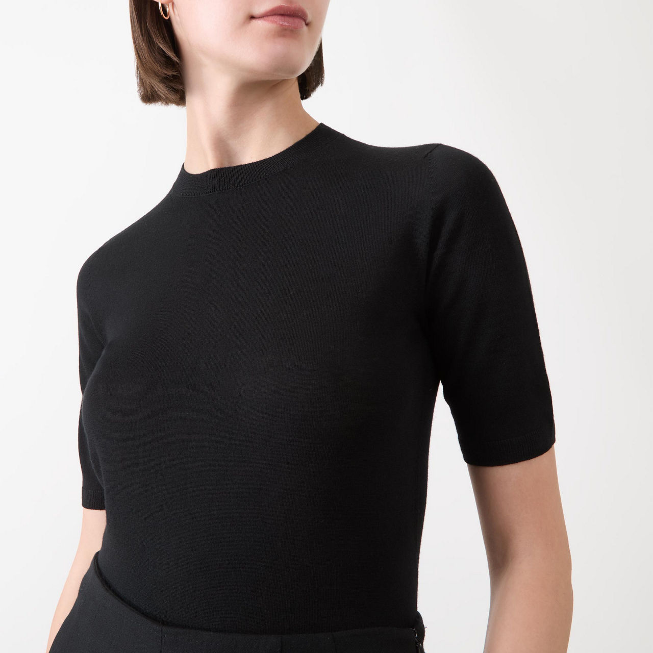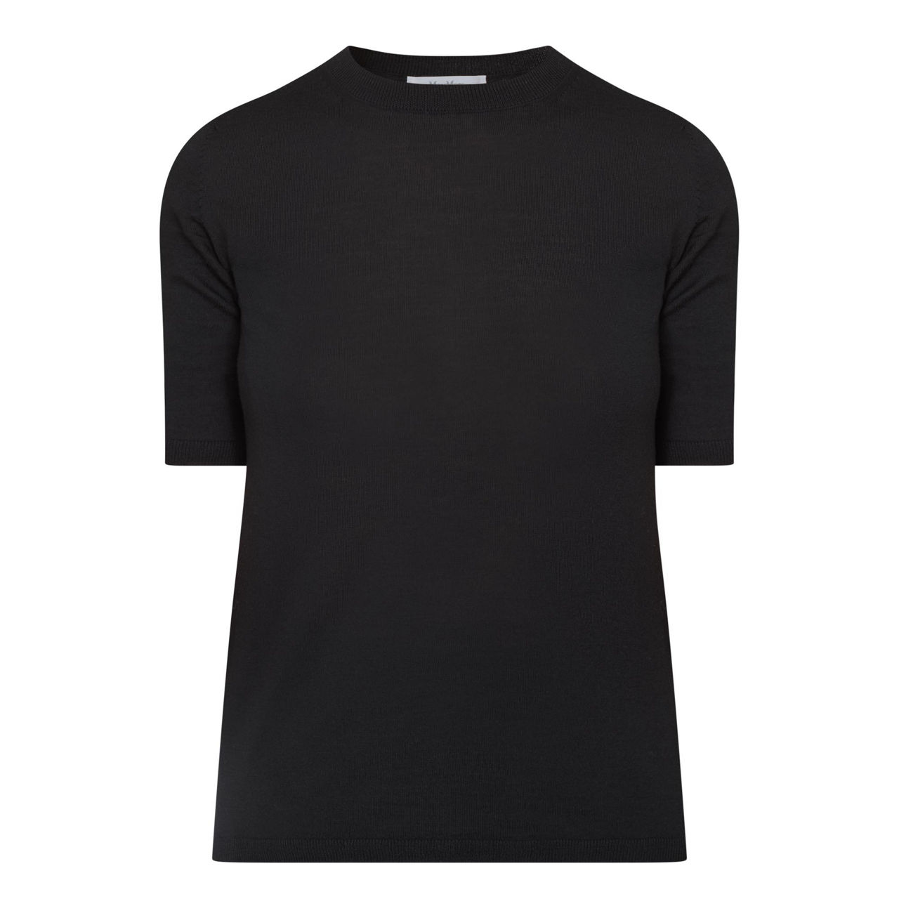 - Round neckline, short sleeves, ribbed trims, straight hemline, fine knit structure