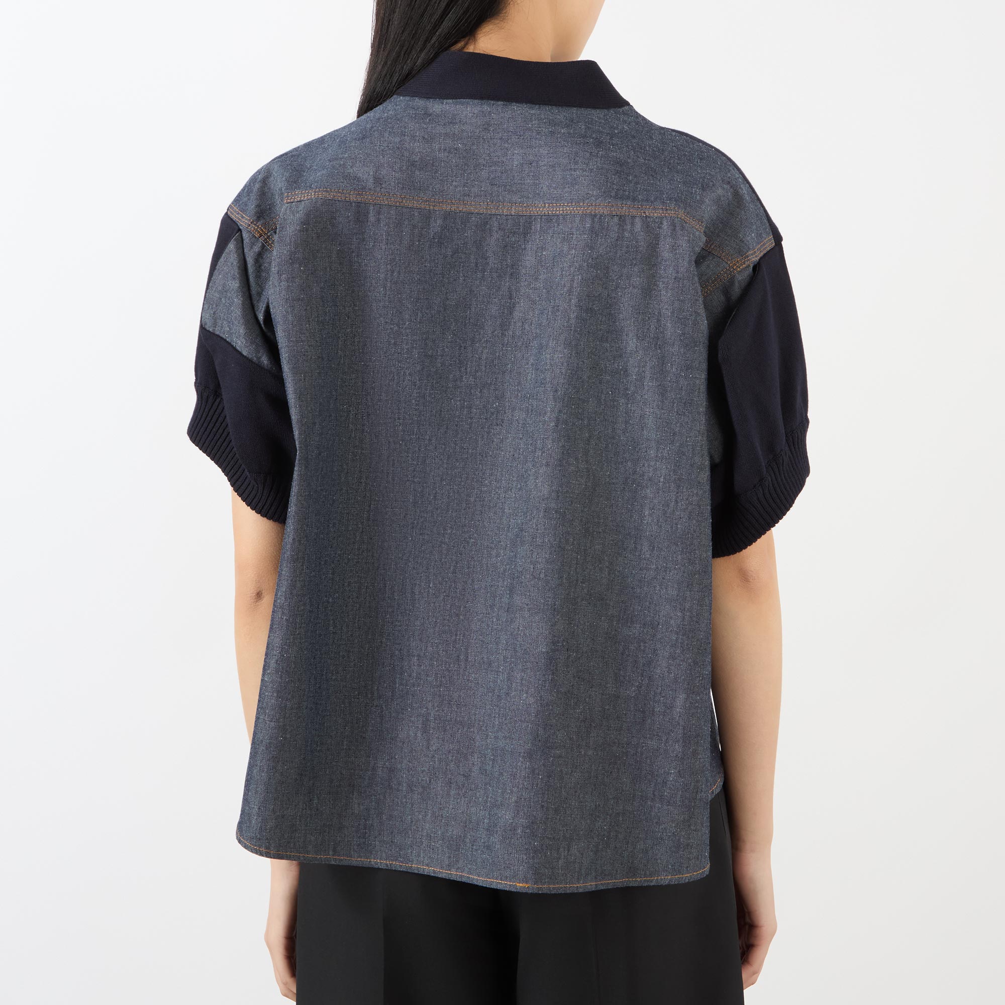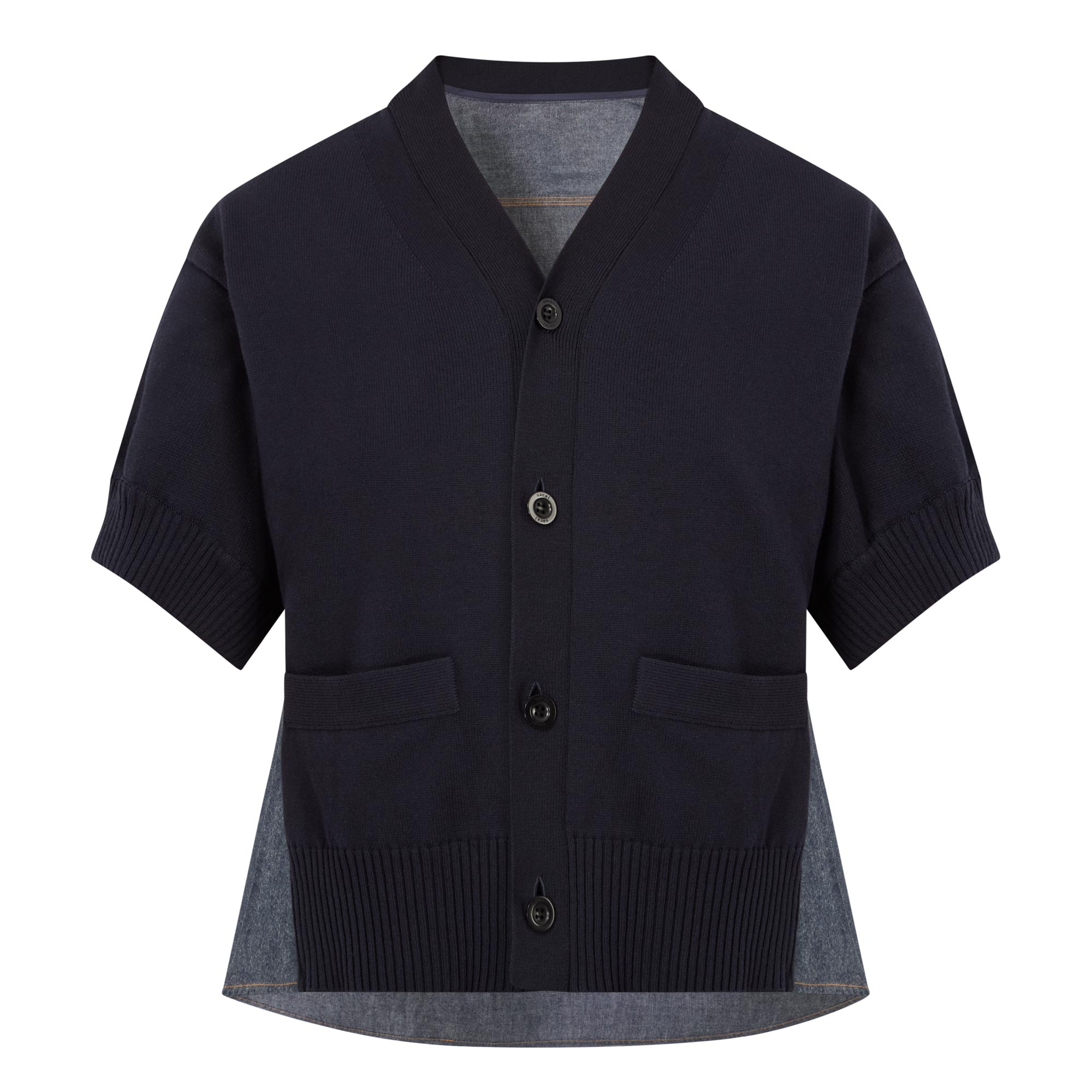 - V-neckline, short sleeves, button fastening, patch pockets, knit front, ribbed trims, denim panel to the back