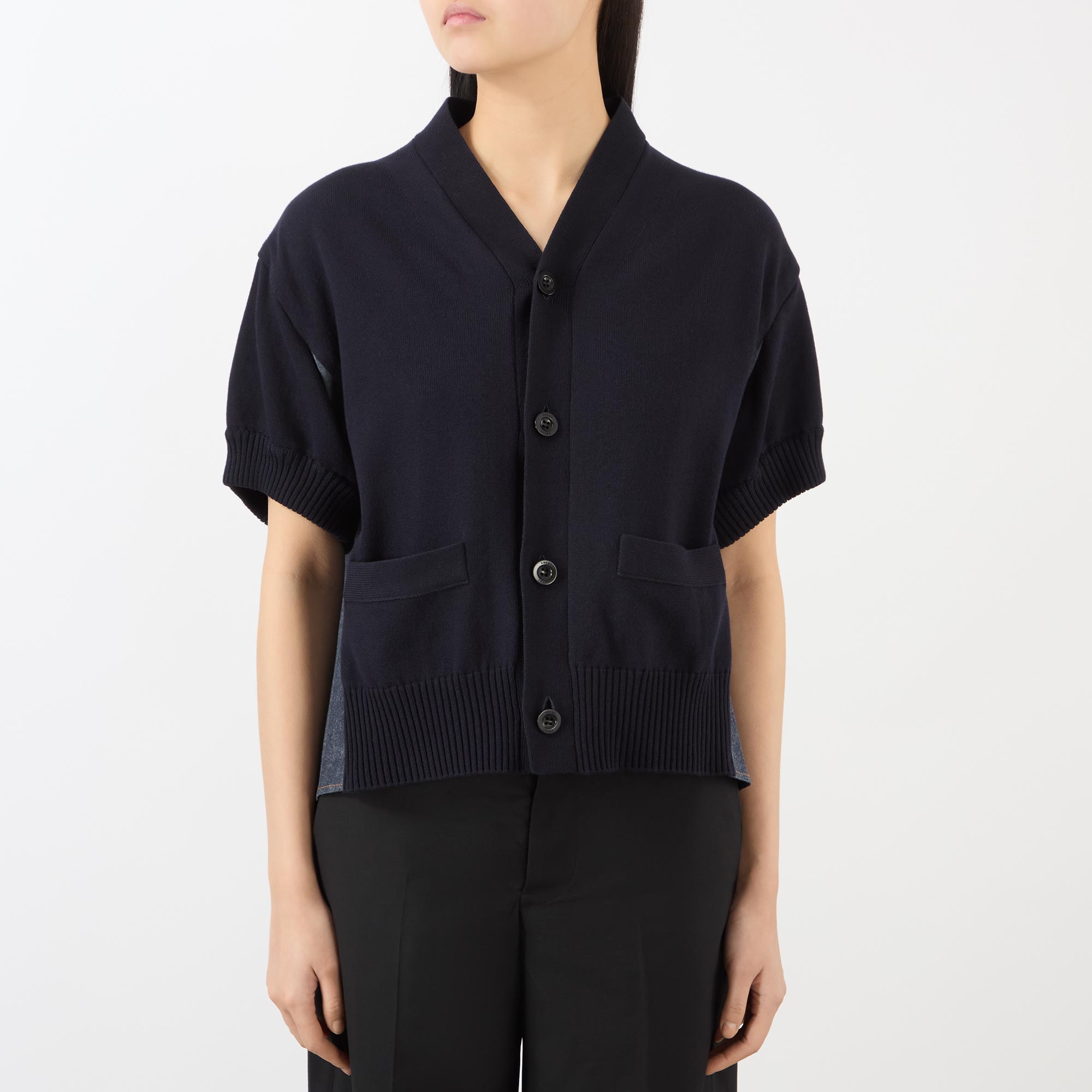 Sacai splices fabrics together to reimagine classic silhouettes across the SS26 collection, seen in the design of this cardigan. Featuring a V-neckline and button fastening, the knit front is contrasted by the denim back panel, finished with pockets.