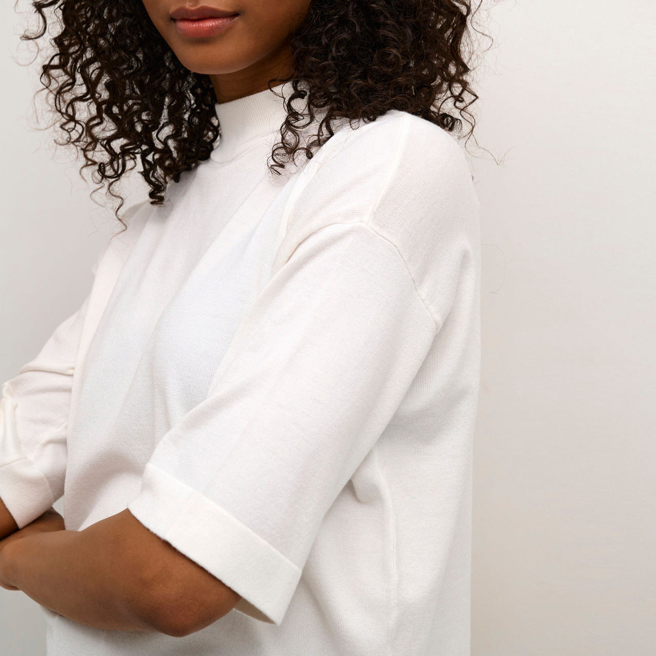 - Ribbed turtleneck, drop shoulders, soft and tight knit fabric, three-quarter-length sleeves