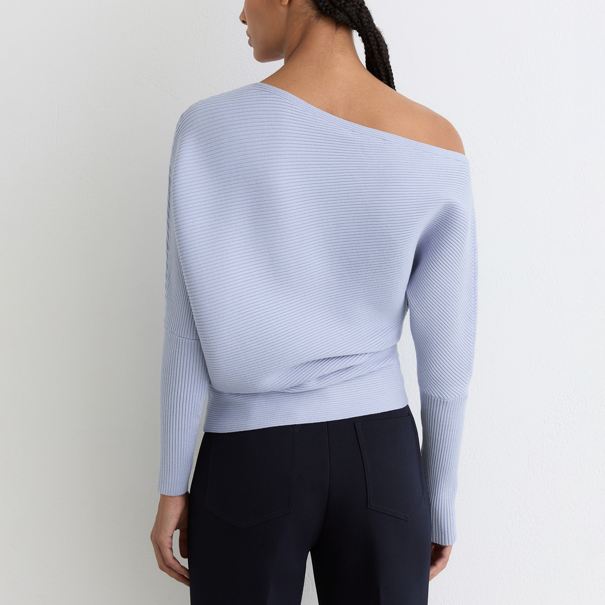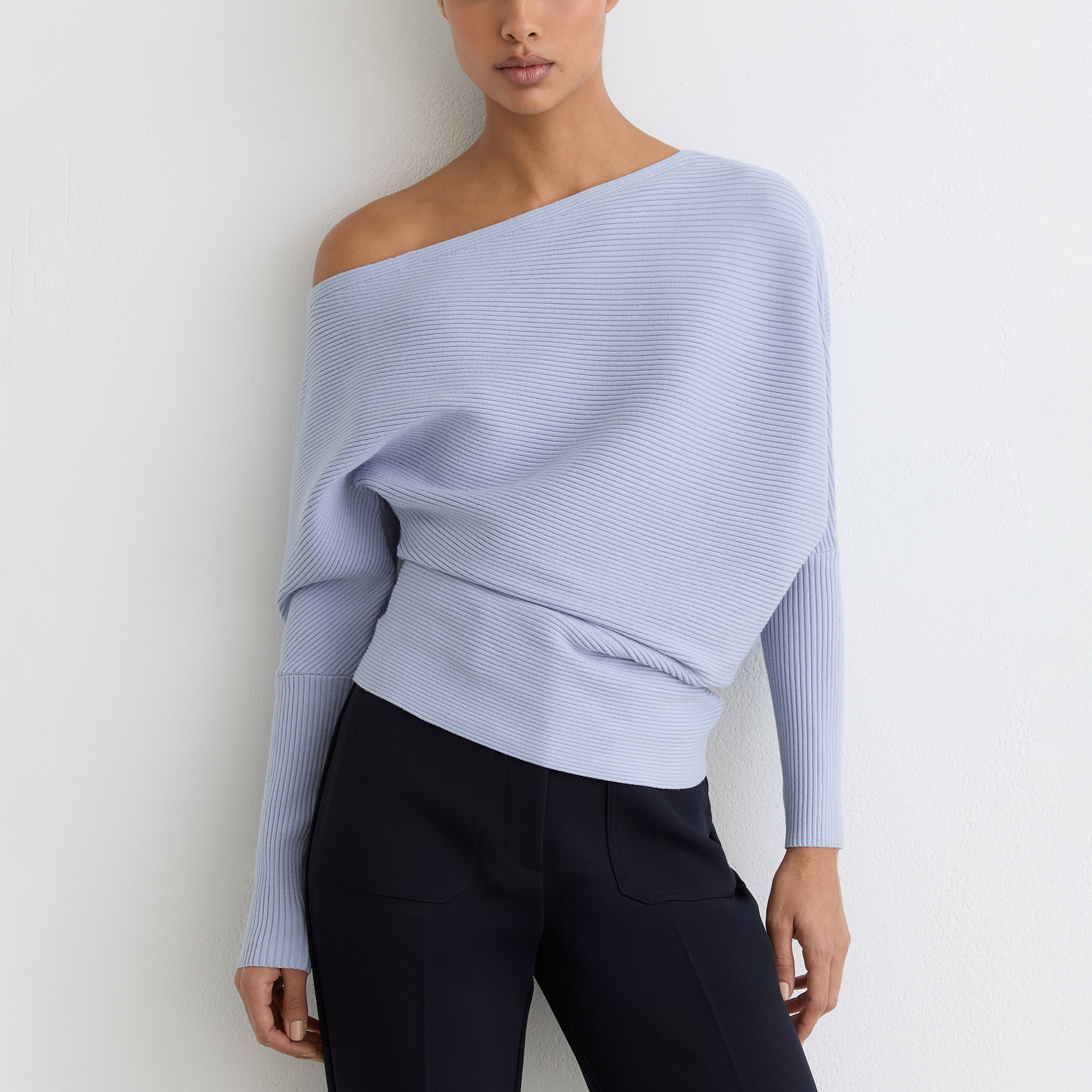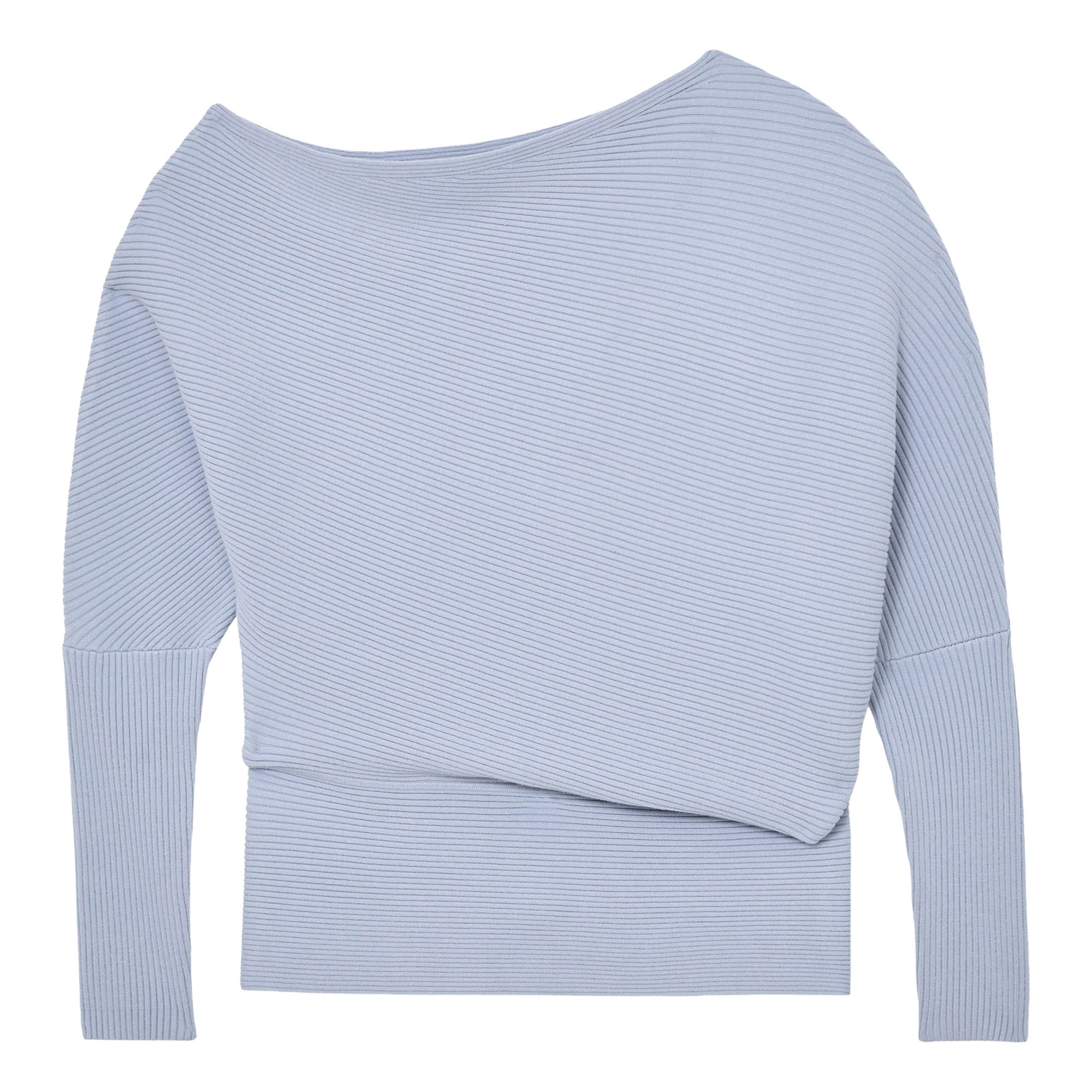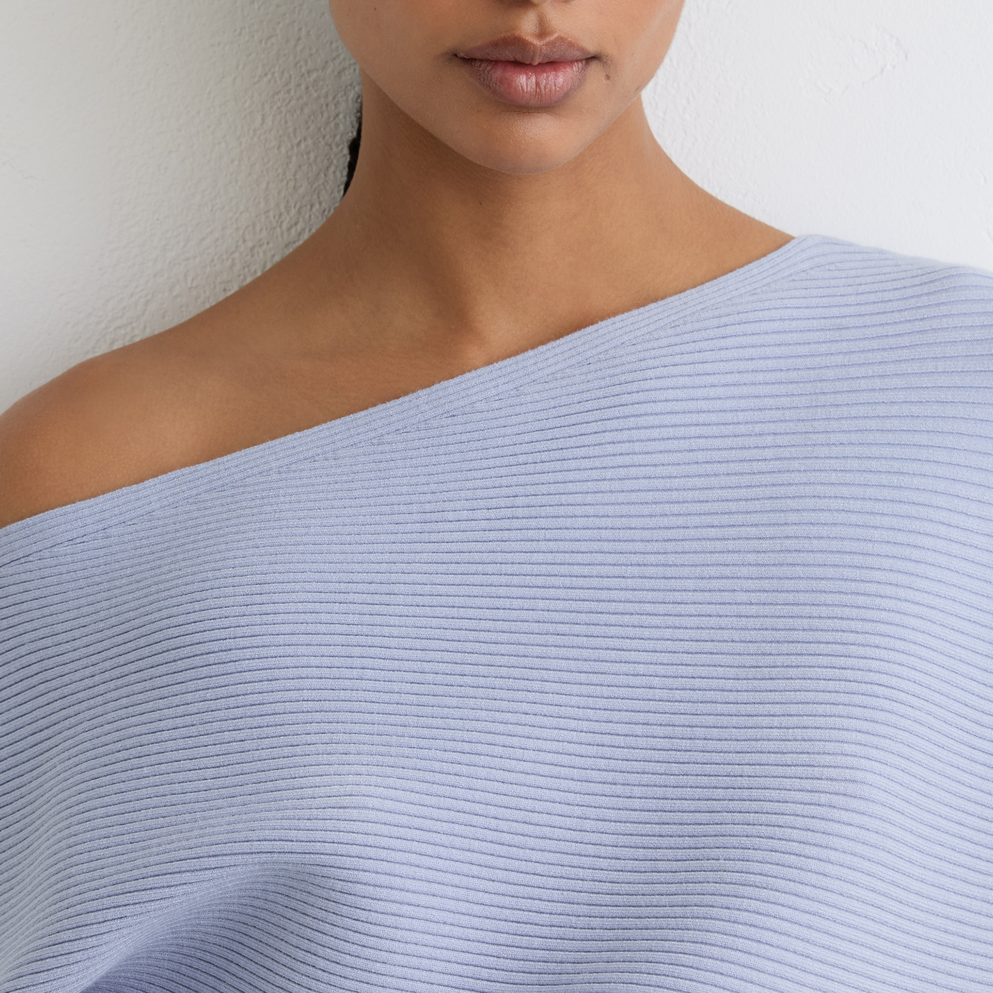- Ribbed, asymmetric draped neckline, slim-fit sleeves and waistline