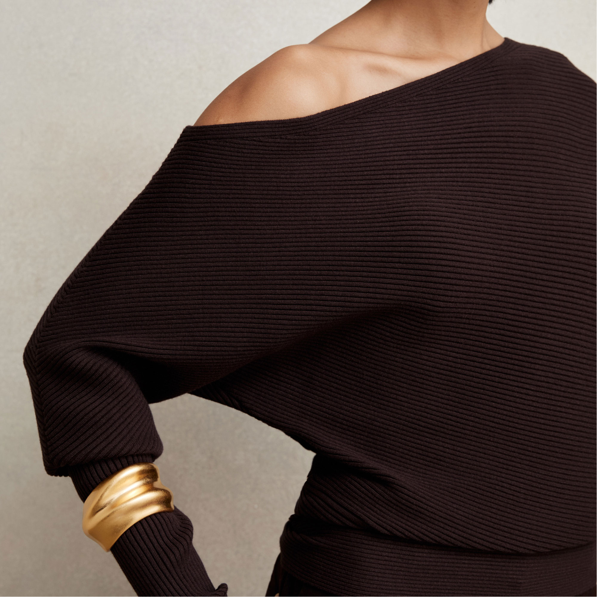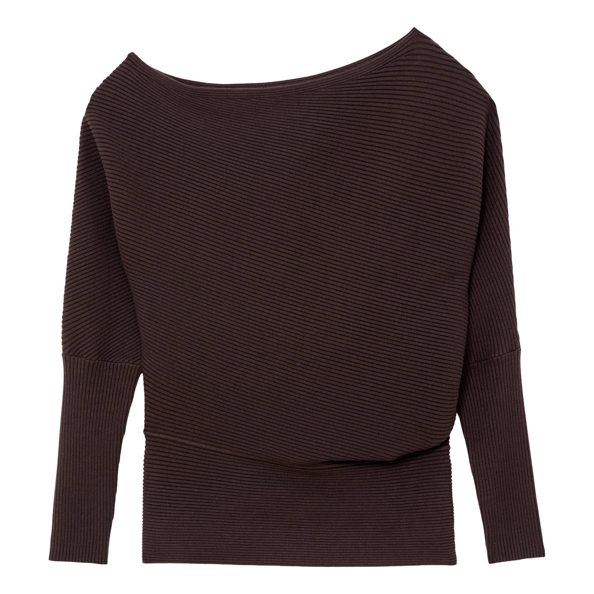 - Ribbed, asymmetric draped neckline, slim-fit sleeves, fitted waistline