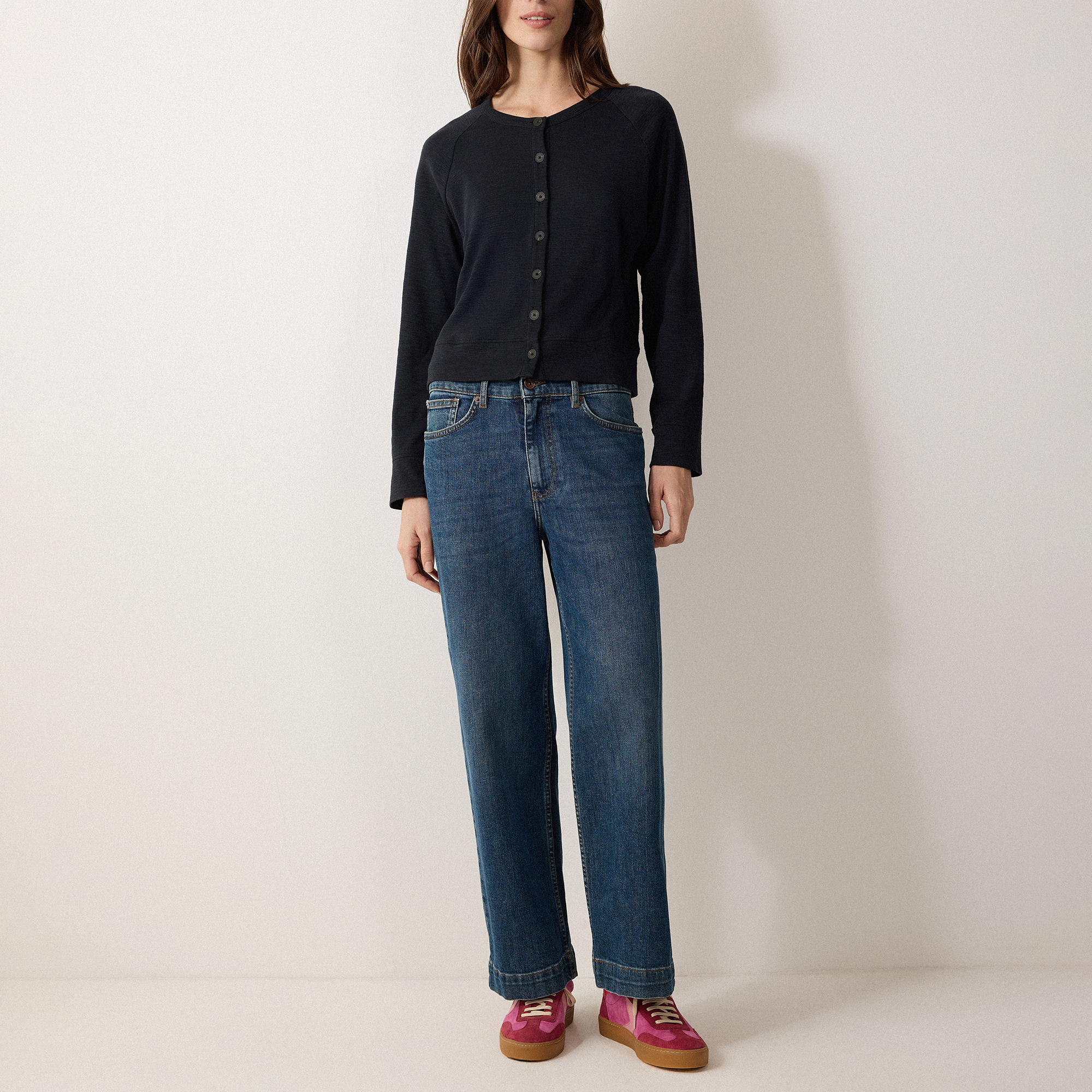 - Slub jersey, crew neckline, long sleeves, straight hemline, button fastenings