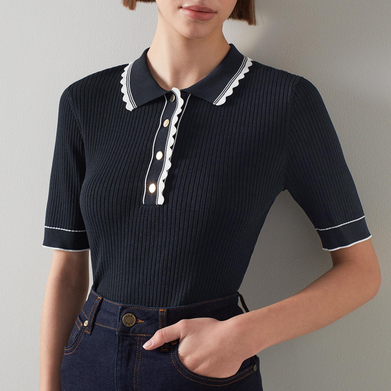 - Short sleeve, collar, button placket, stretch fabric, contrast scallop trims