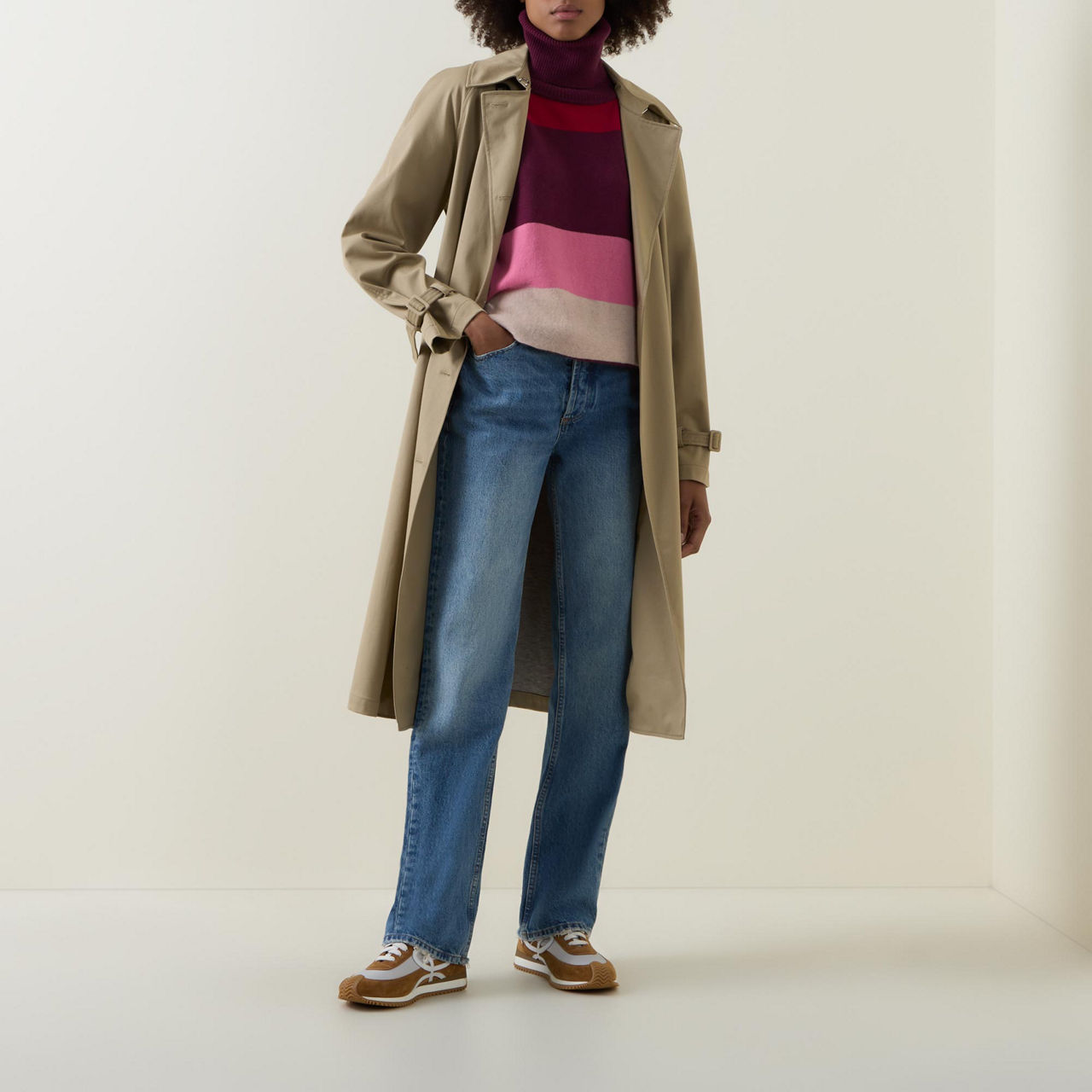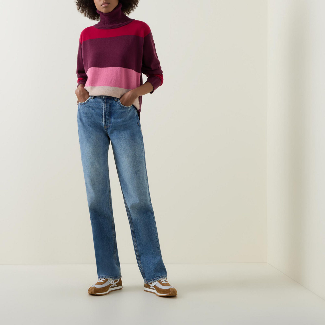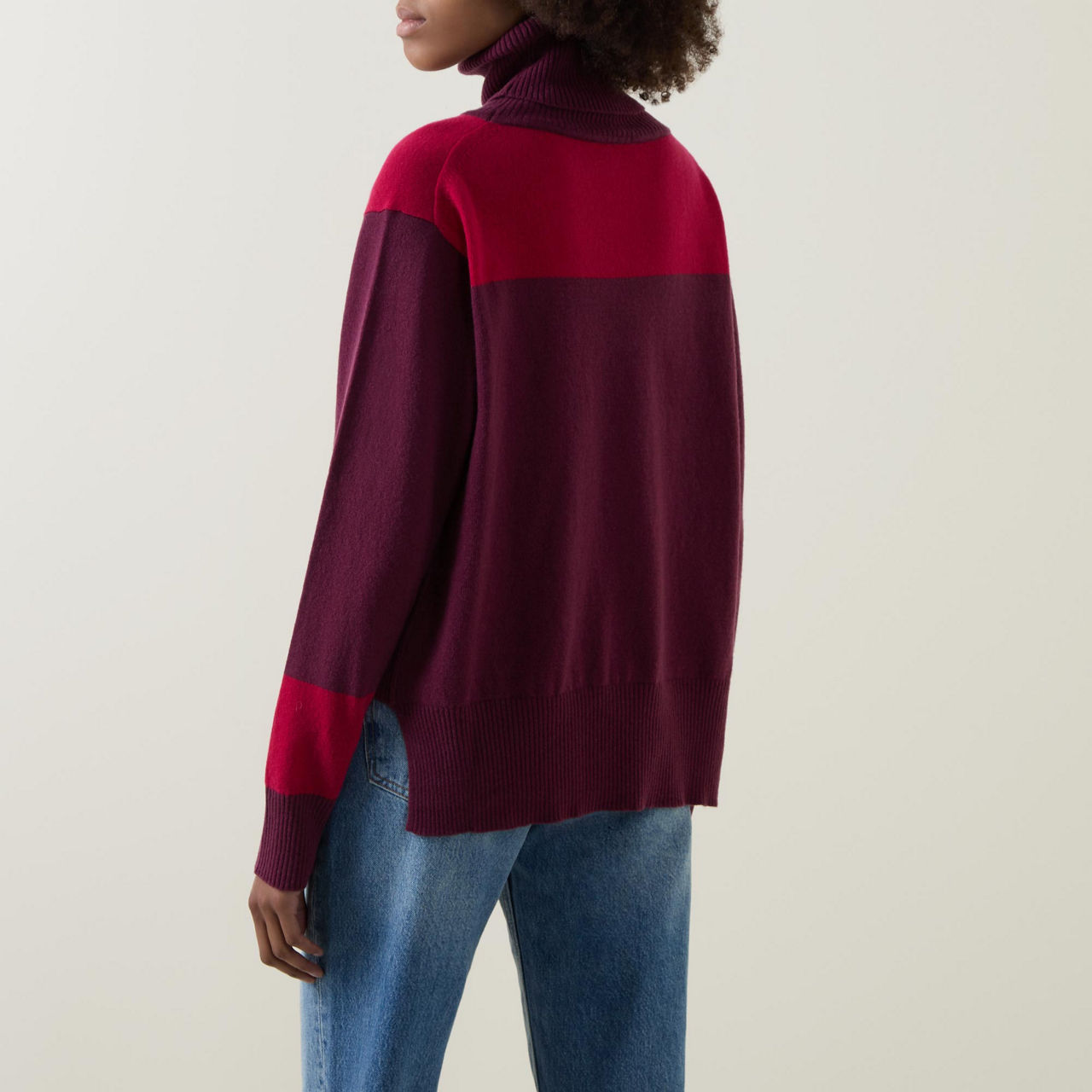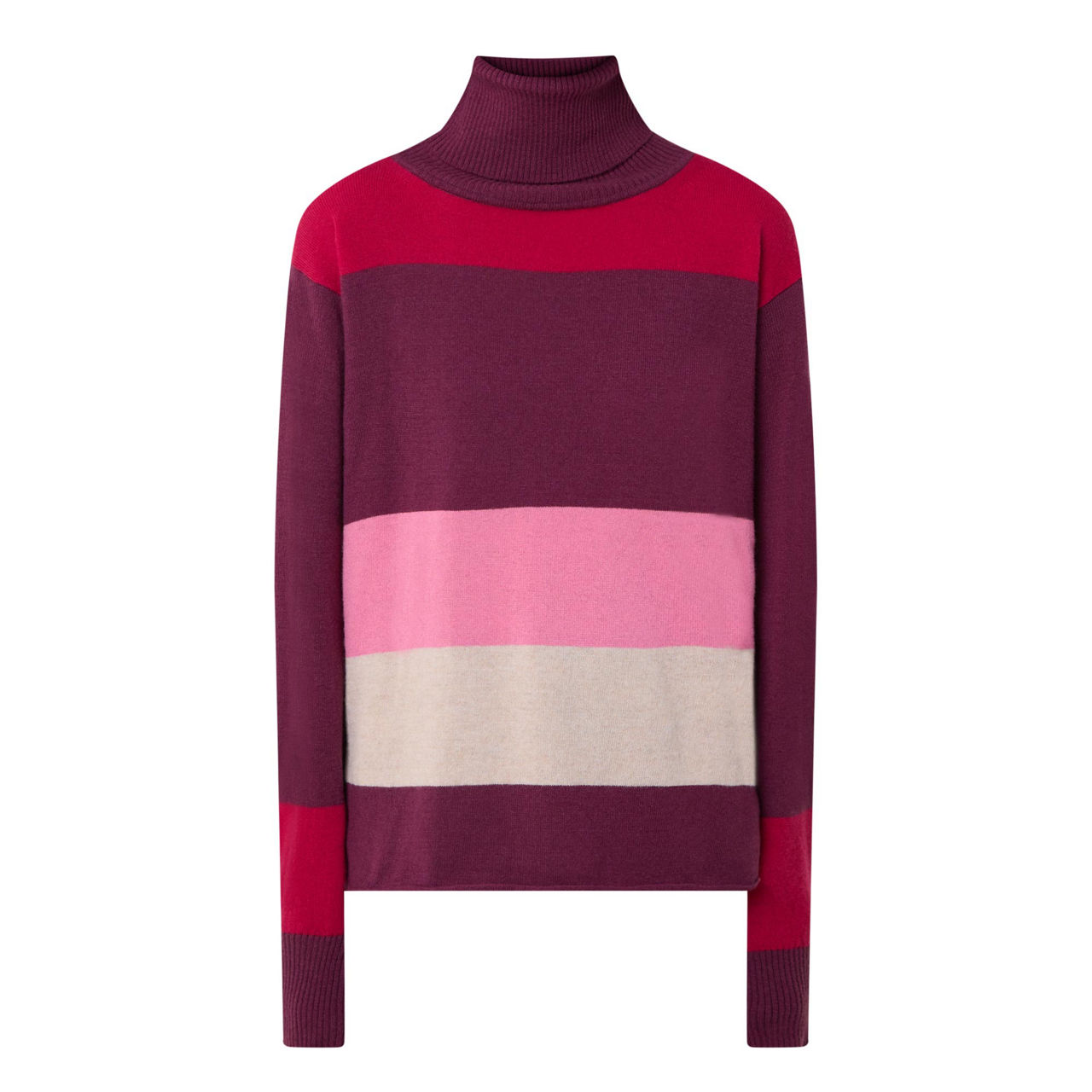 - Turtle neckline, long sleeves, dropped shoulders, striped pattern, ribbed trims, knitted finish