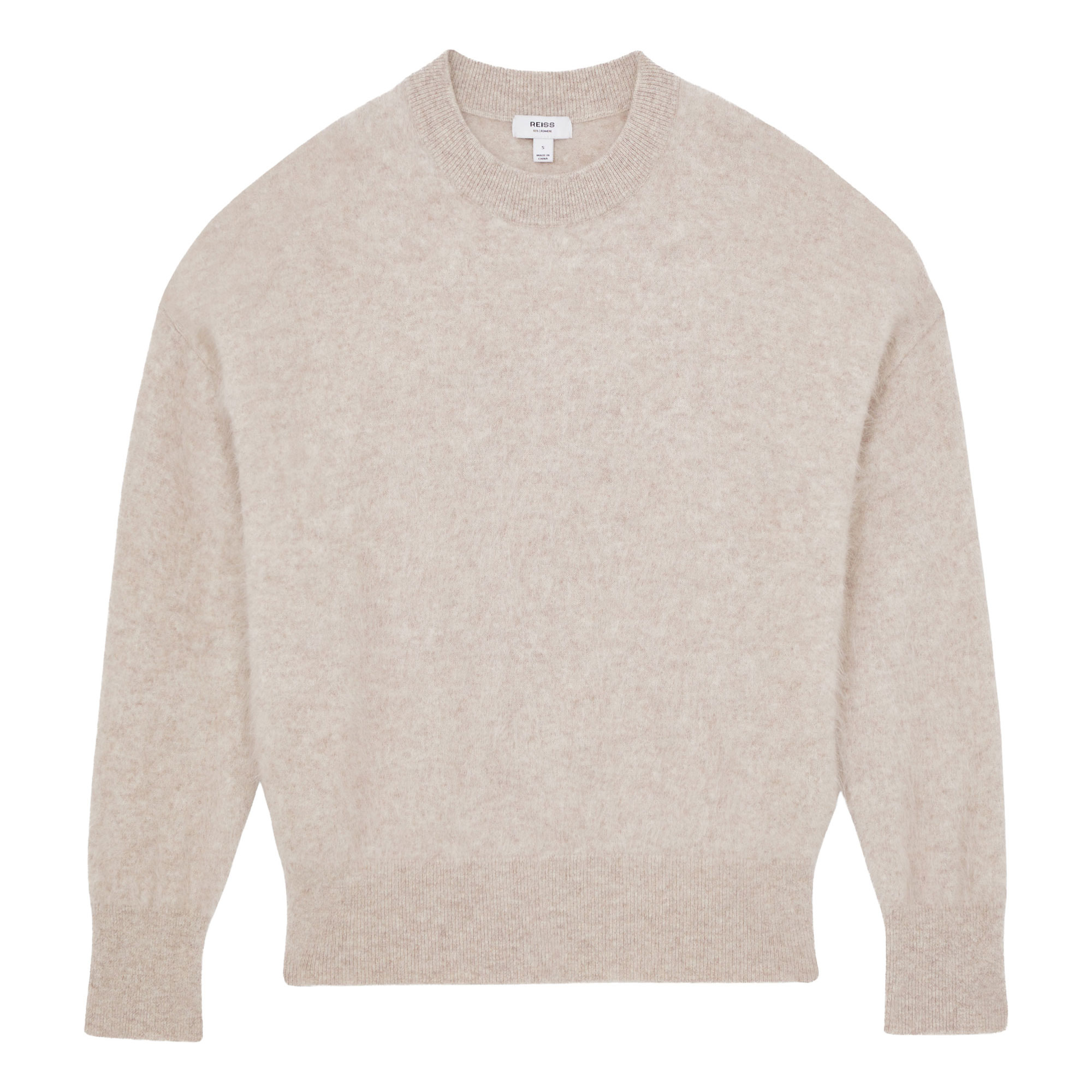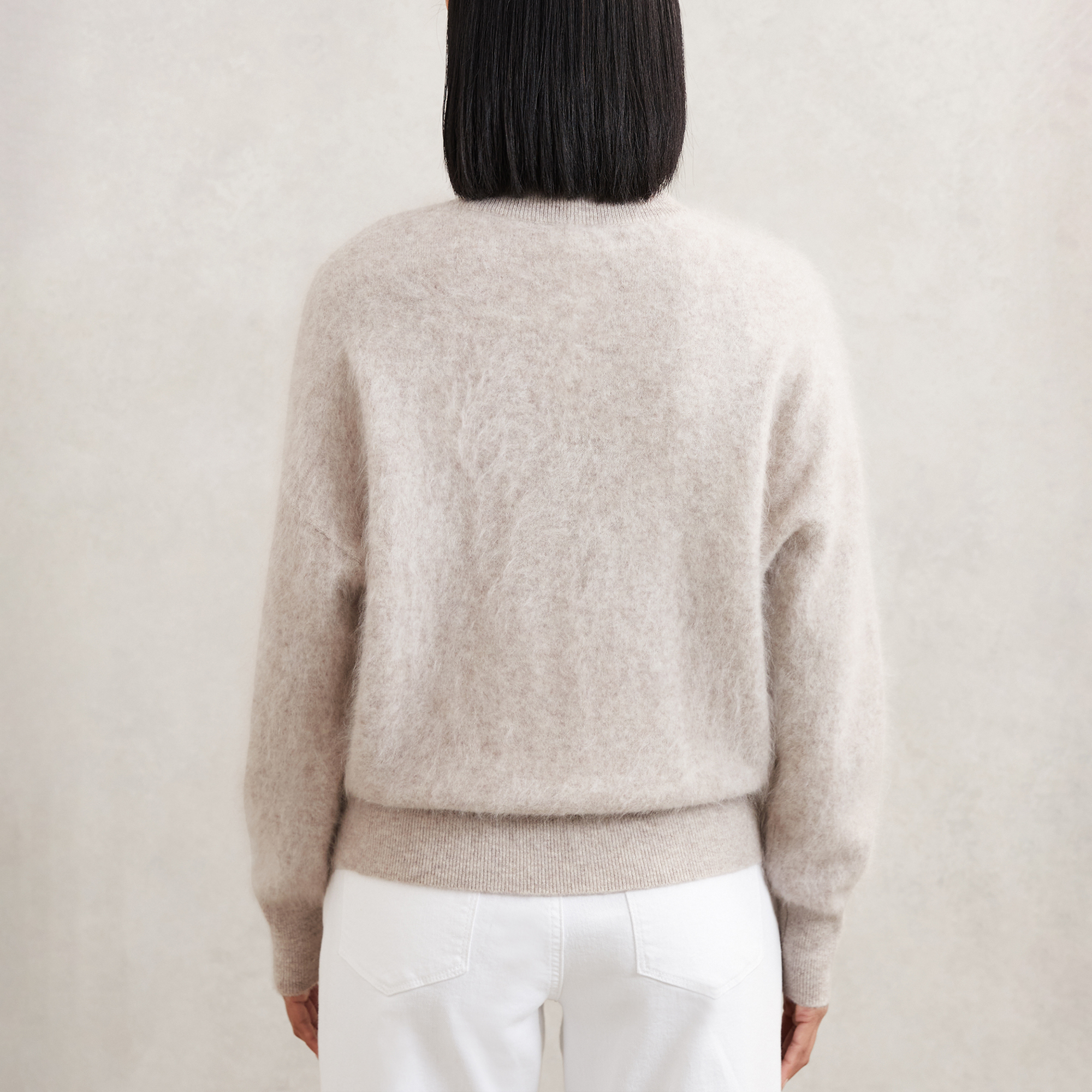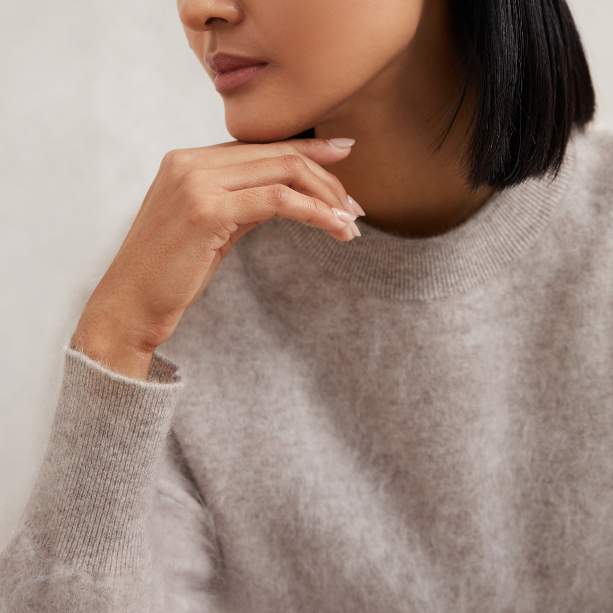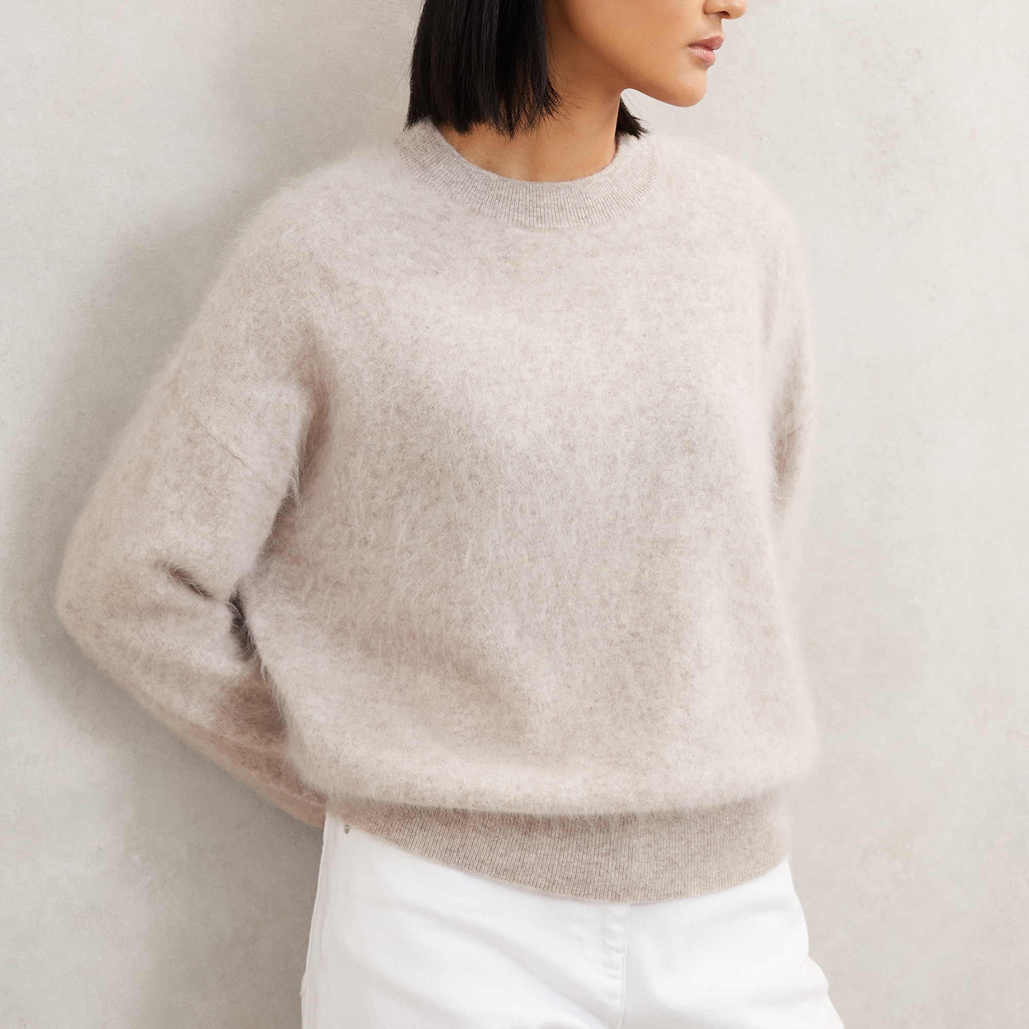 - Brushed cashmere, crew neckline, long sleeves, ribbed trims