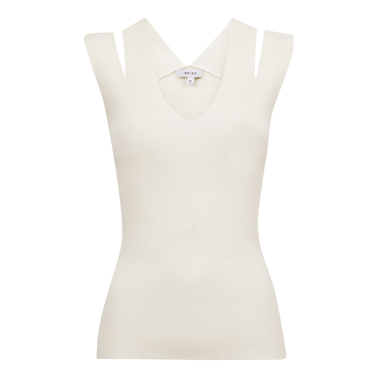 - Knitted construction, ribbed fabrication, plunge neckline, sleeveless, cut-out detailing to shoulders, fitted