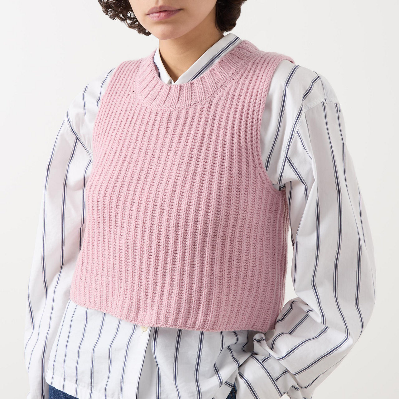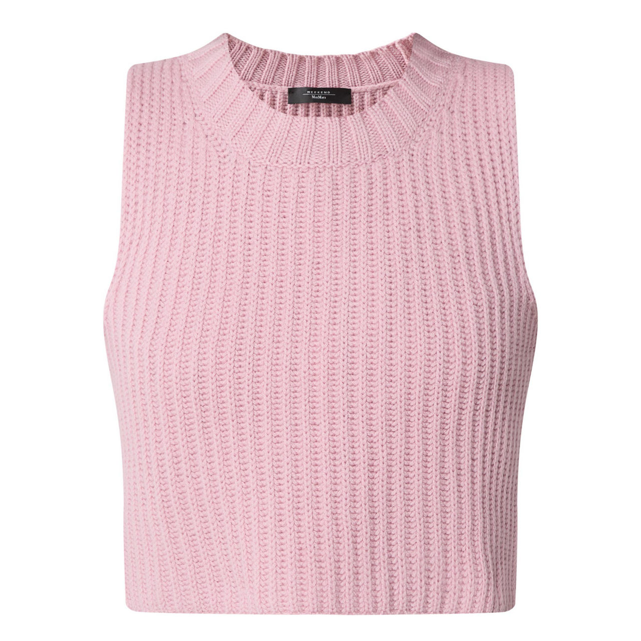 - Rib knit, sleeveless, cropped length, crew neck
