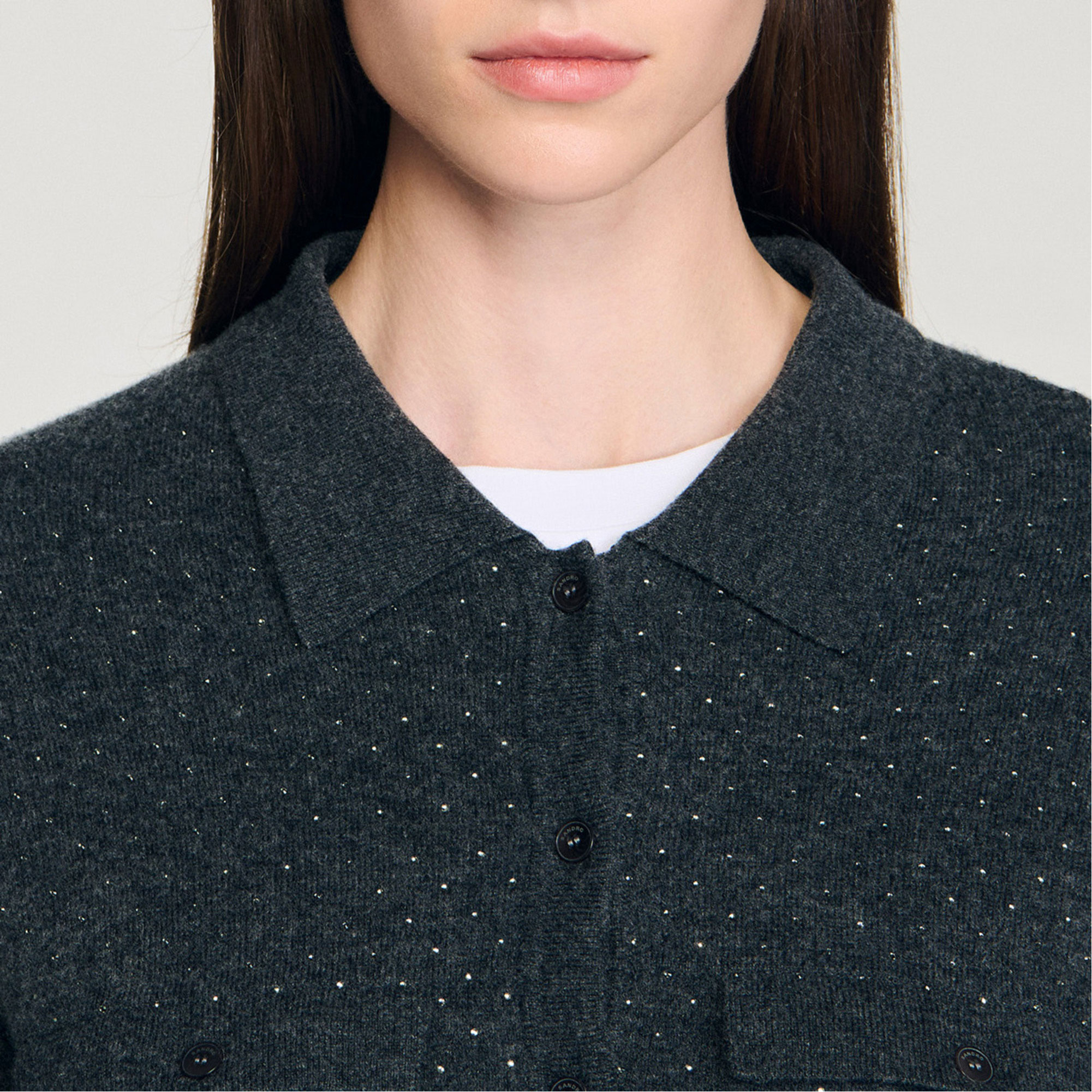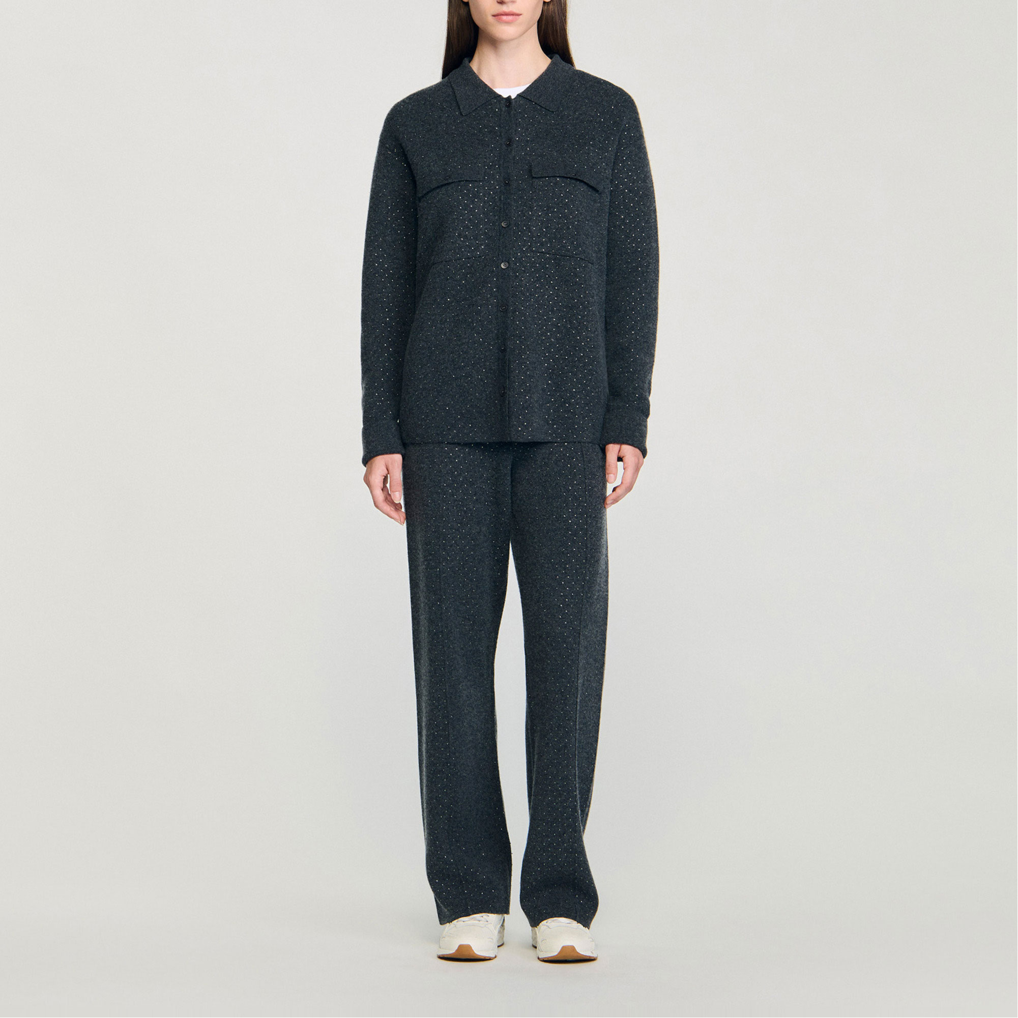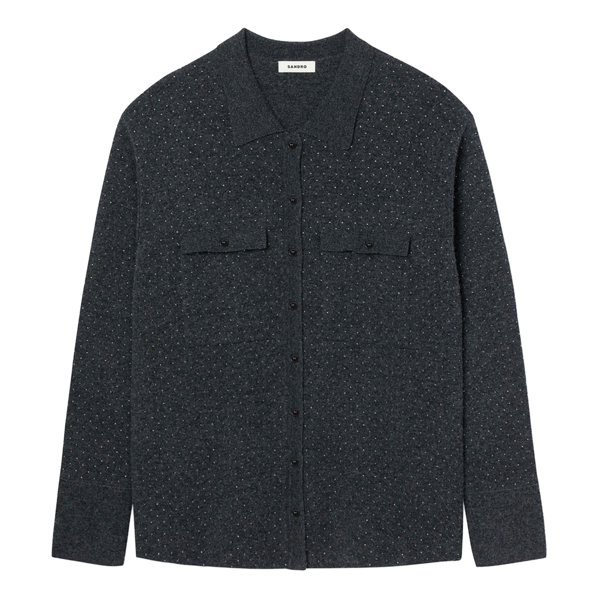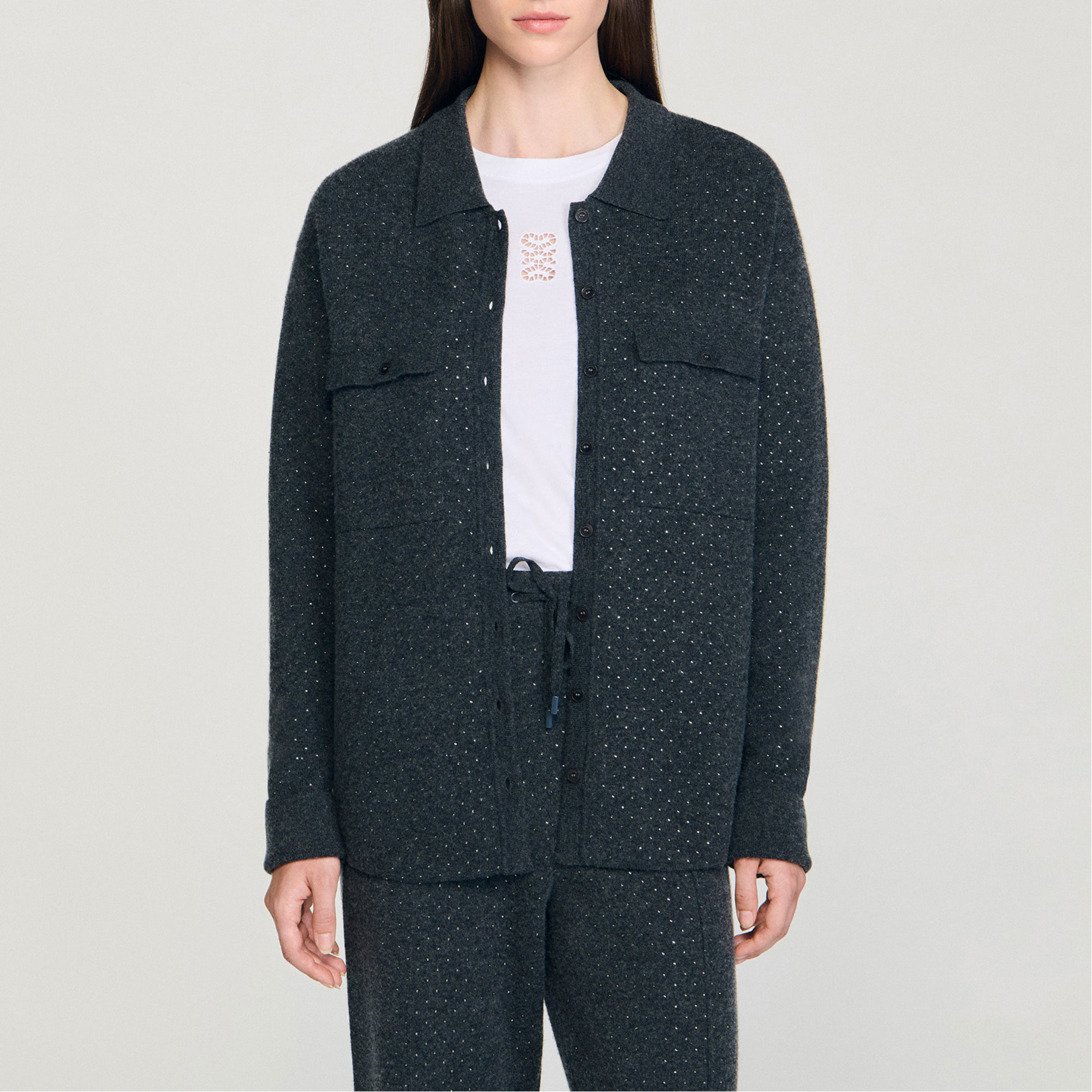 - Long shirt-style cardigan, rhinestone embellishment, shirt collar, long sleeves, button placket fastening, buttoned patch pockets on chest