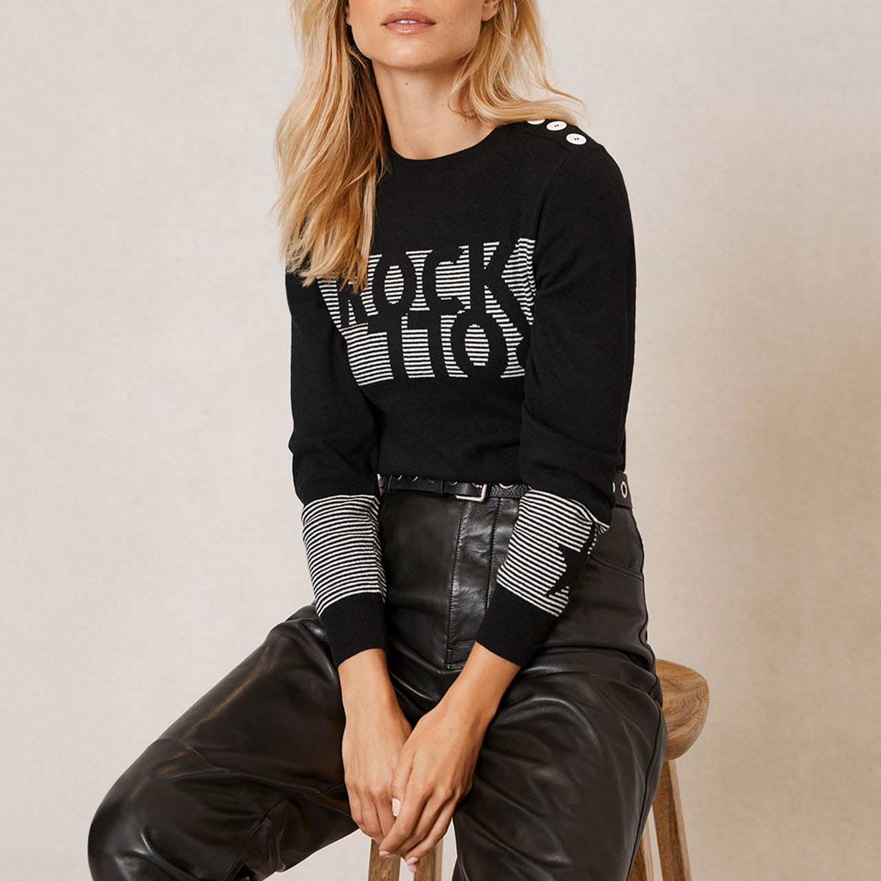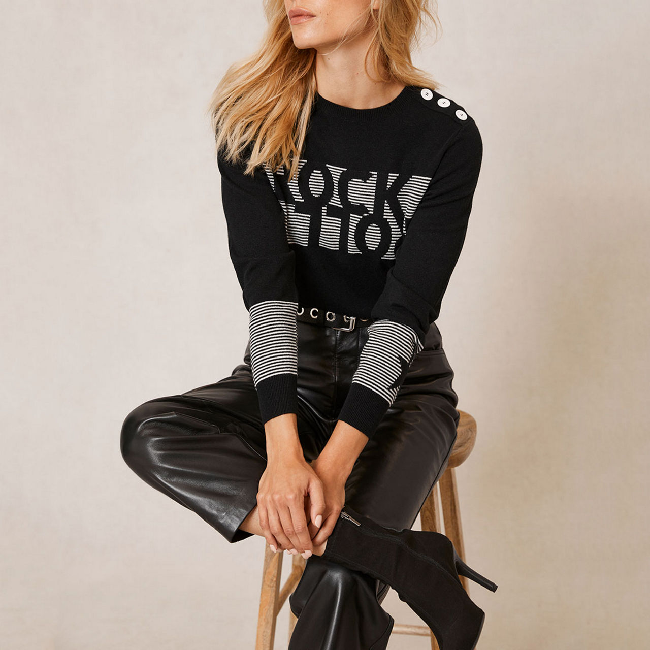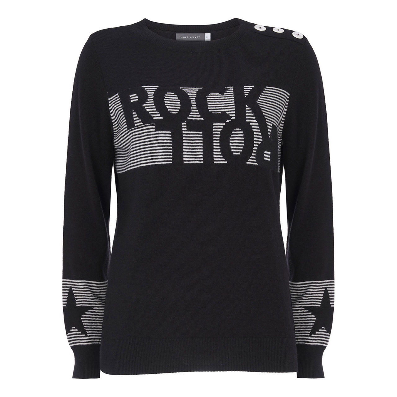 Spun with a hint of cashmere for softness, this black jumper is knitted with a white striped Rock & Roll slogan on the front and Mint Velvet's signature stars on the sleeves for a rock chic look. Style yours with leather trousers and boots for every day.