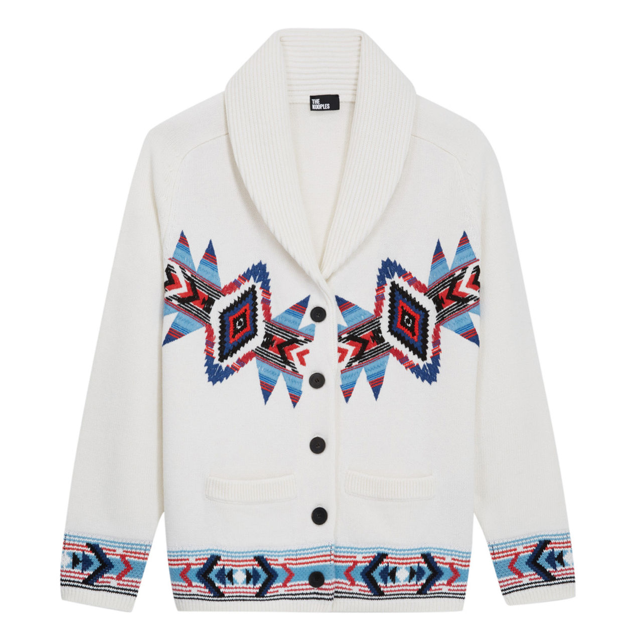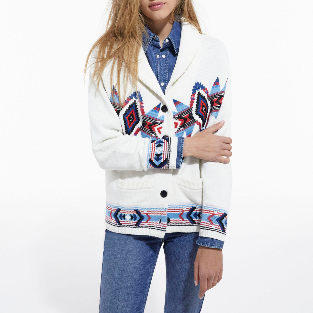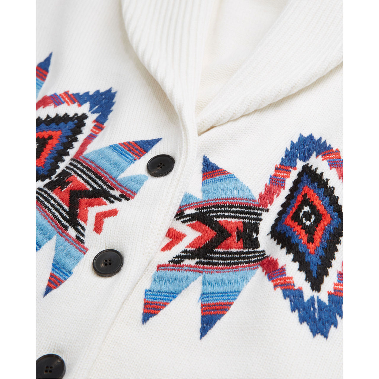 Preppy style is given a cool update by The Kooples with this geometric-patterned shawl collar cardigan. Slip on the straight cut knit with denim and cowboy boots for a classic yet cool look.