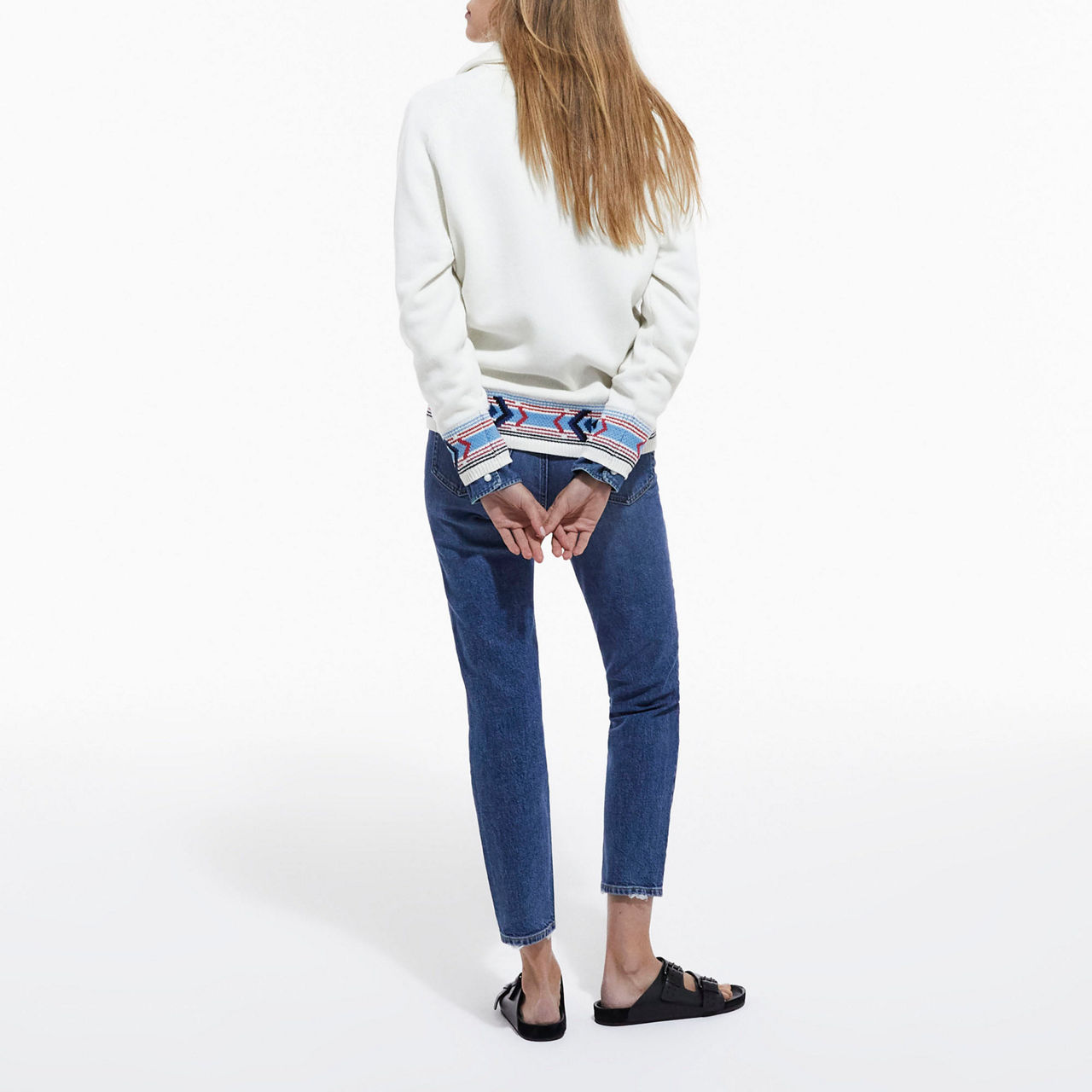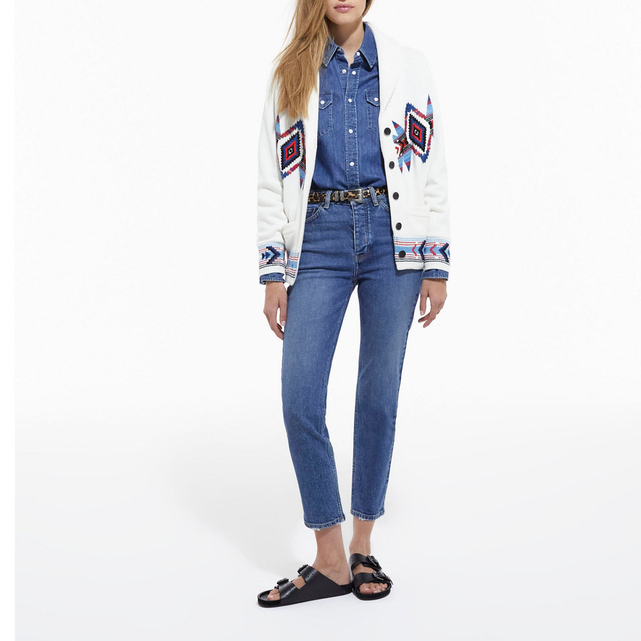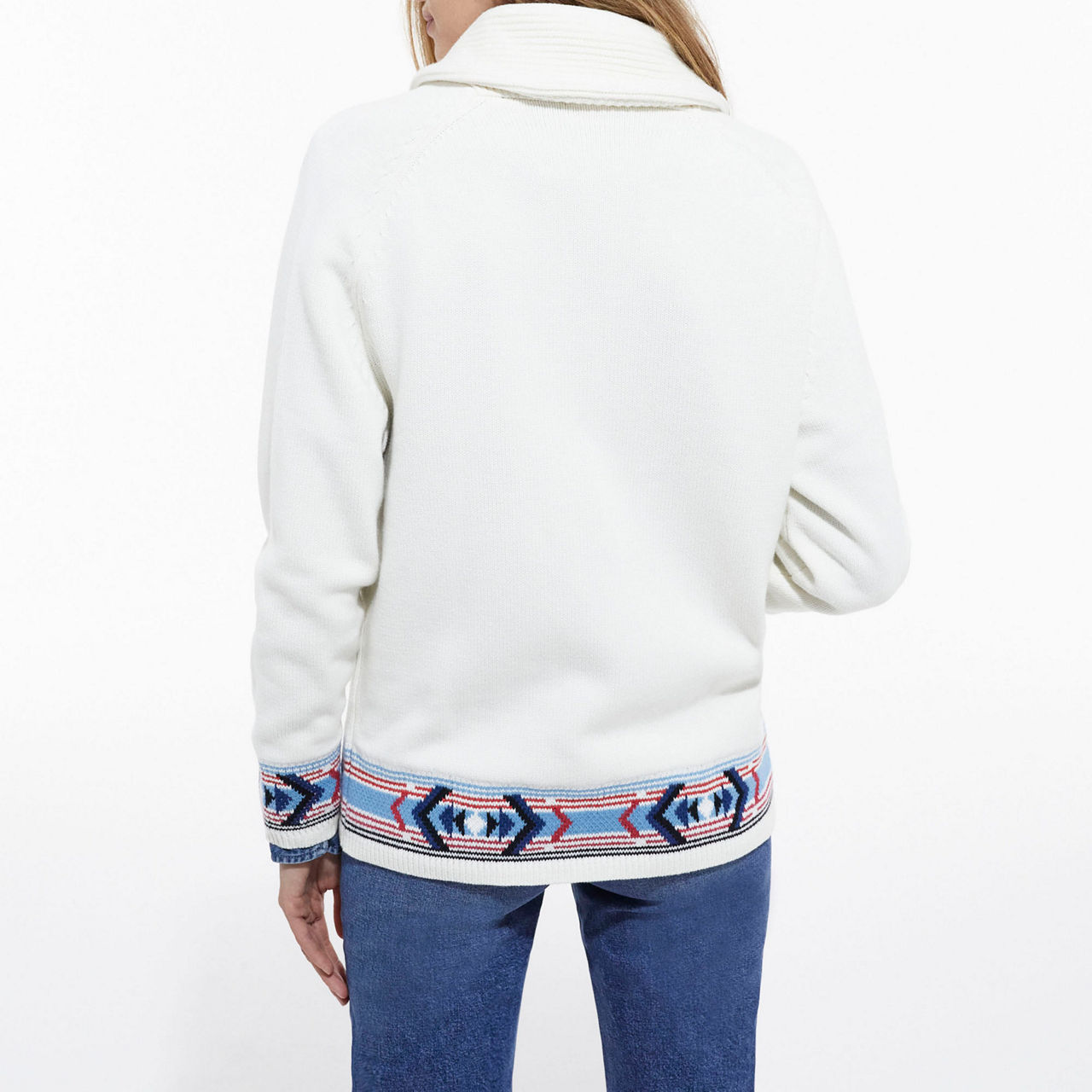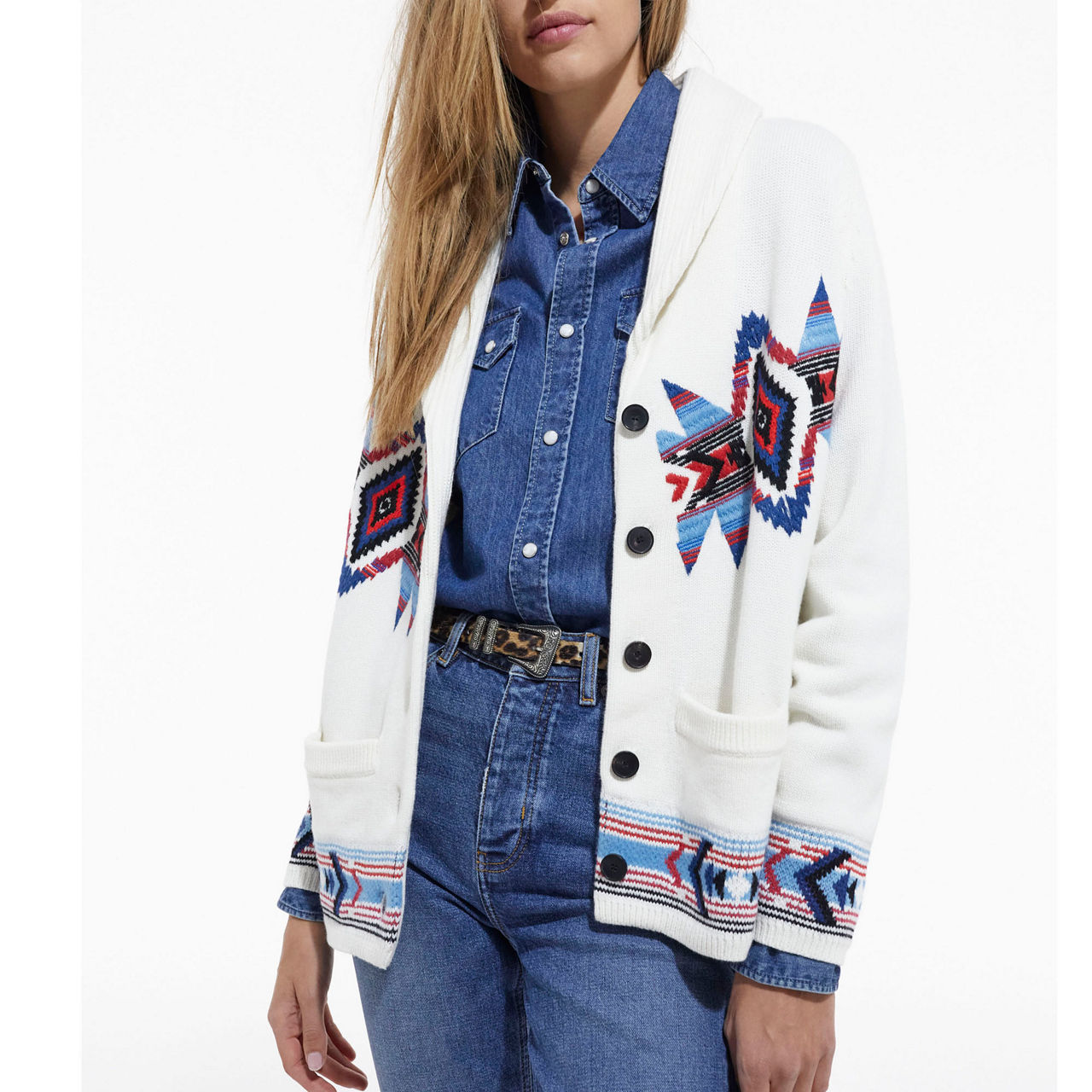 Preppy style is given a cool update by The Kooples with this geometric-patterned shawl collar cardigan. Slip on the straight cut knit with denim and cowboy boots for a classic yet cool look.