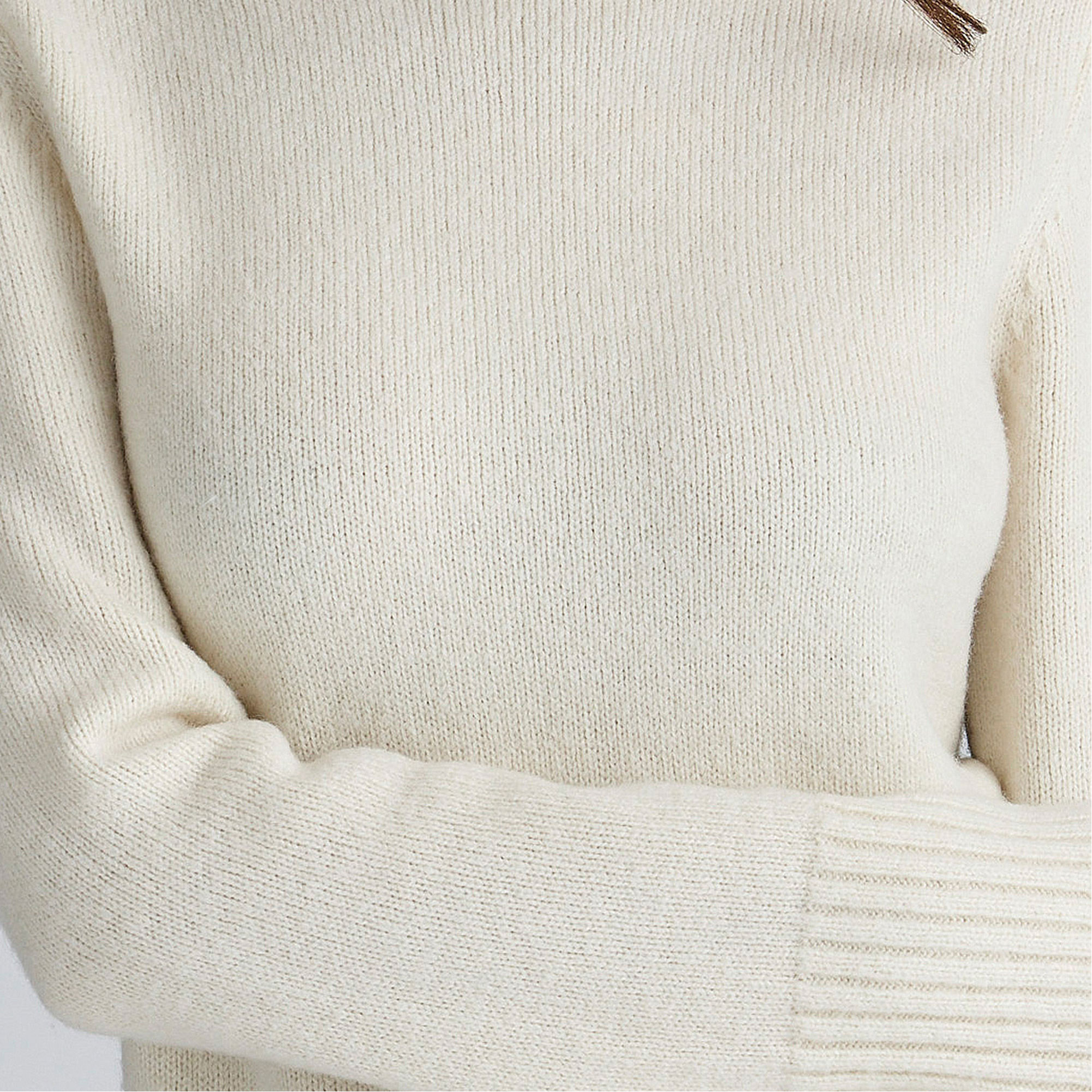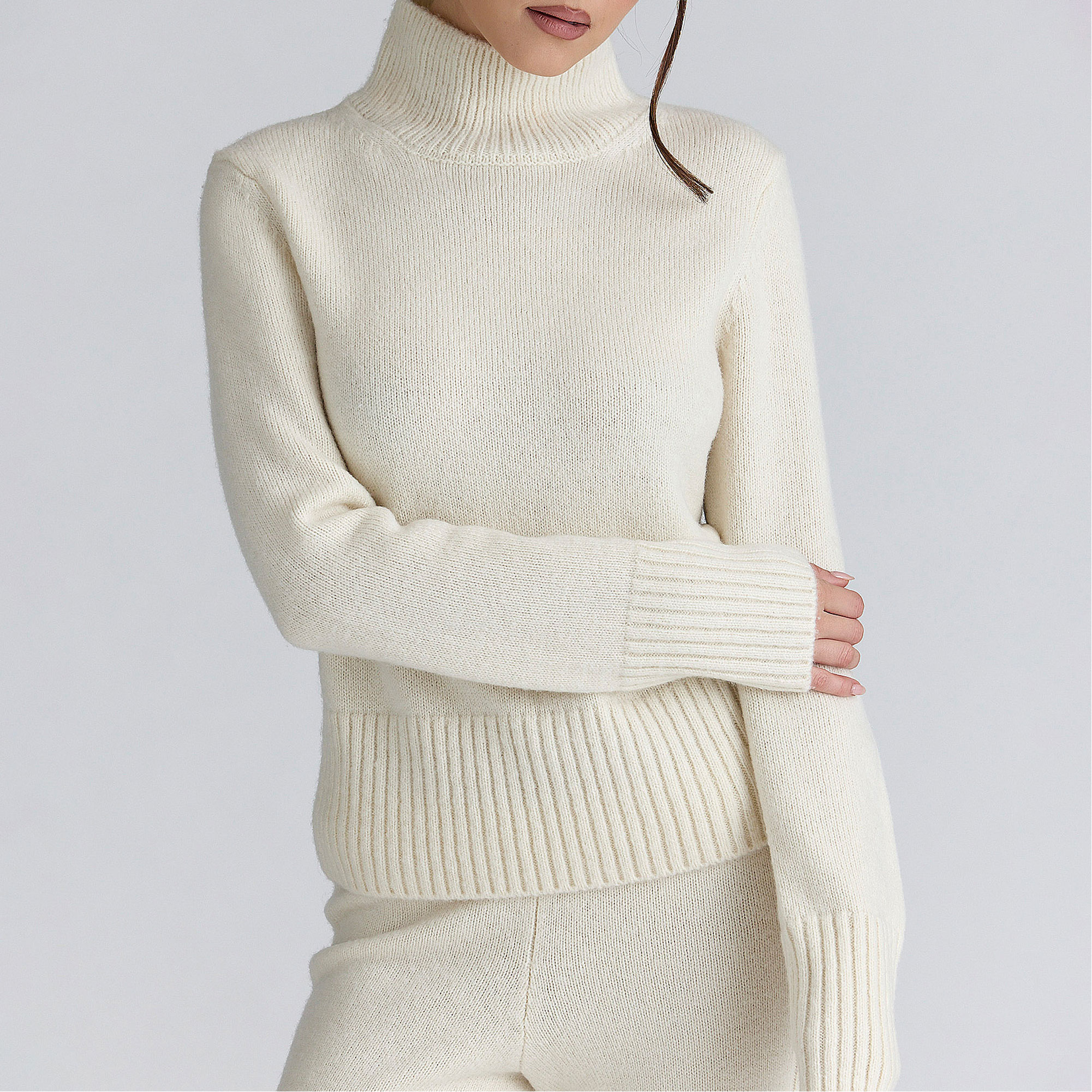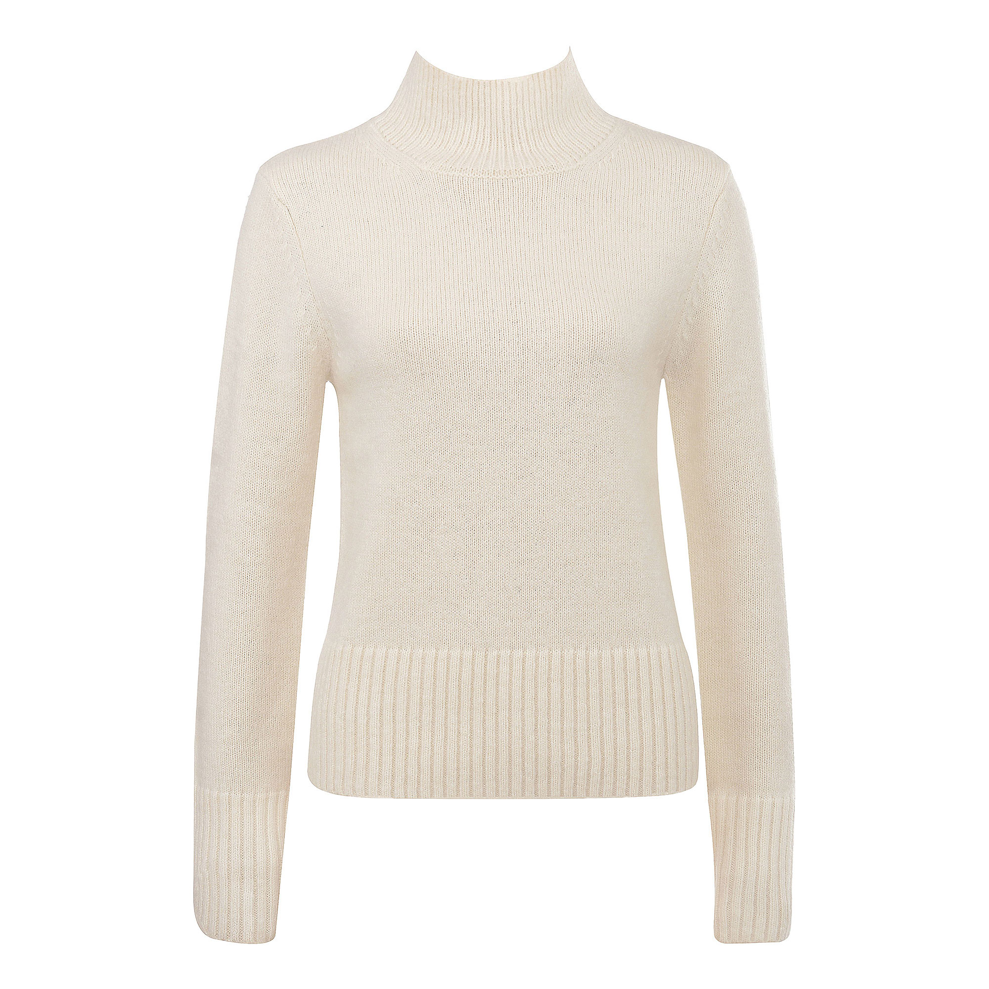 - Long sleeves, fashioned shoulder seams, ribbed hem and cuffs, roll neck