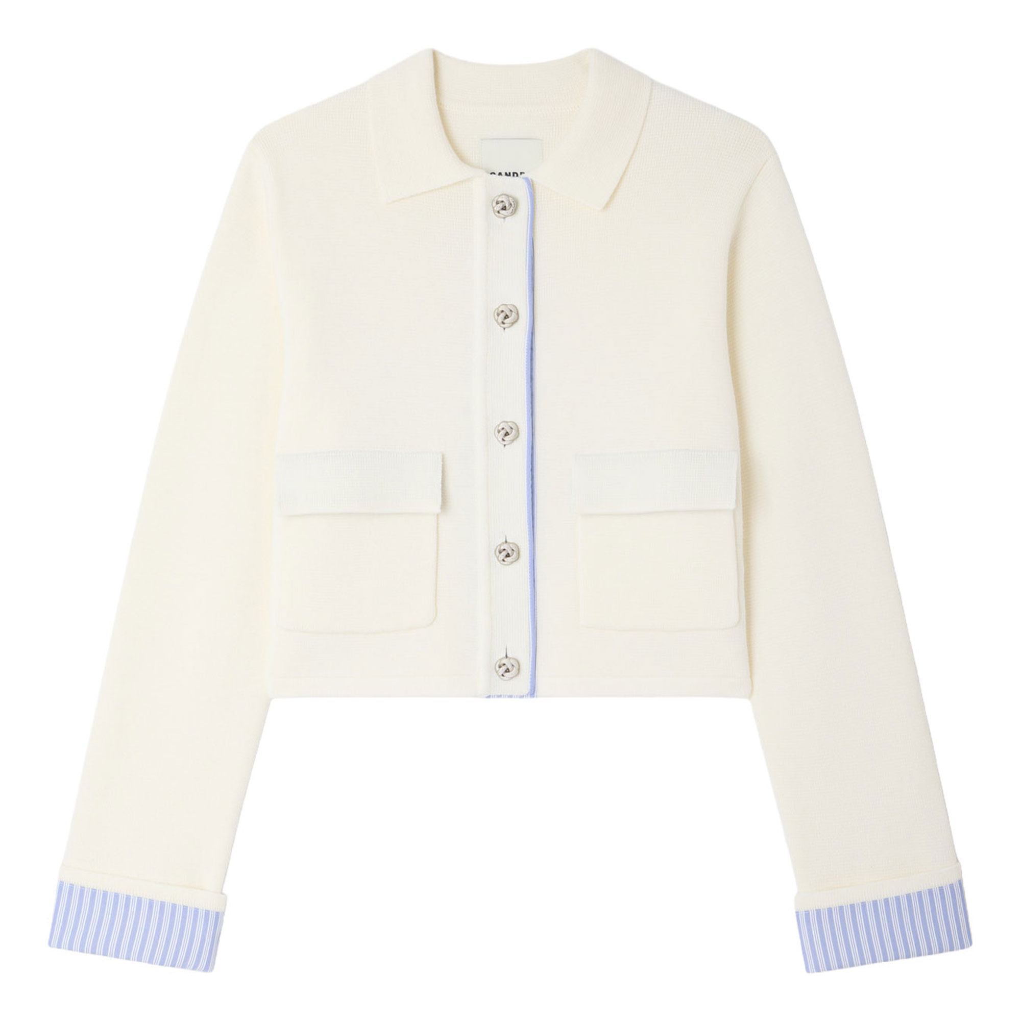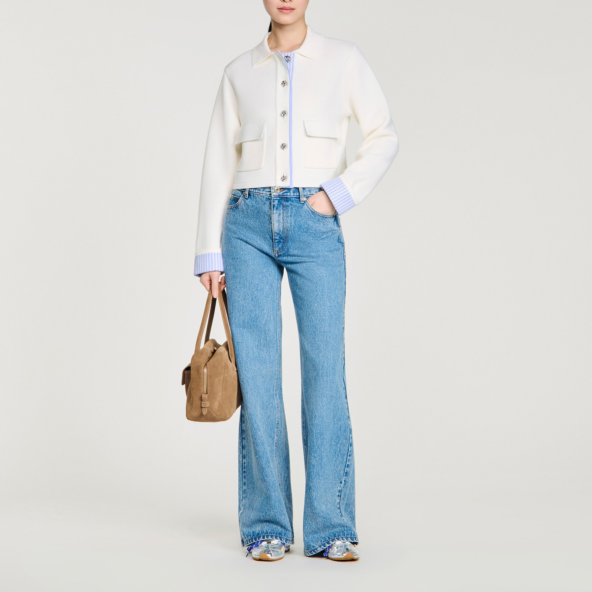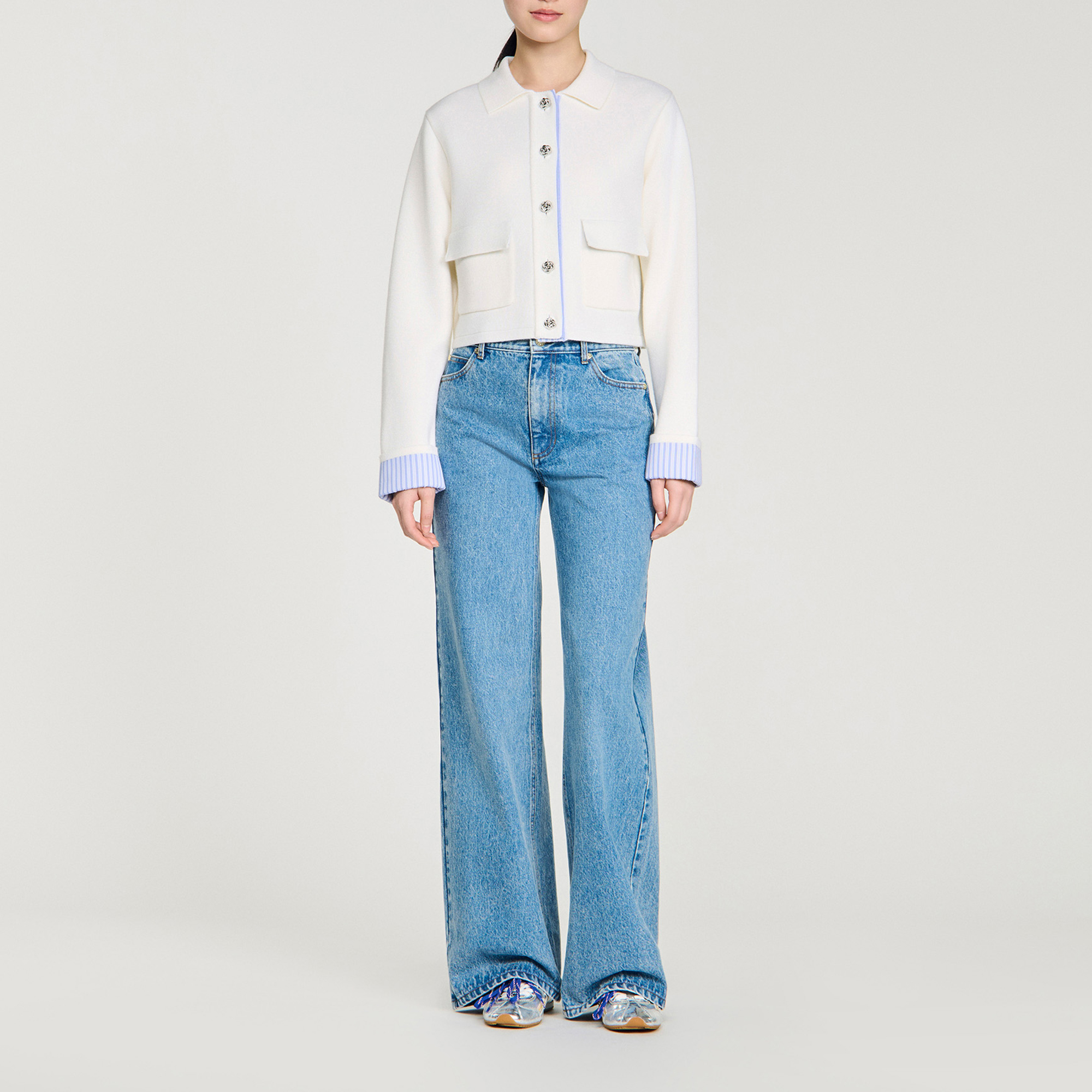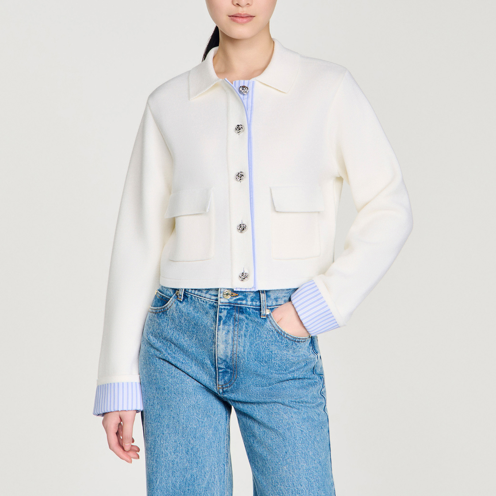 - Straight cut, polo collar, long sleeves, front button fastening with decorative metal buttons, patch pockets with flaps, inner button placket and sleeve cuffs in striped poplin
