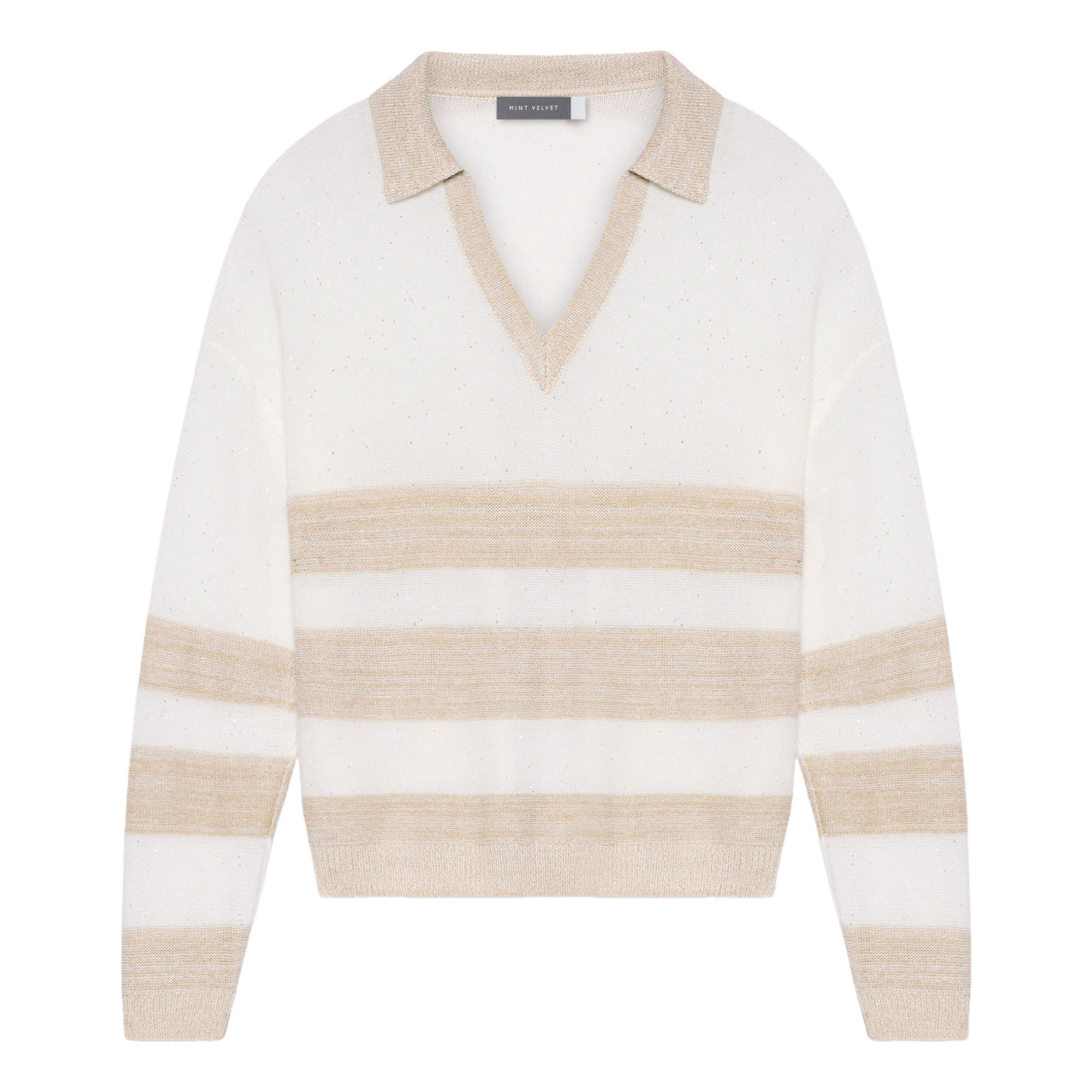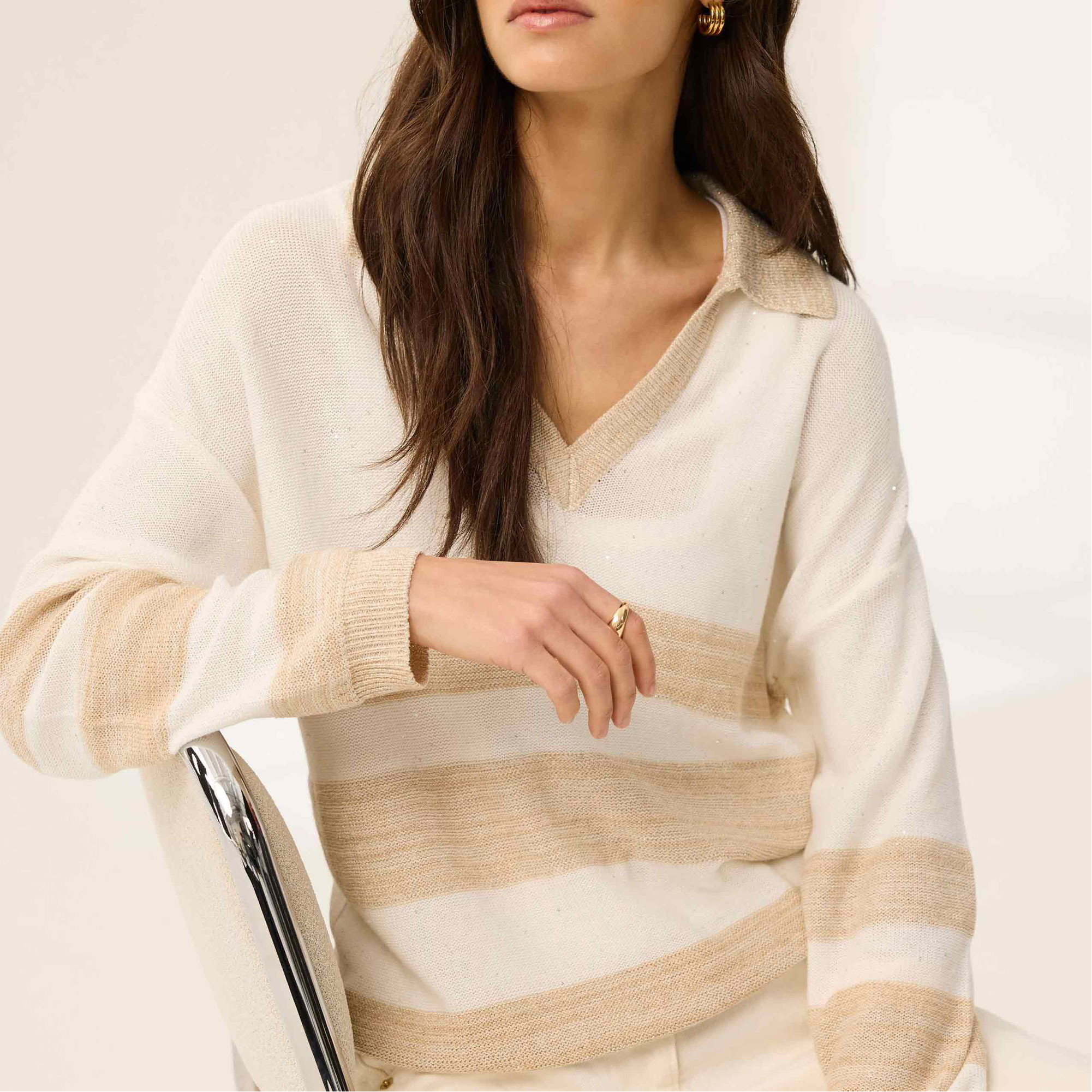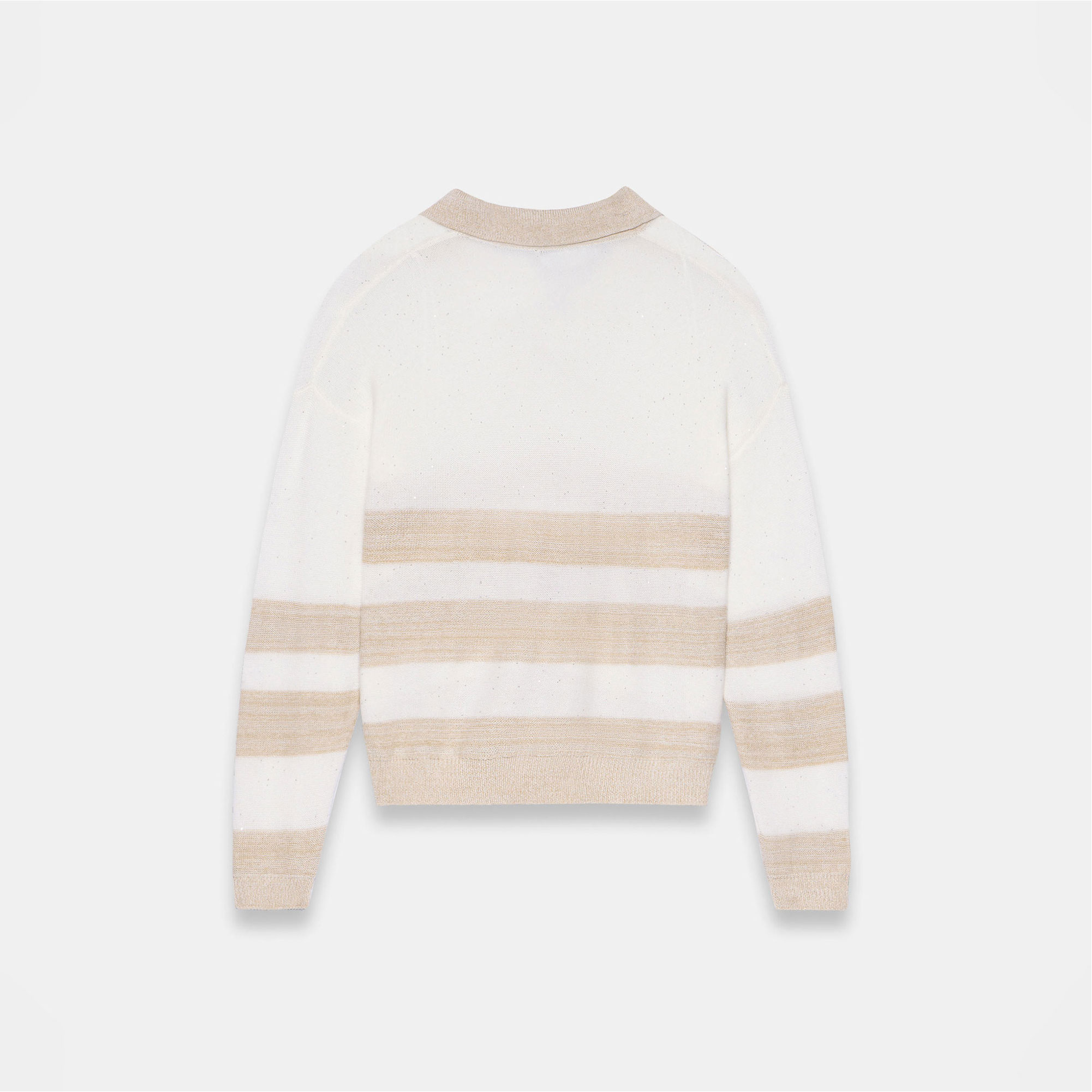 - Classic collar, open V-neckline, long sleeves, sequin embellishment, striped design