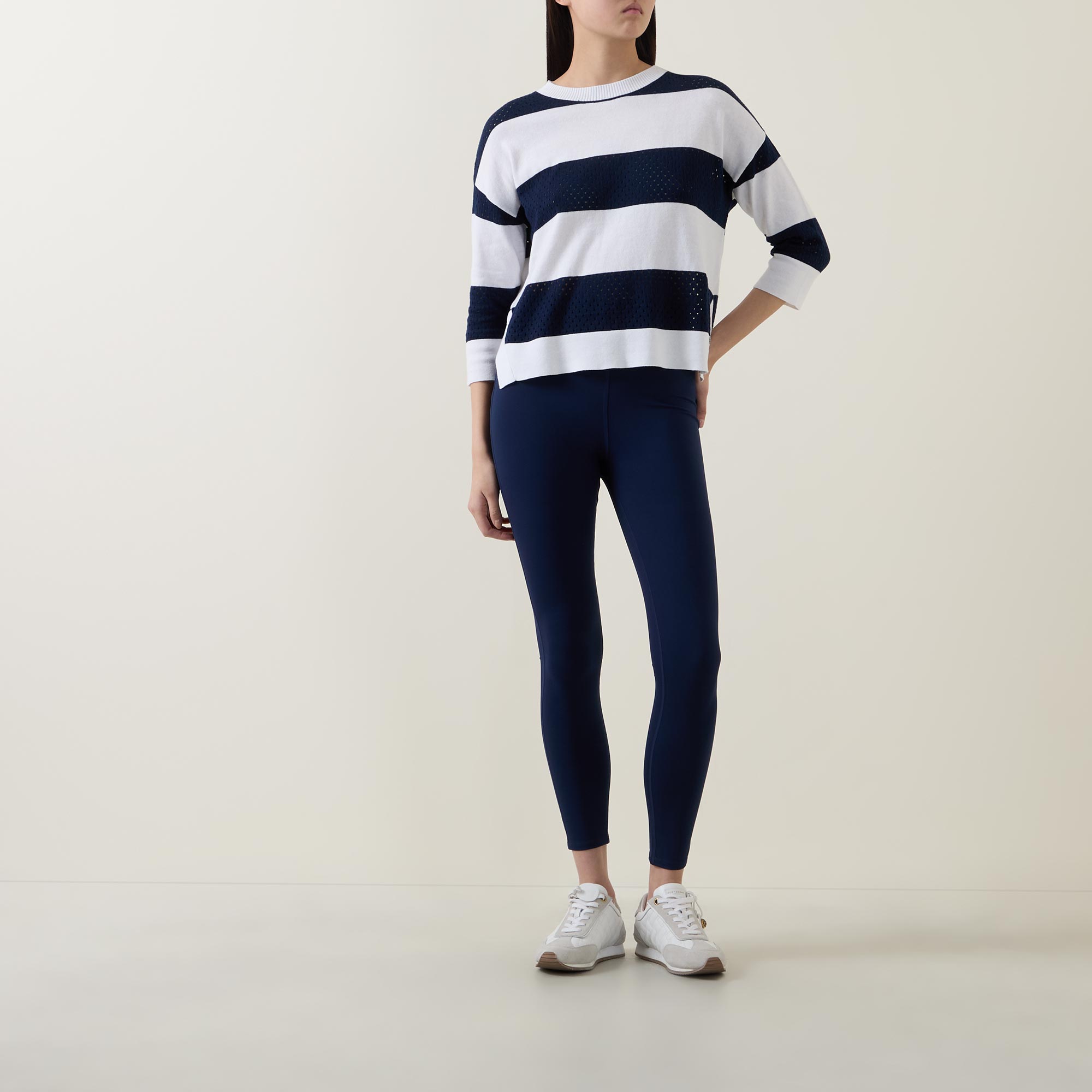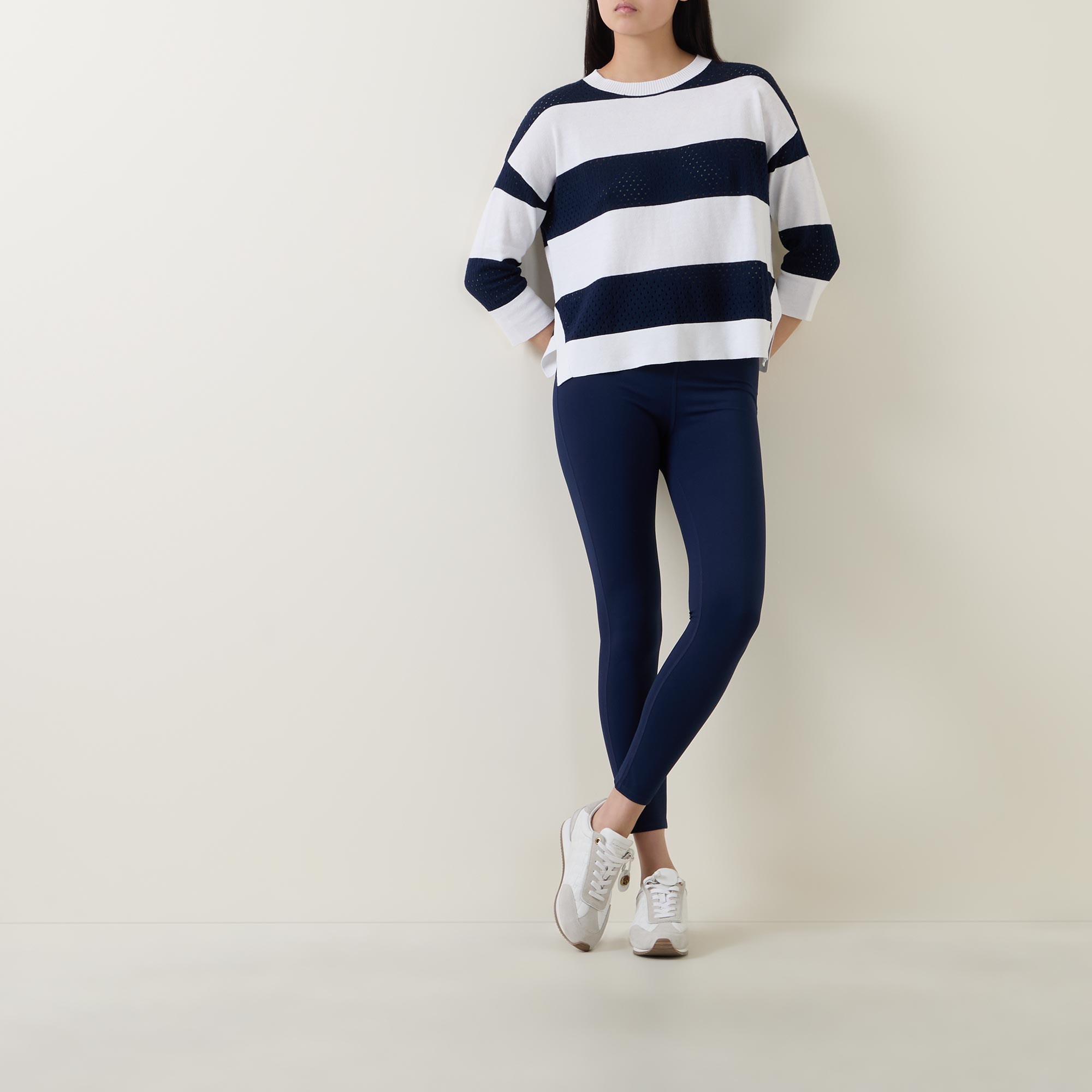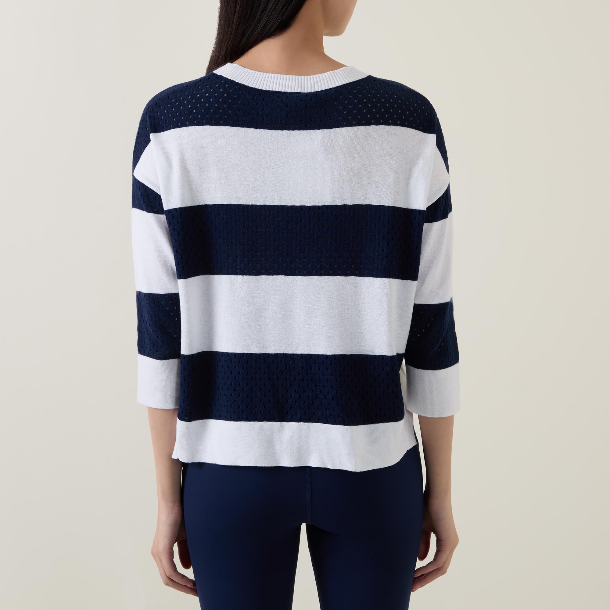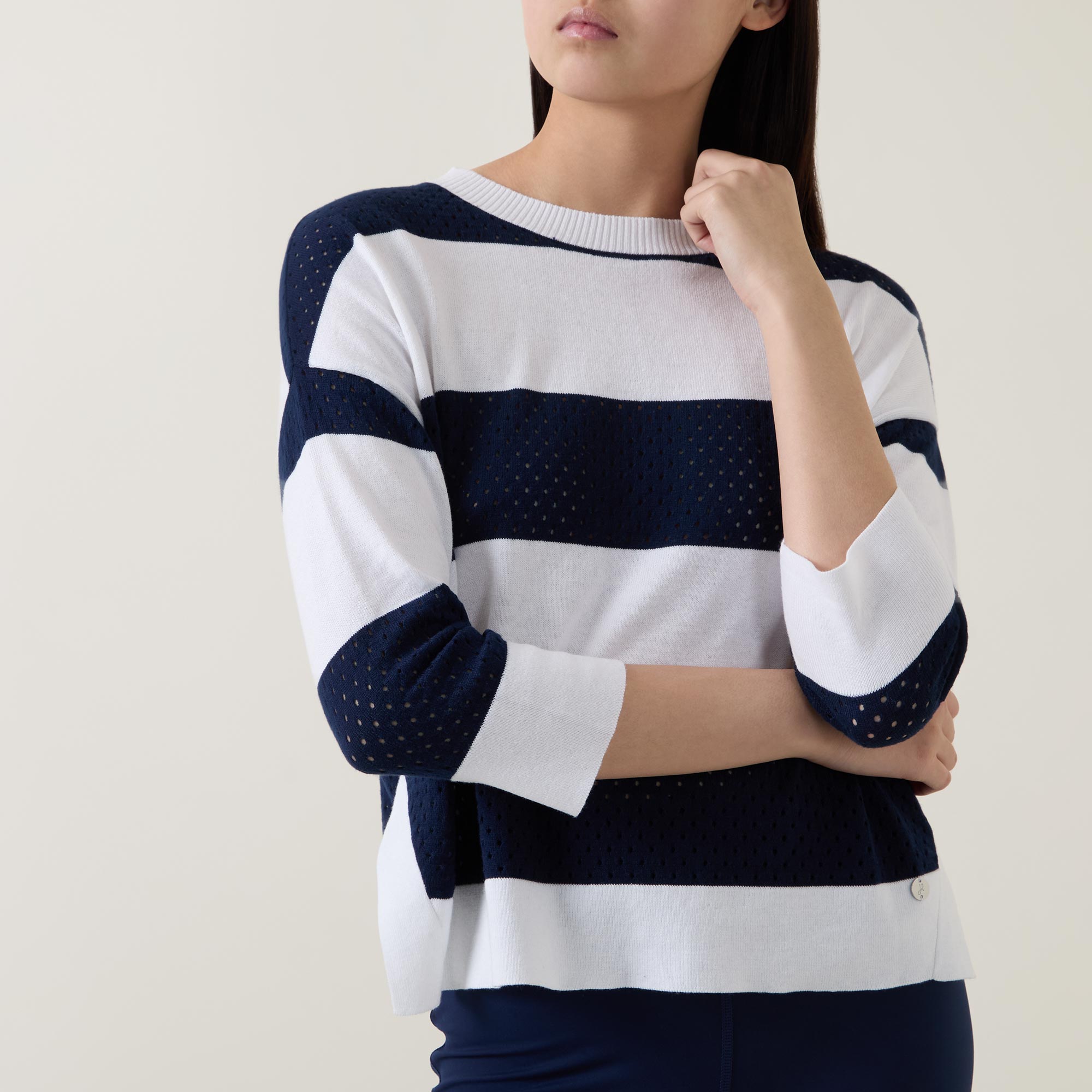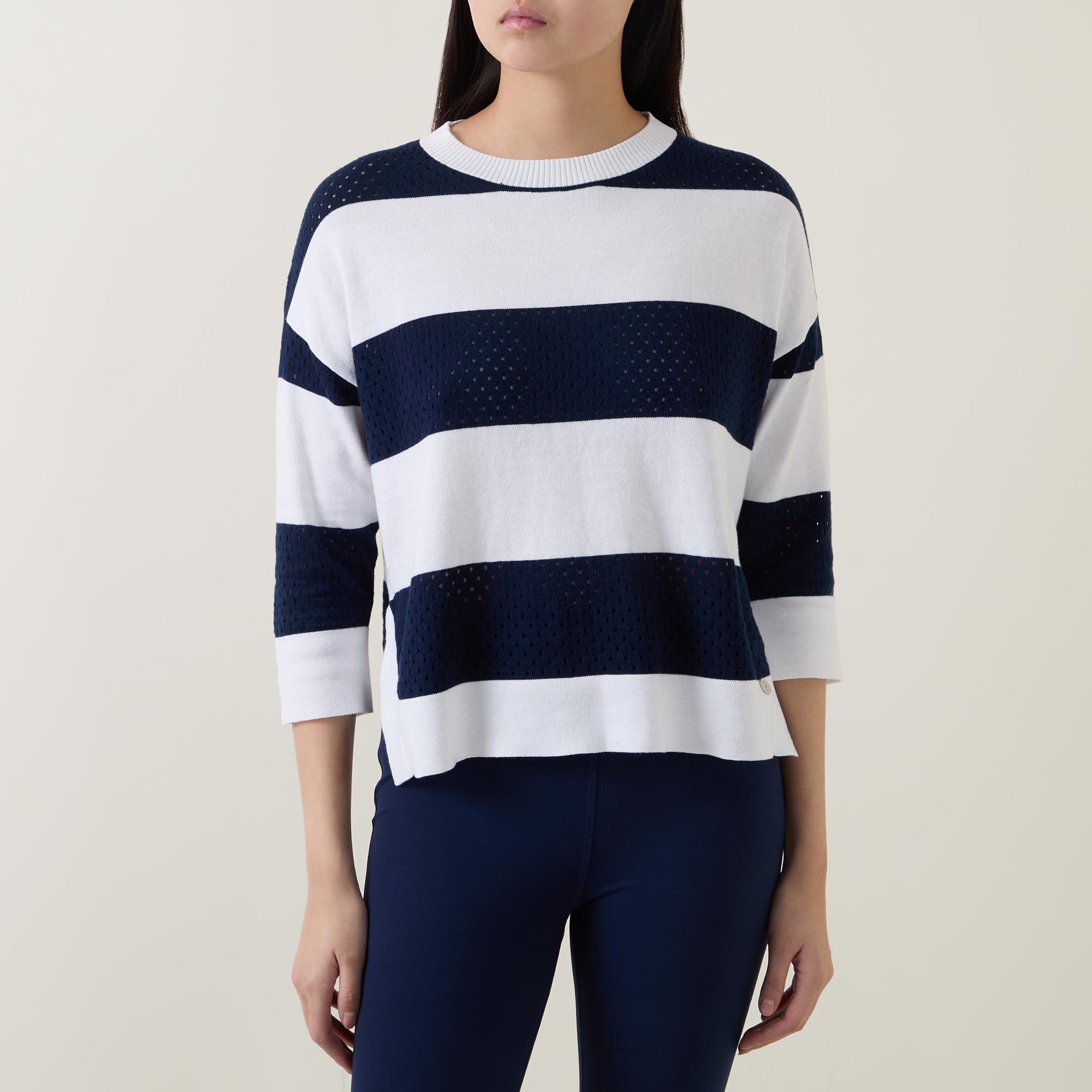 - Round neck, pointelle stitch, cropped sleeves, striped, side slits
