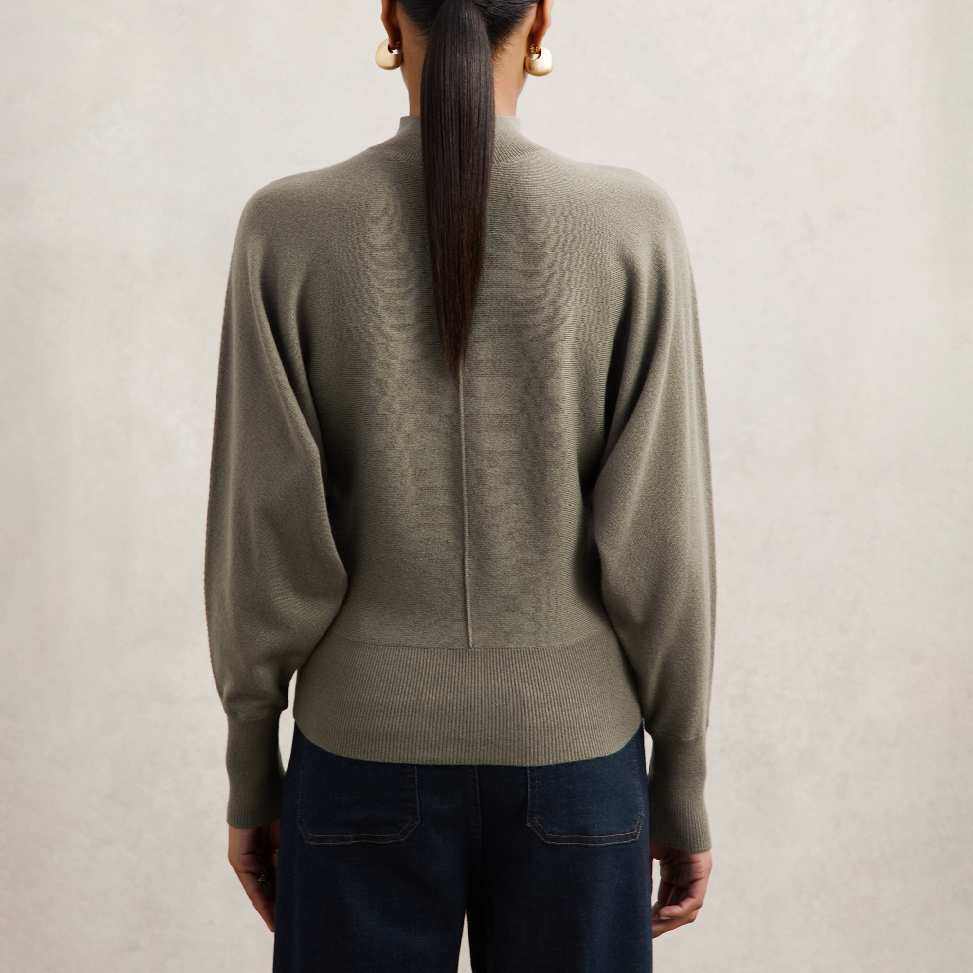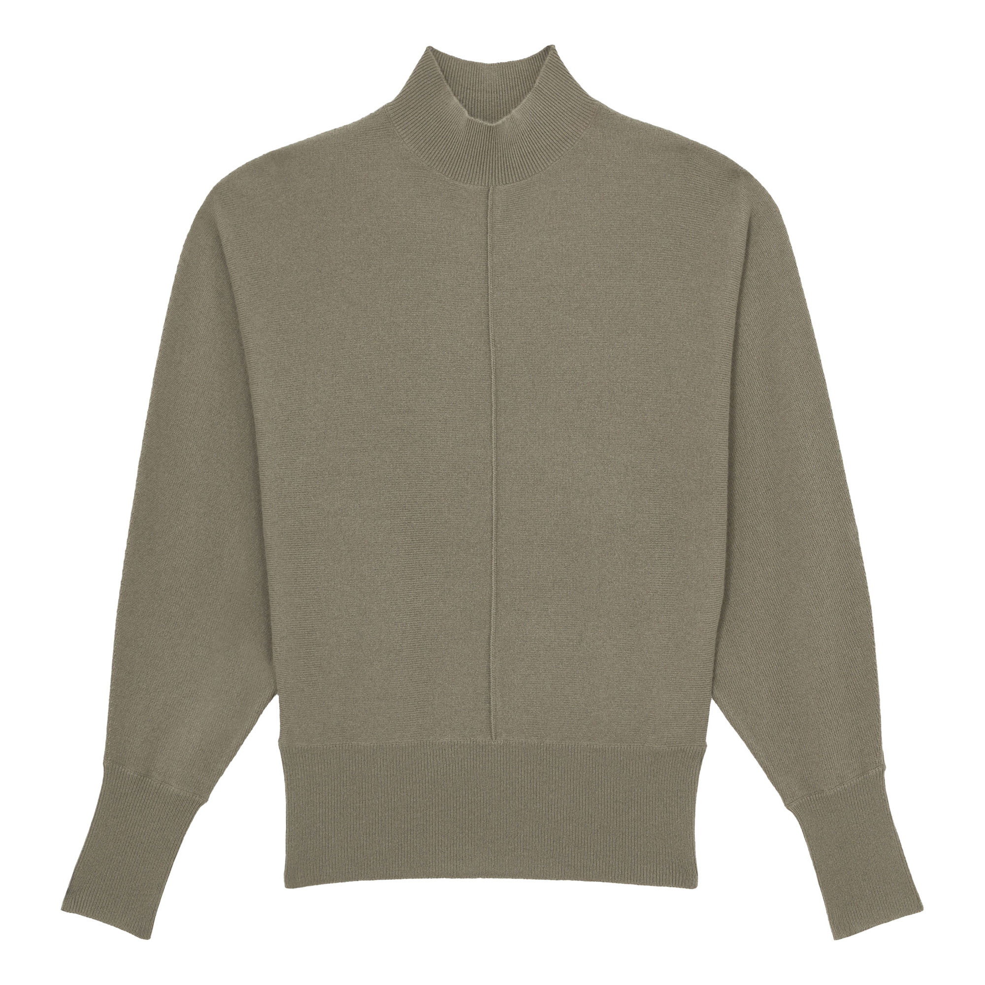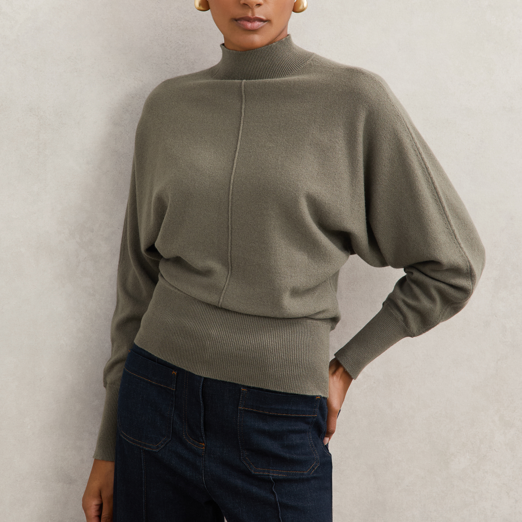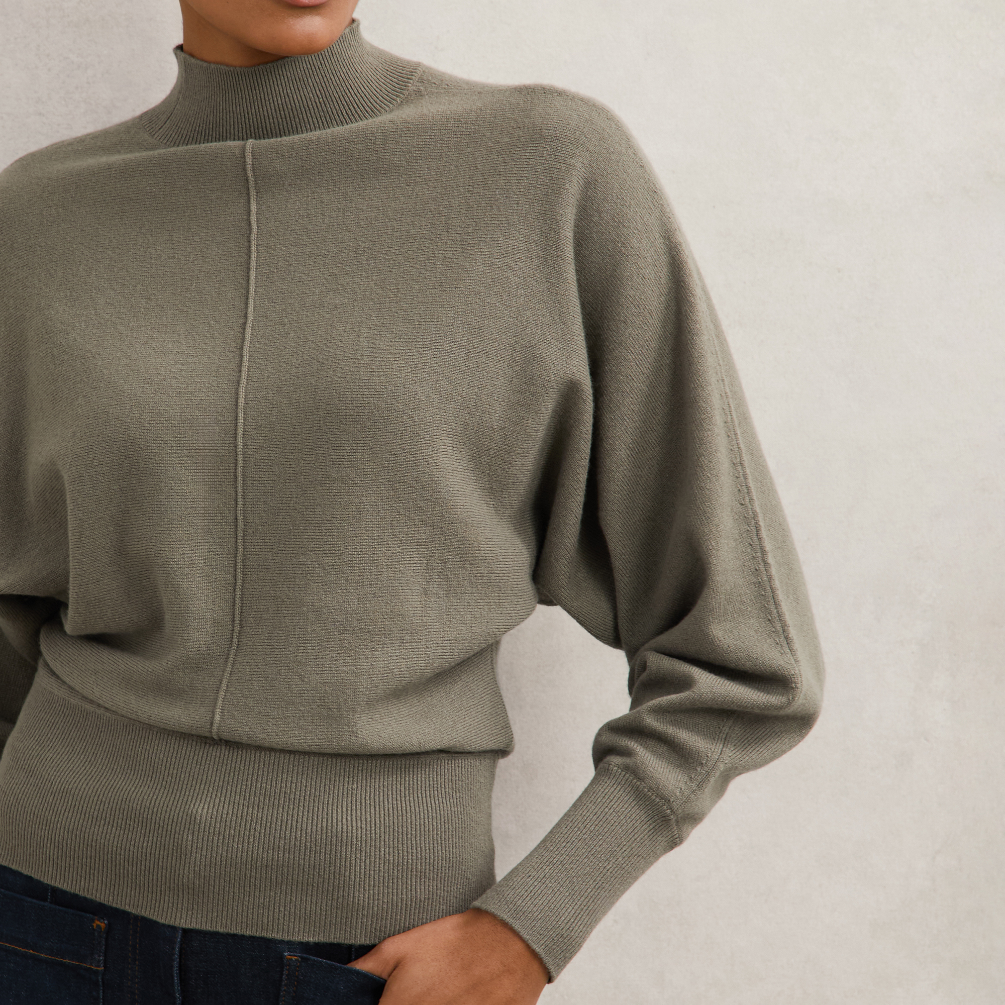 - Wool-blend with cashmere, funnel neckline, batwing sleeves, raised seam details, finely ribbed trims