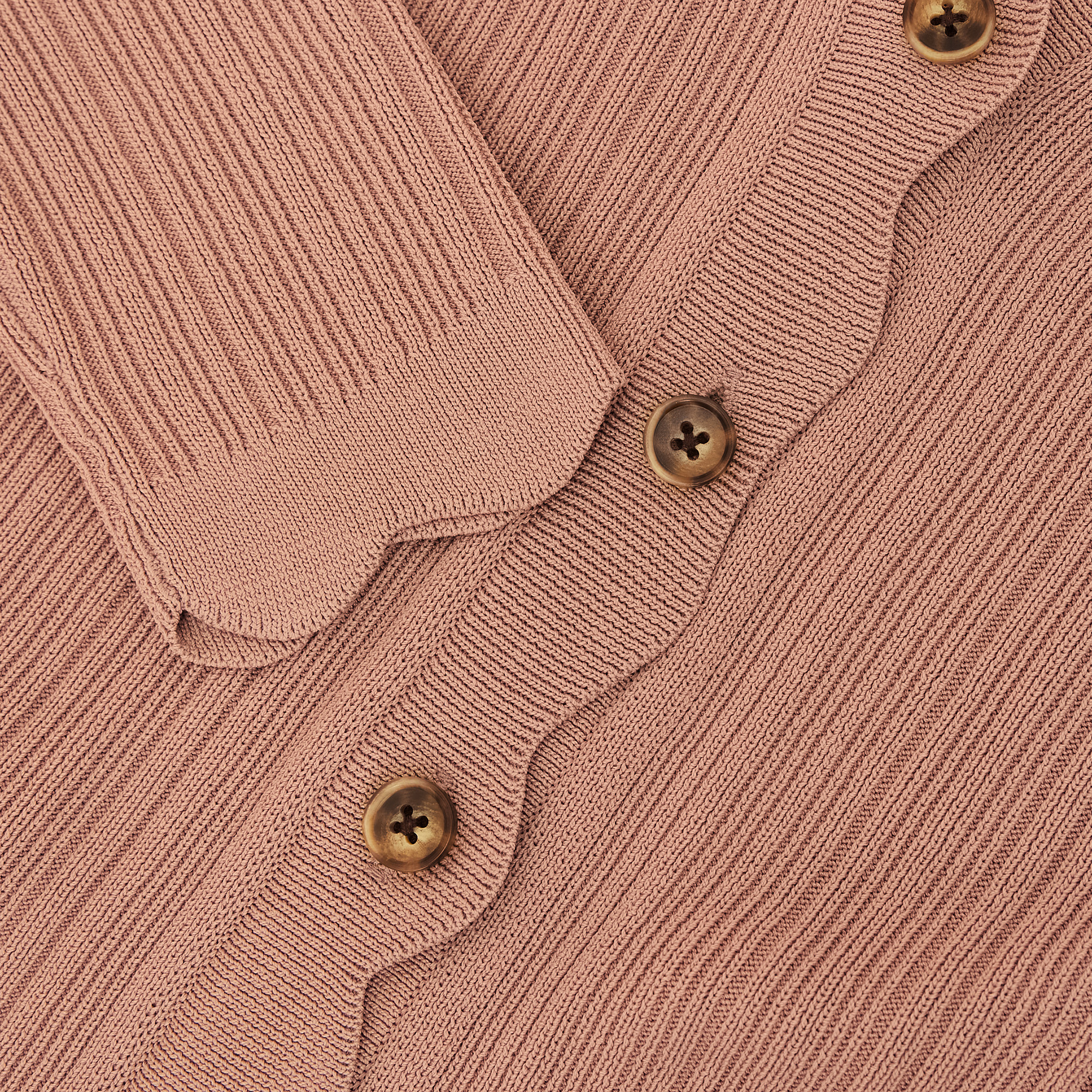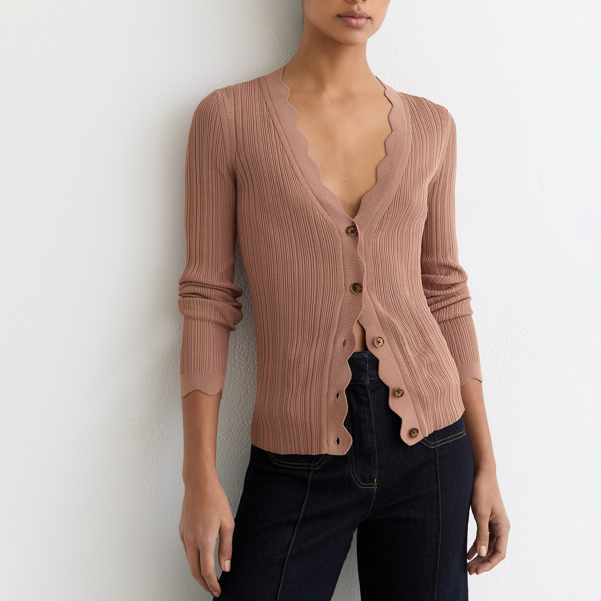• Rib-knit texture, scallop edge, v-neckline, long sleeves, front buttons