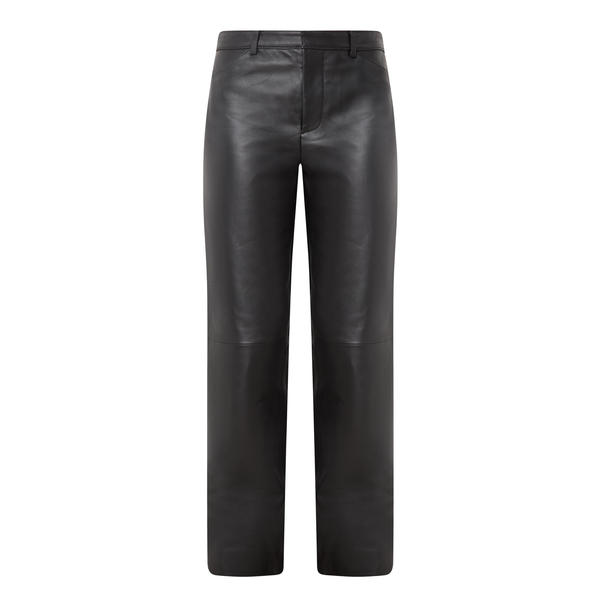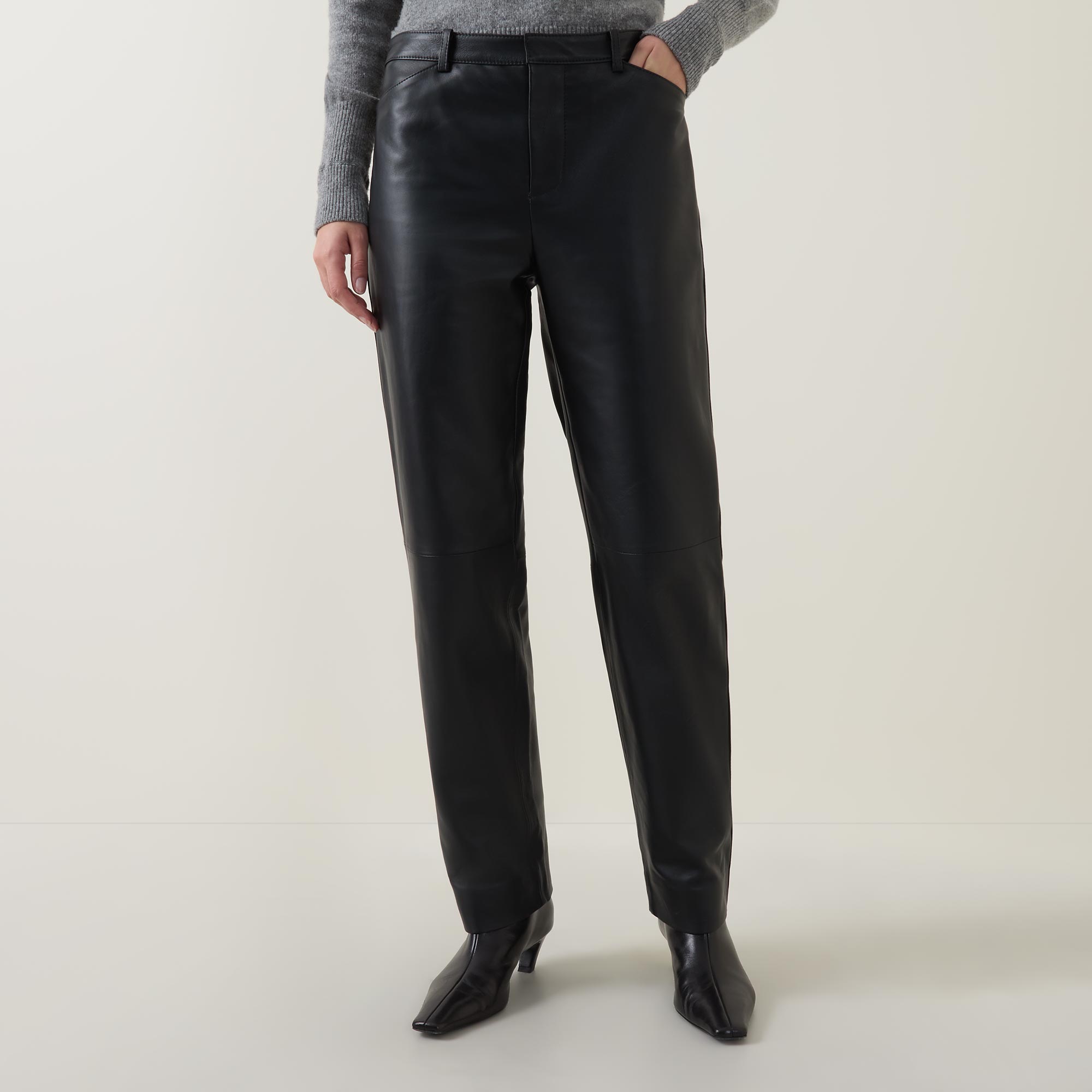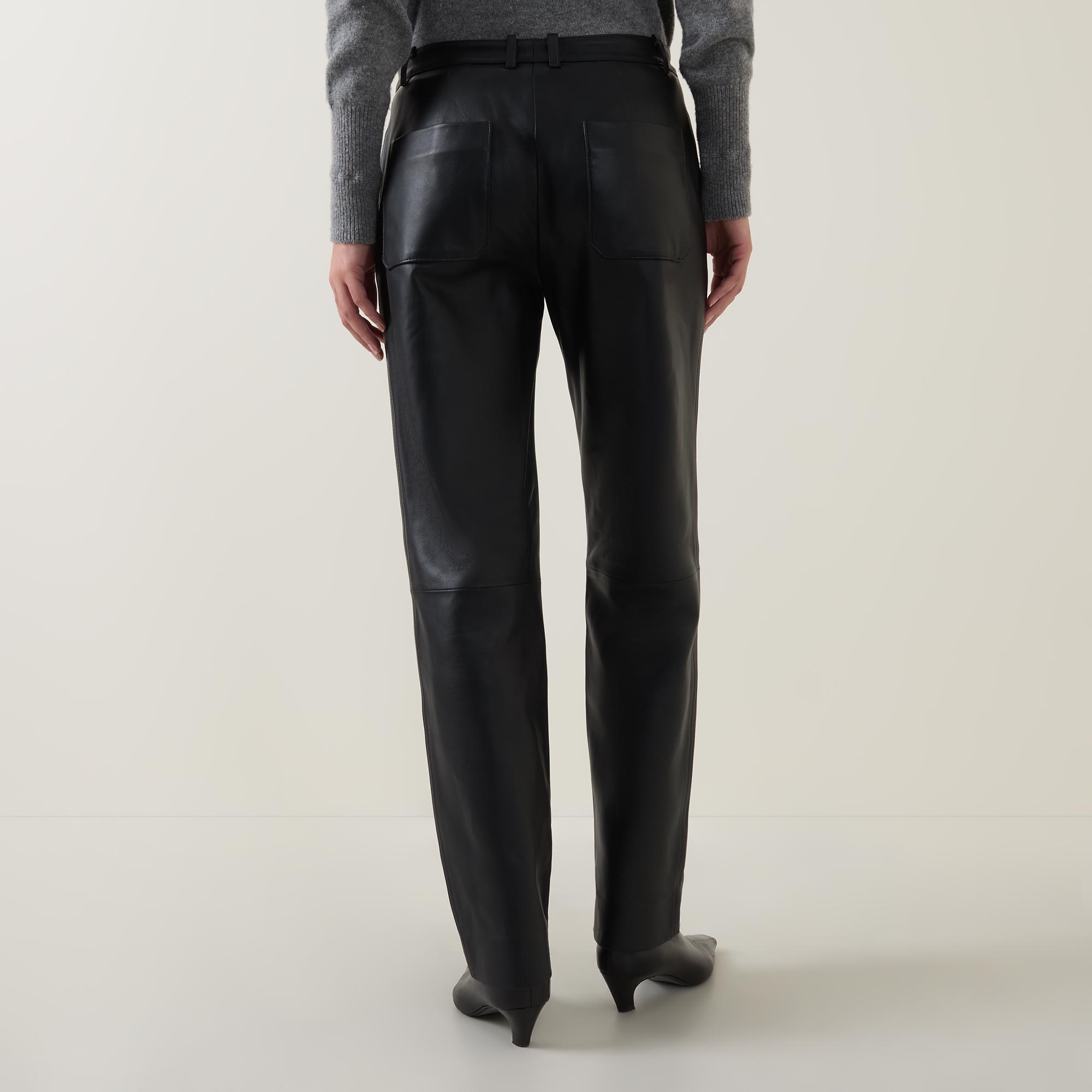 - Tapered leg, mid rise, smooth leather, concealed fastening, belt loops, two front pockets, two back pockets