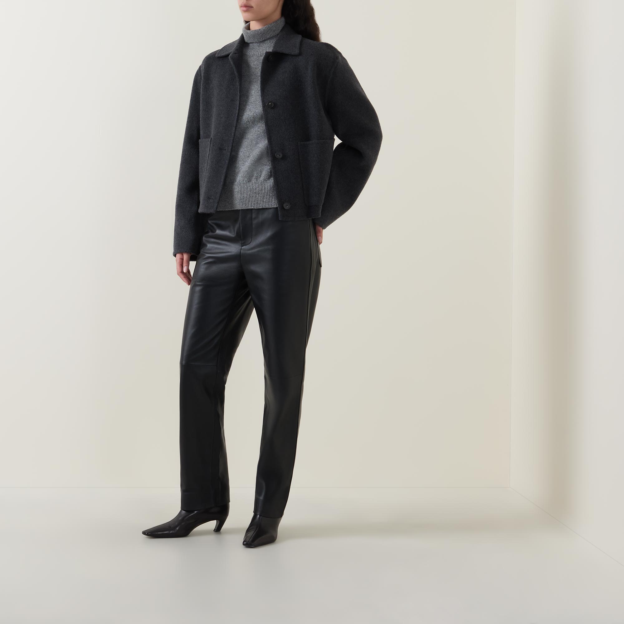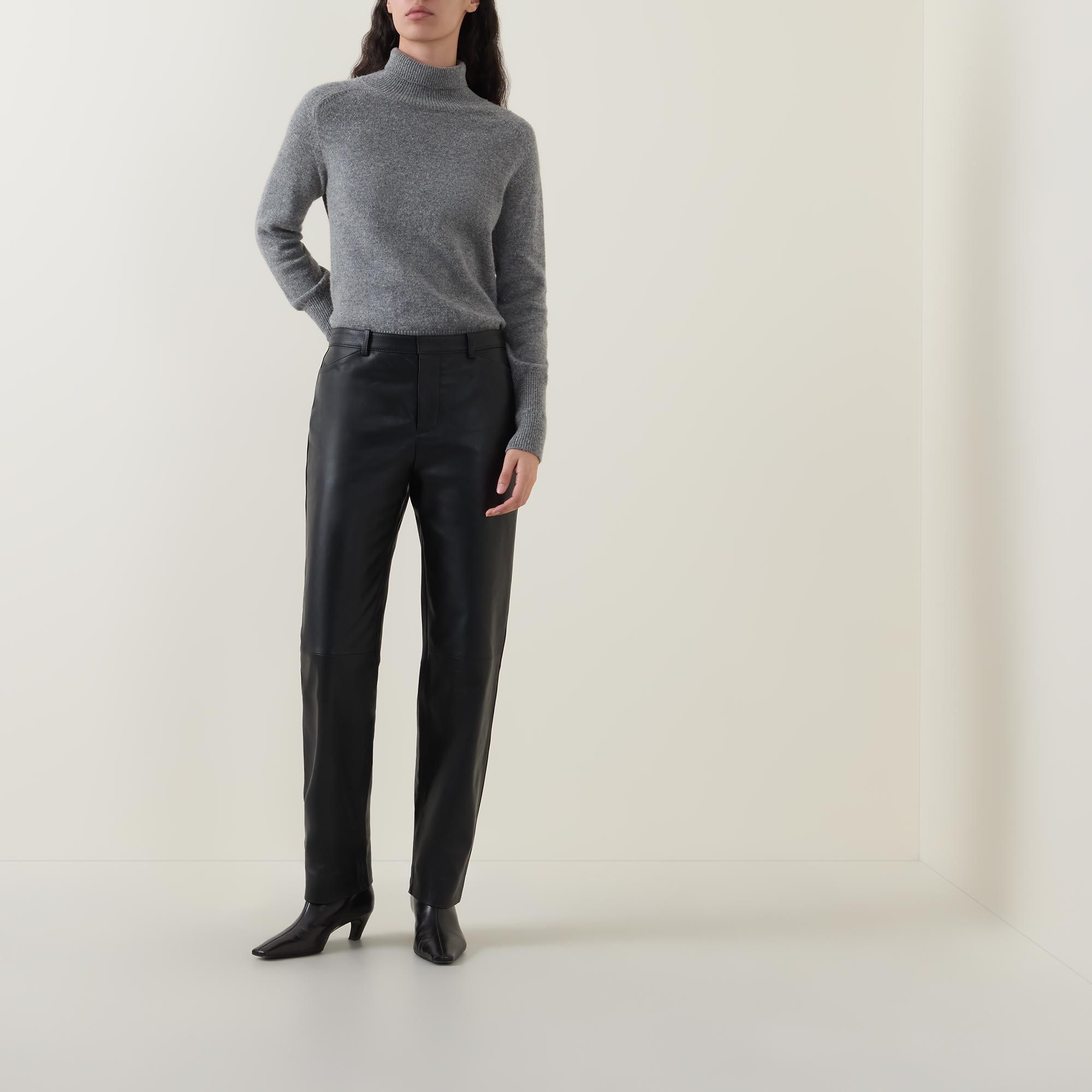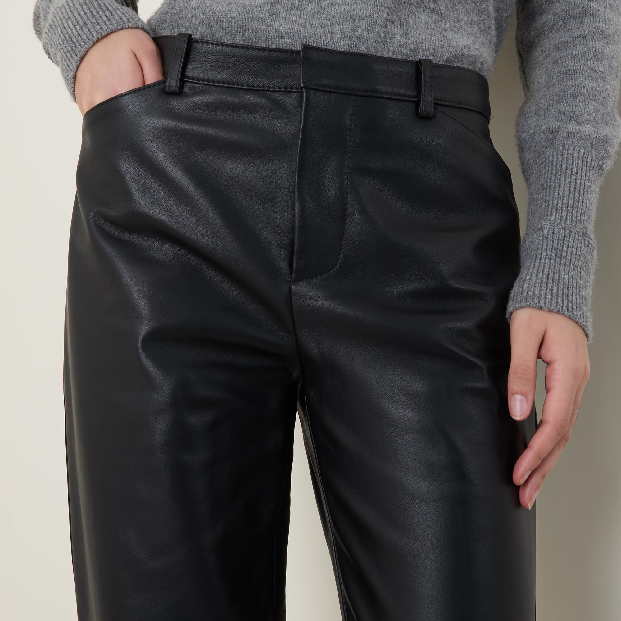 - Tapered leg, mid rise, smooth leather, concealed fastening, belt loops, two front pockets, two back pockets
