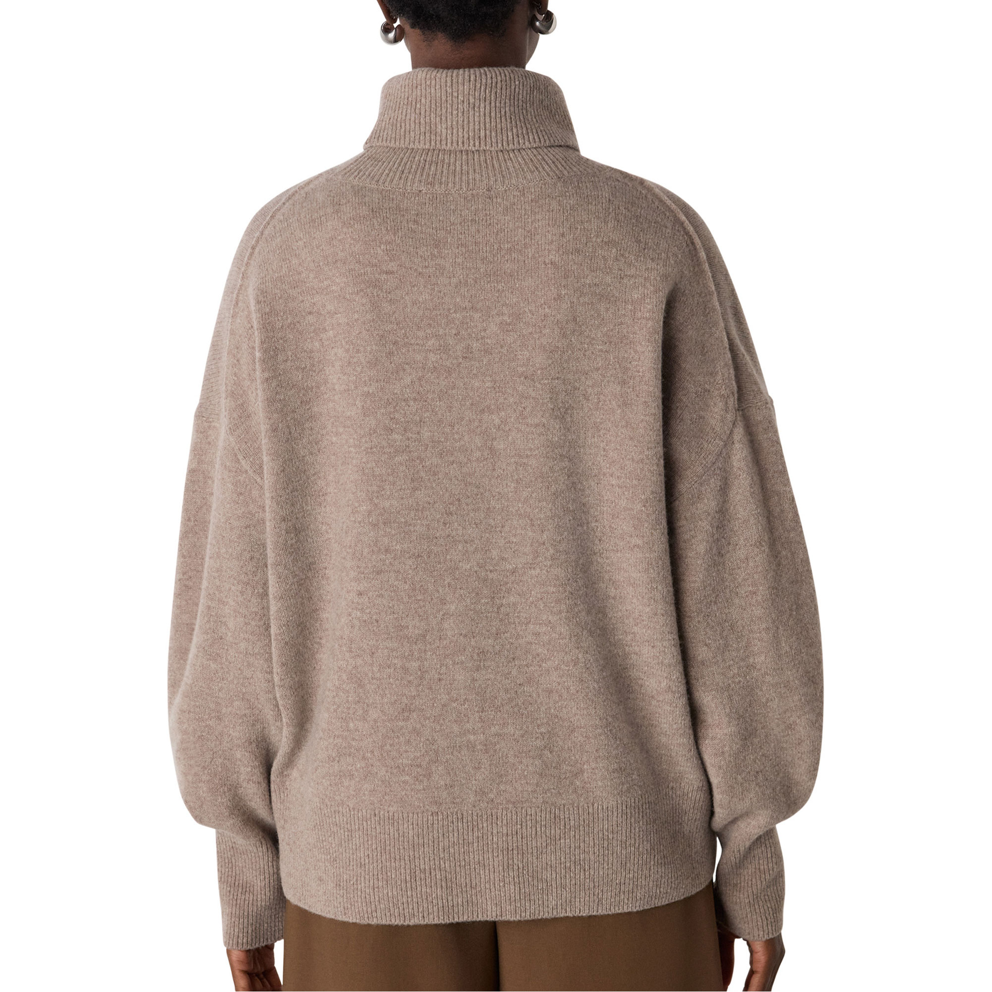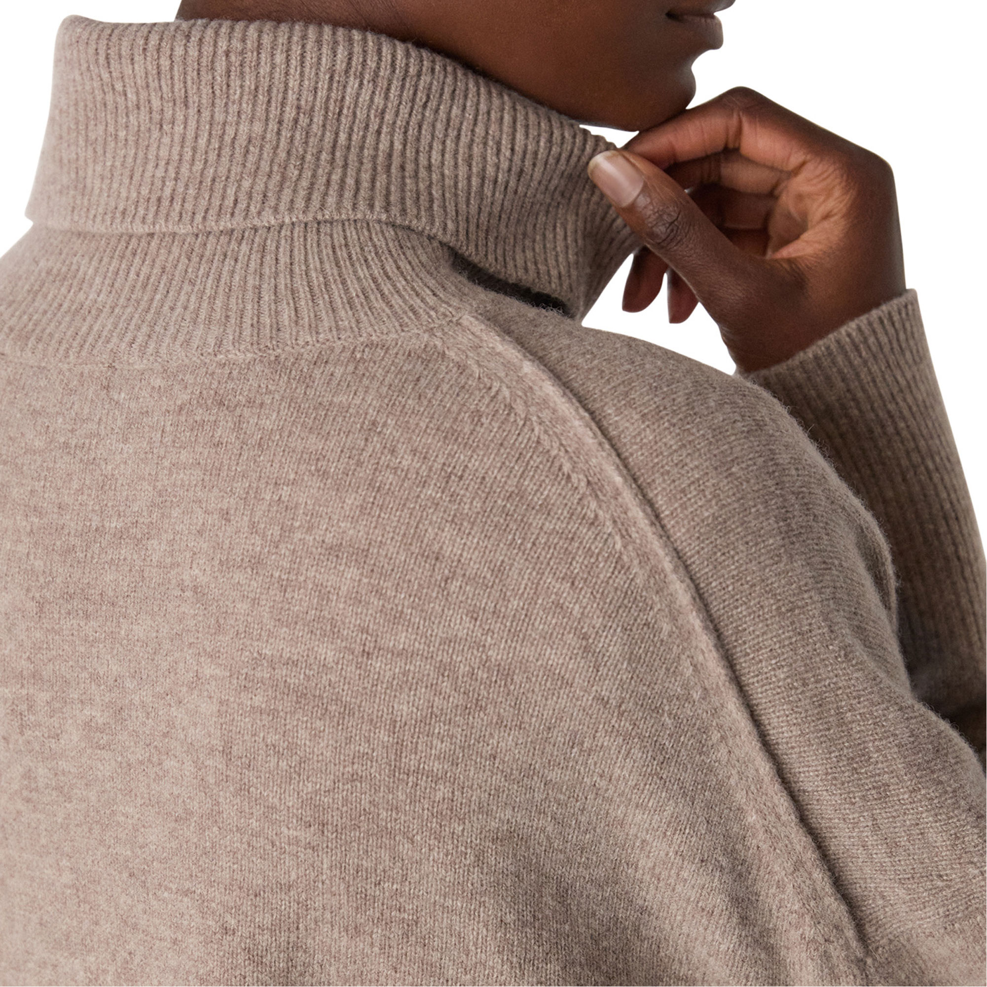 - Roll neck, curved hem, long sleeves
