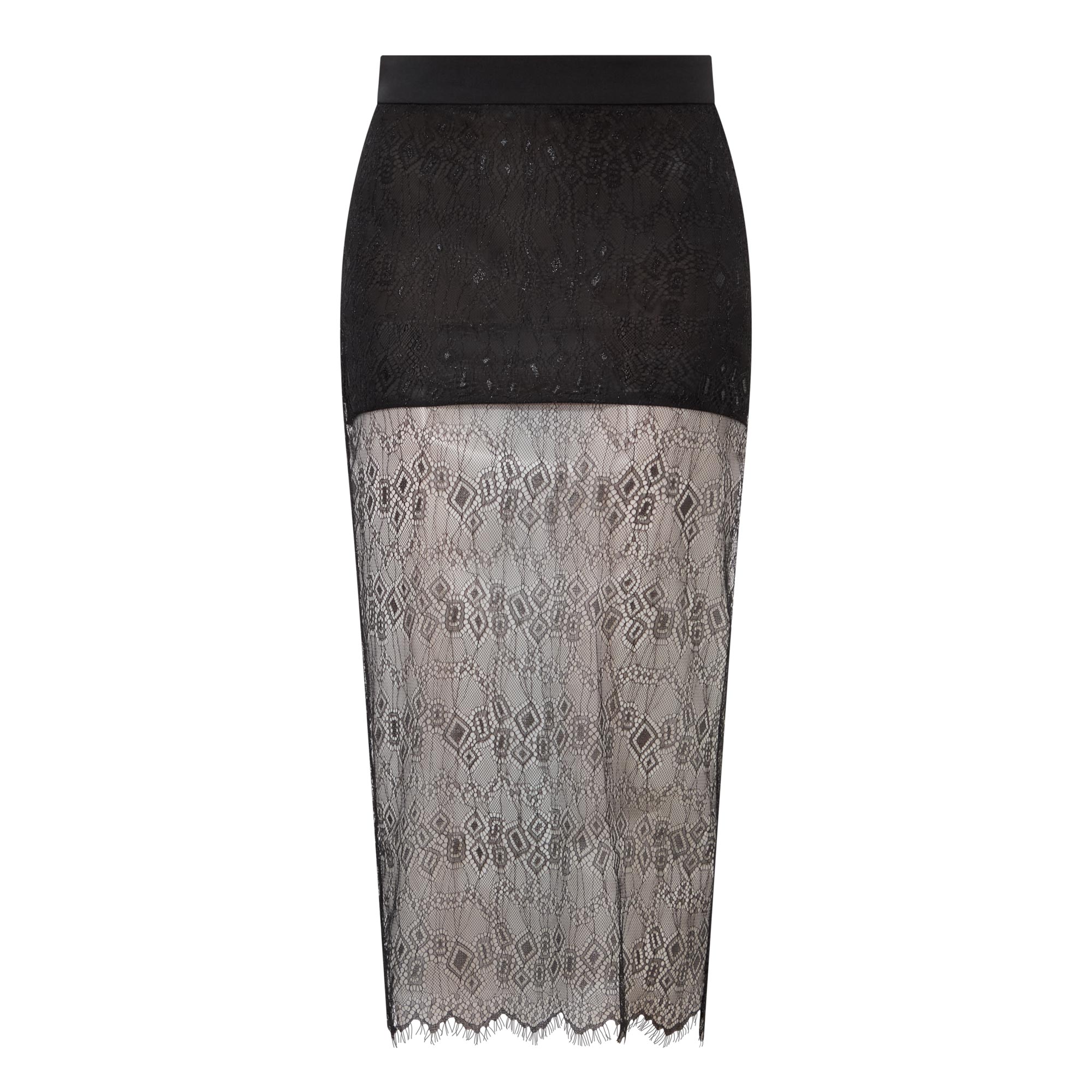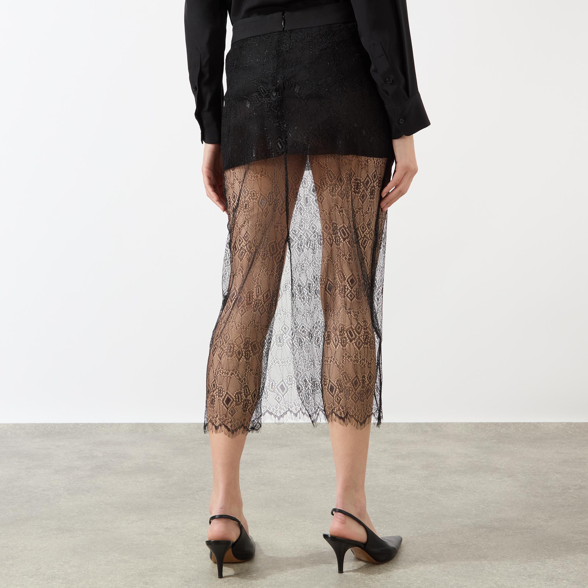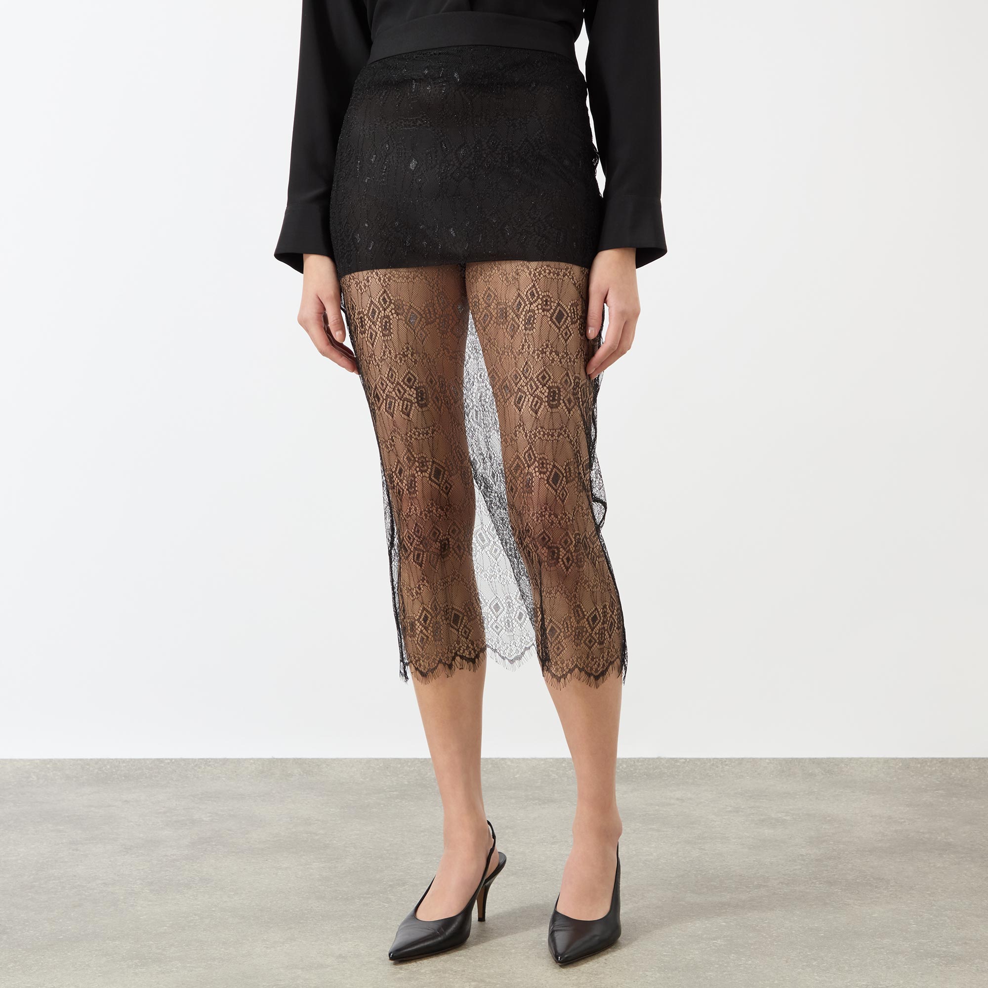- Back zip-fastening closure, high-rise, pencil silhouette, textured lace overlay, midi length