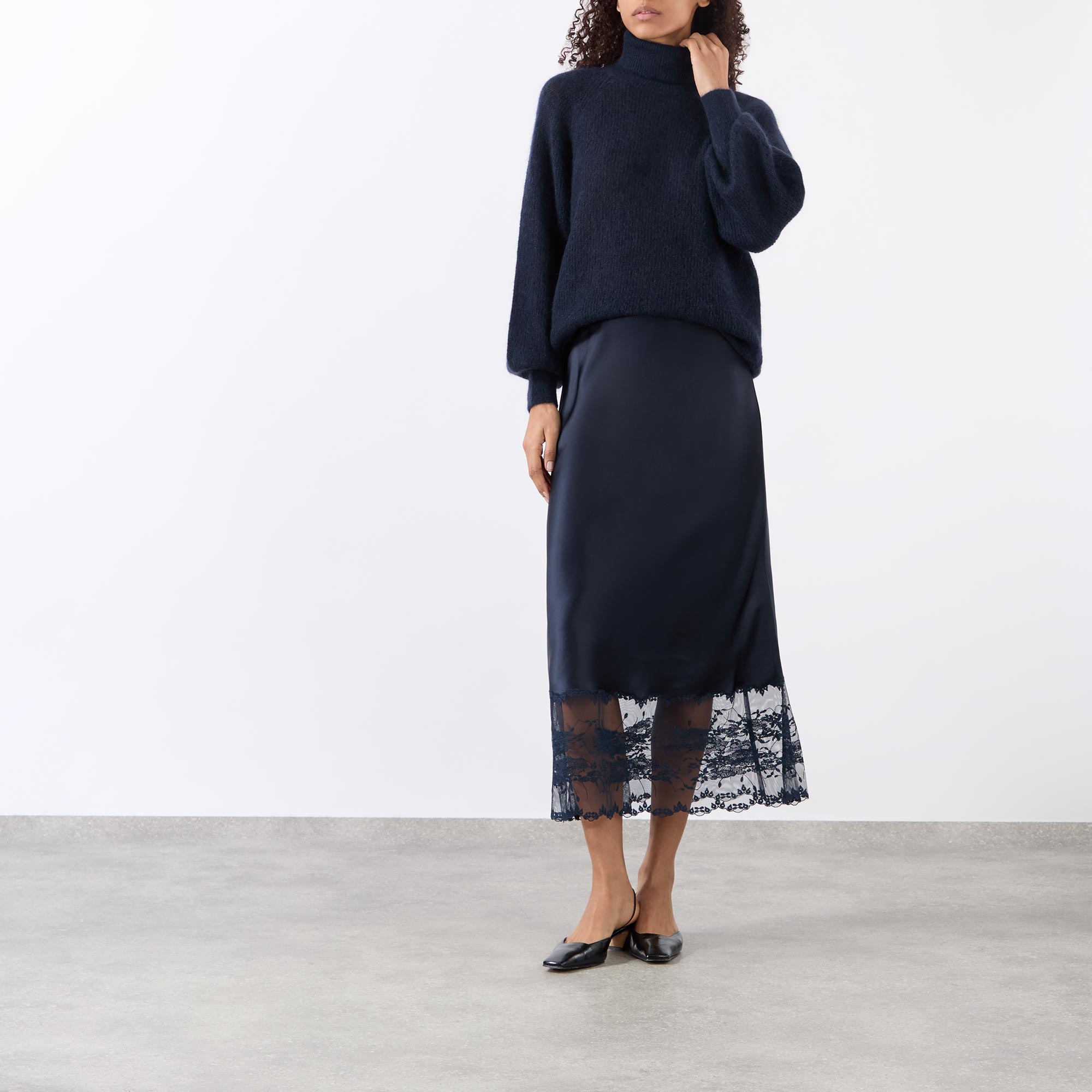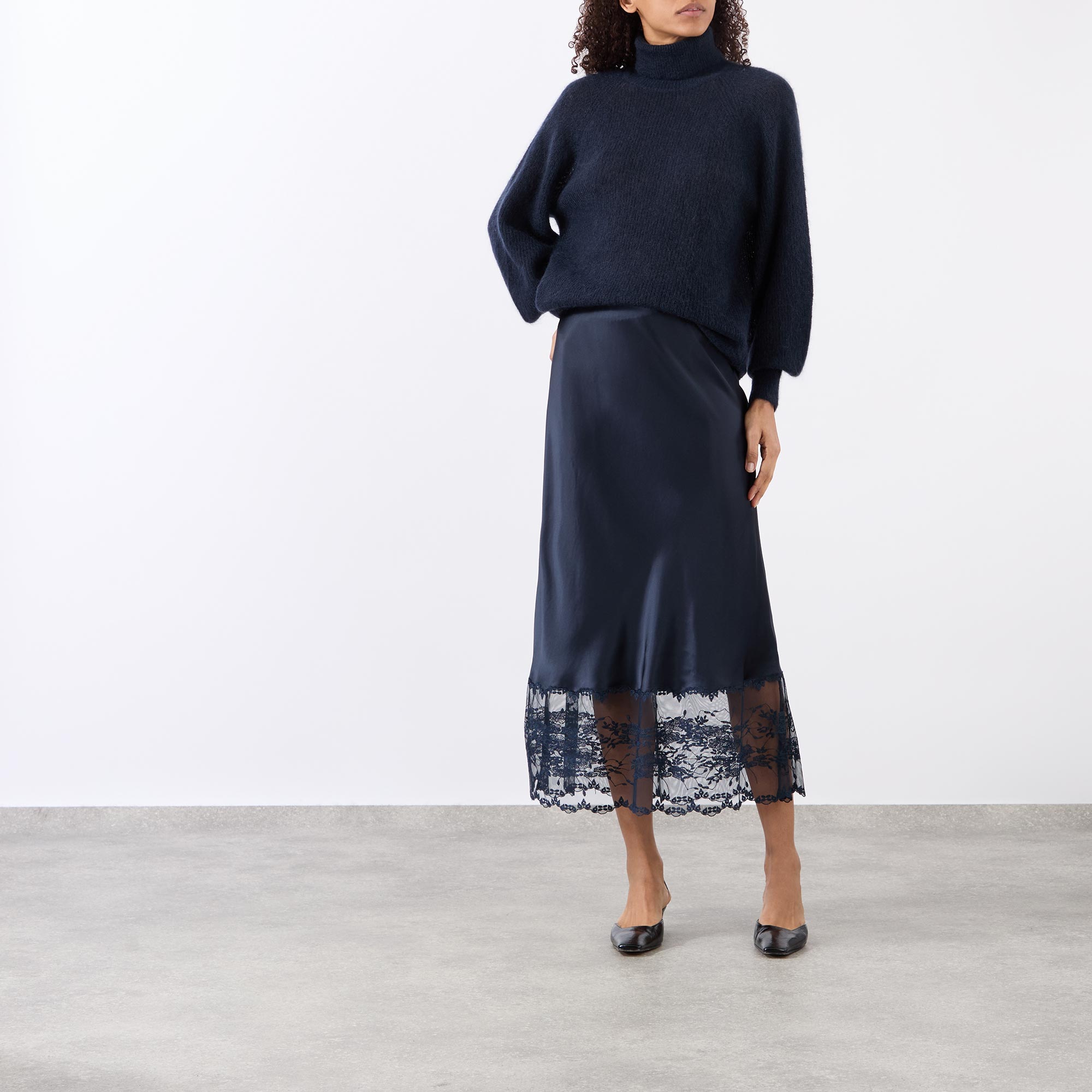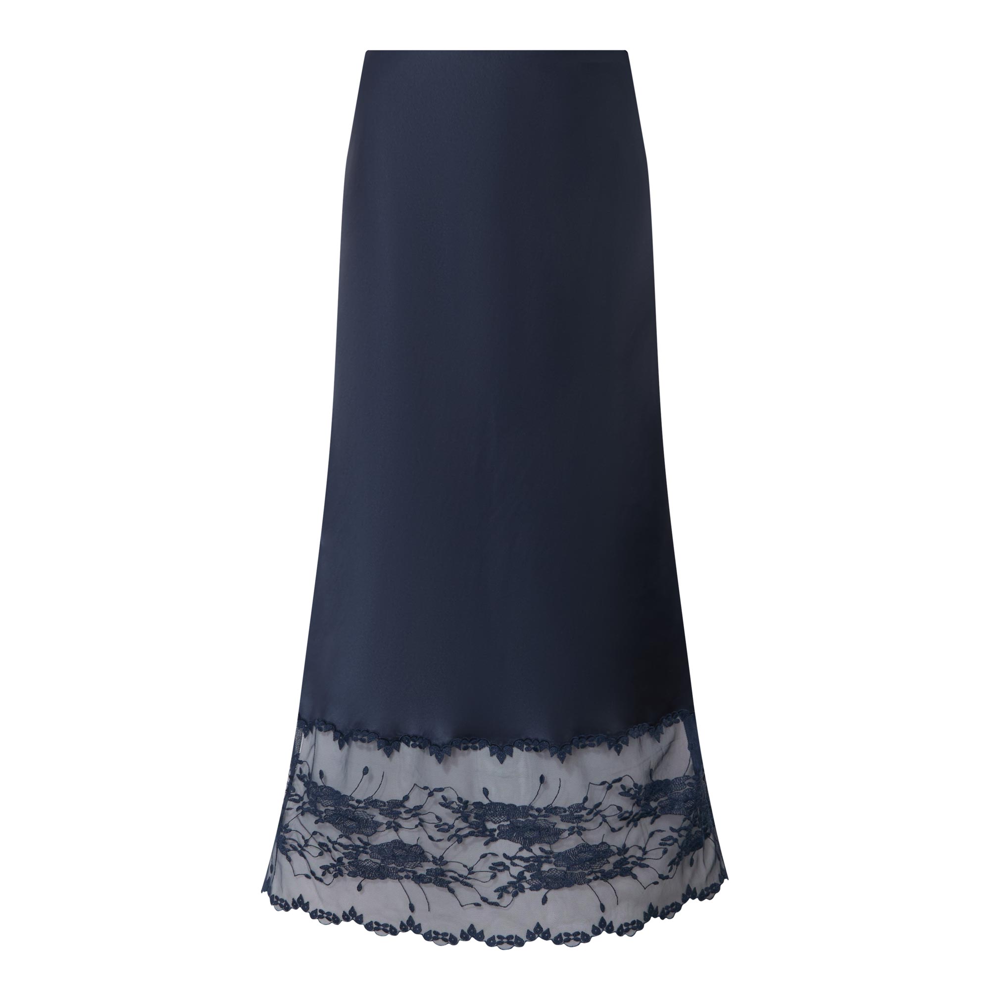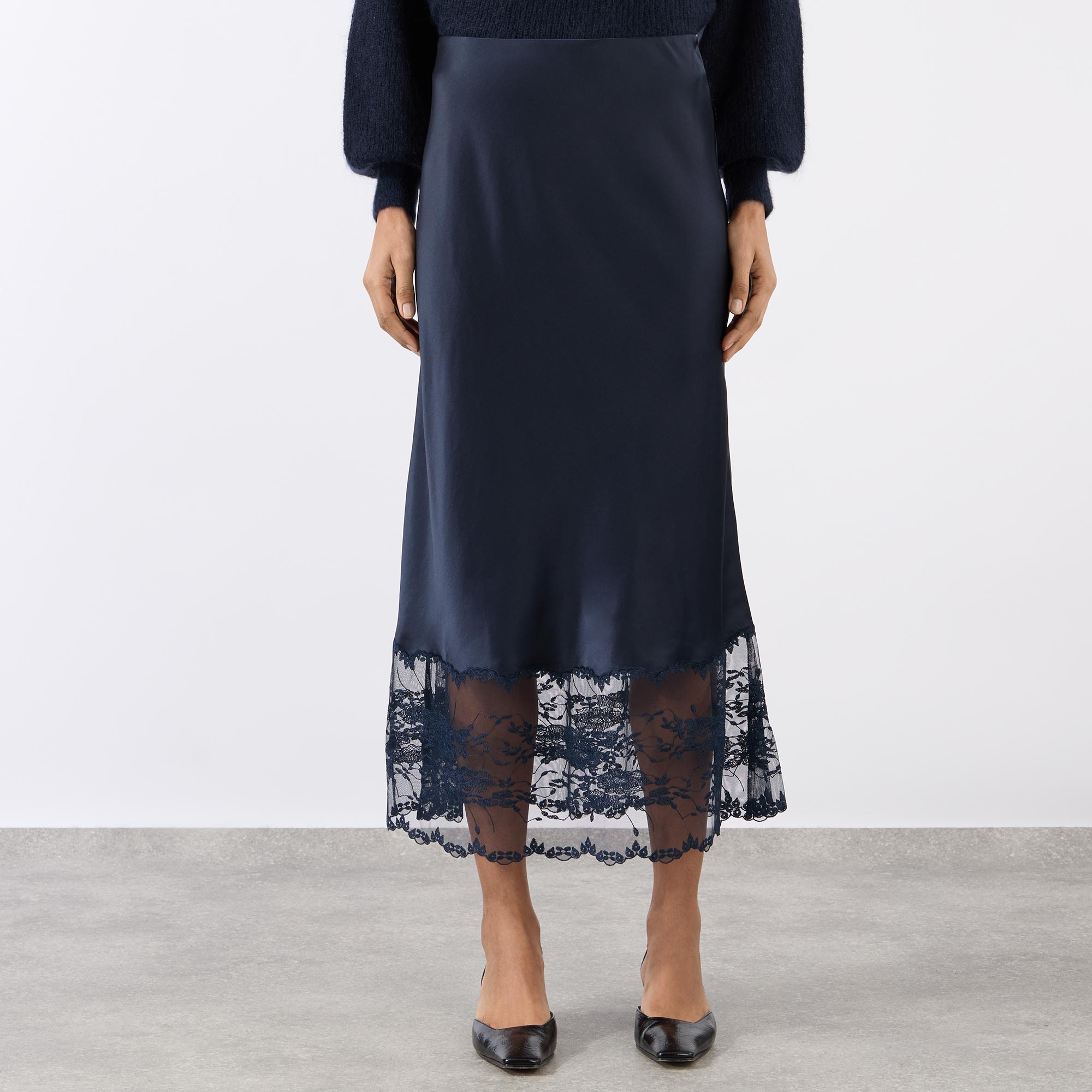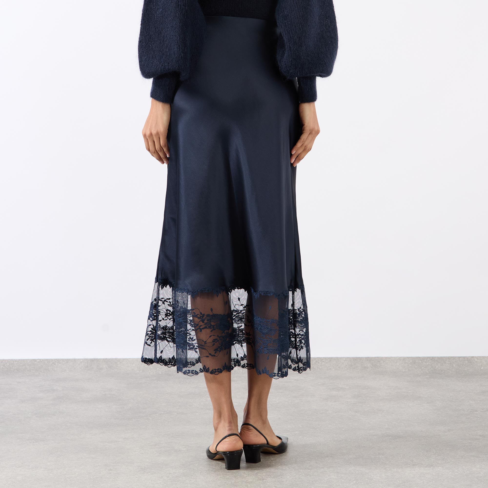 - Elasticated waistband, midi length, unlined, lace embellishment at trim, smooth satin fabric