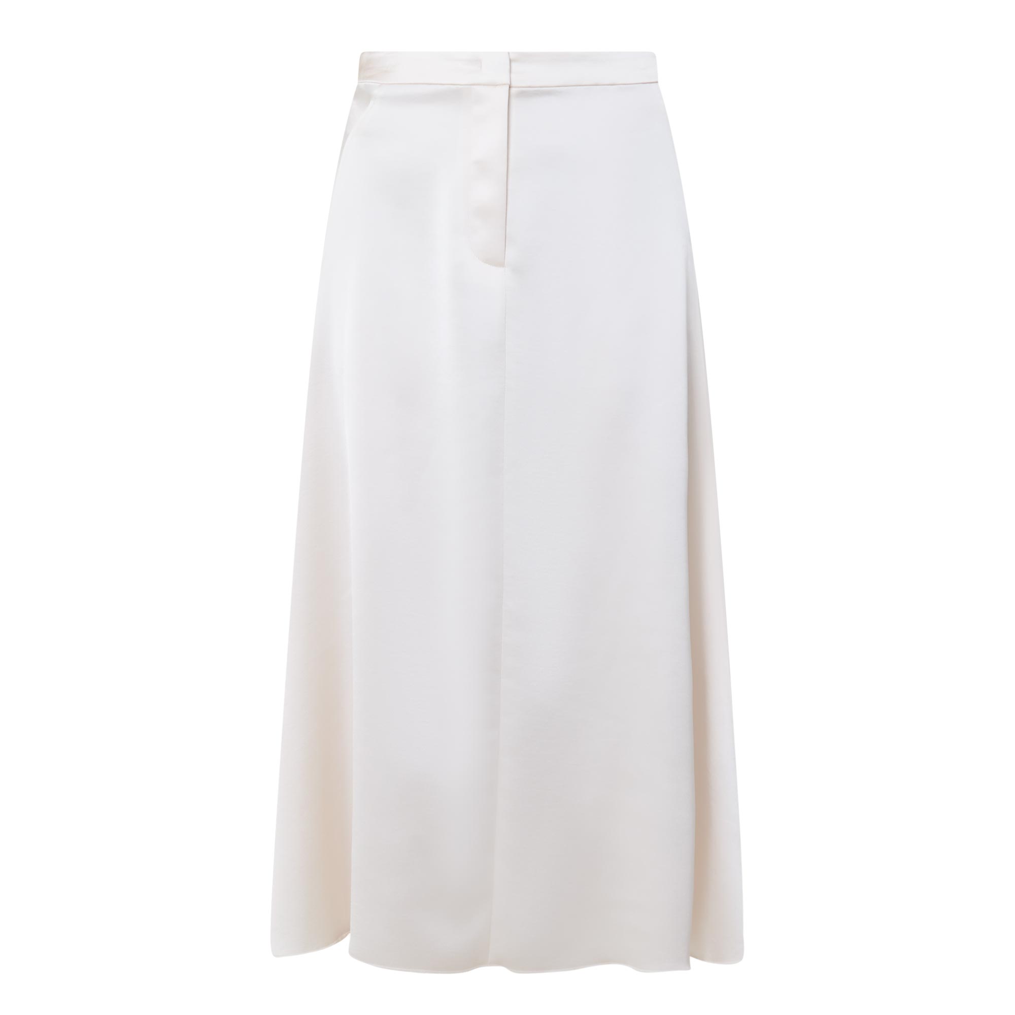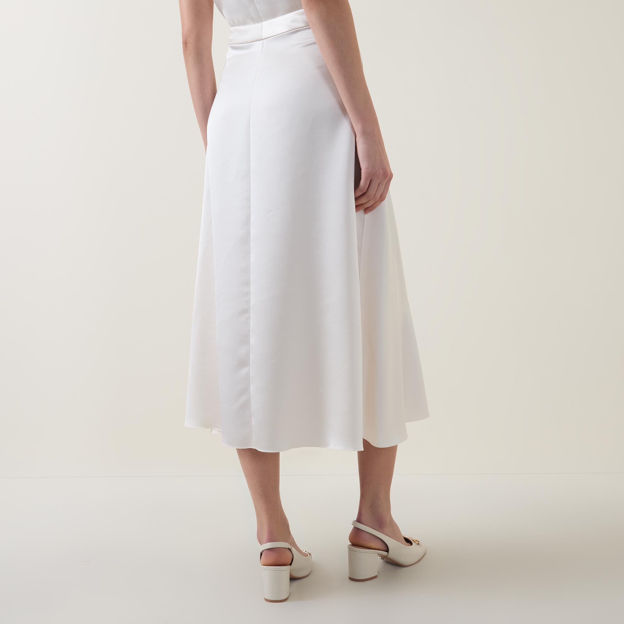 - High-rise, concealed hook-and-bar fastening, flared silhouette, midi length, smooth satin finish