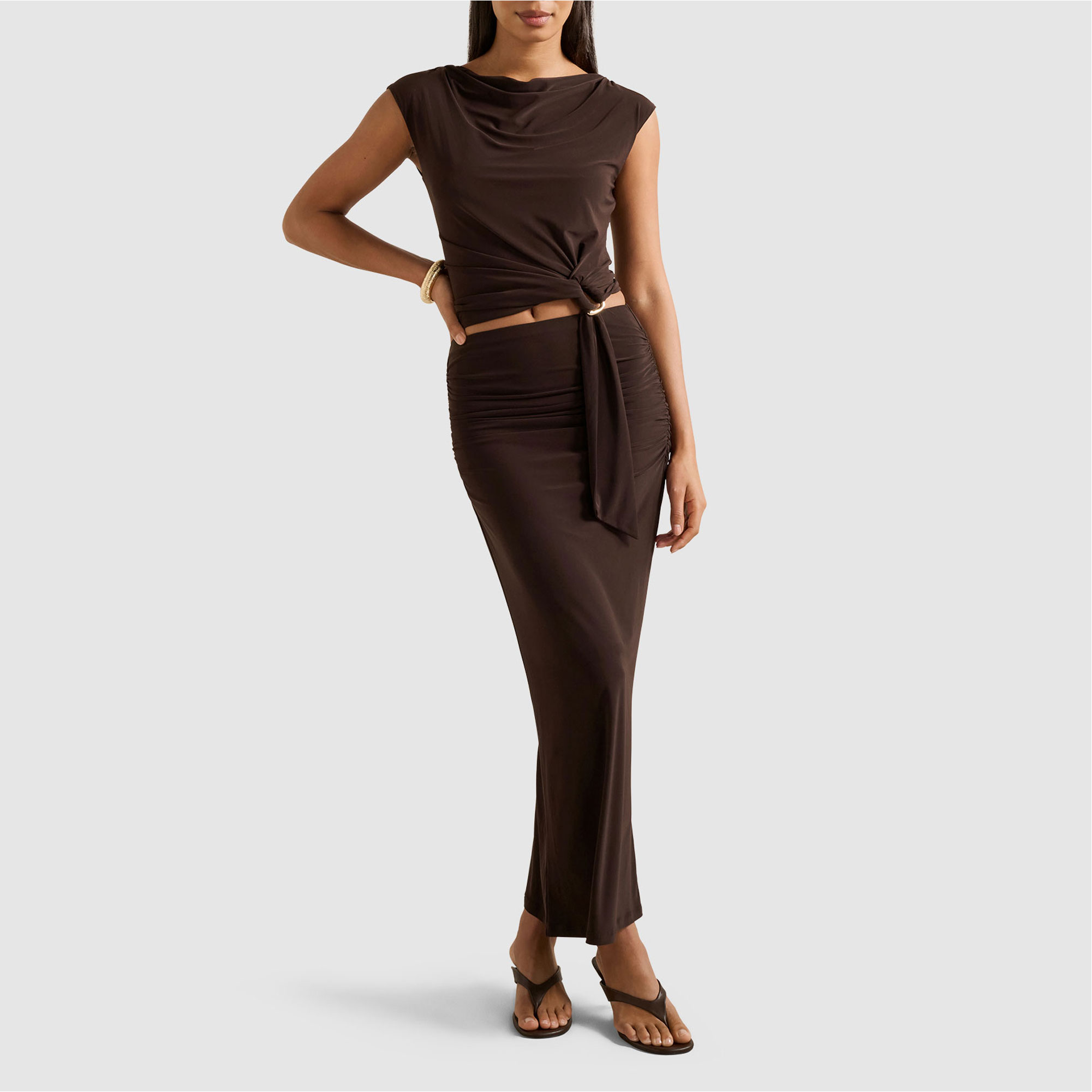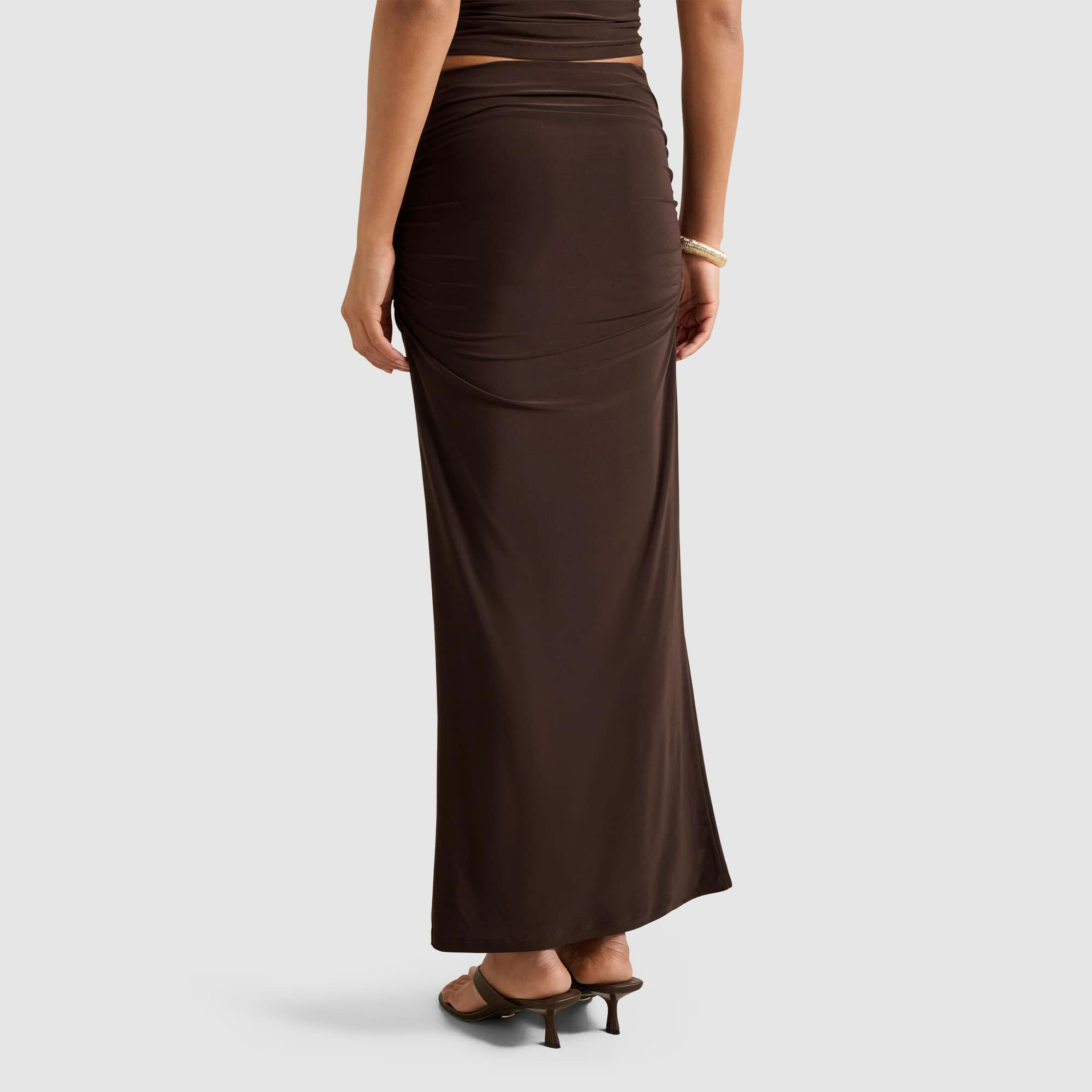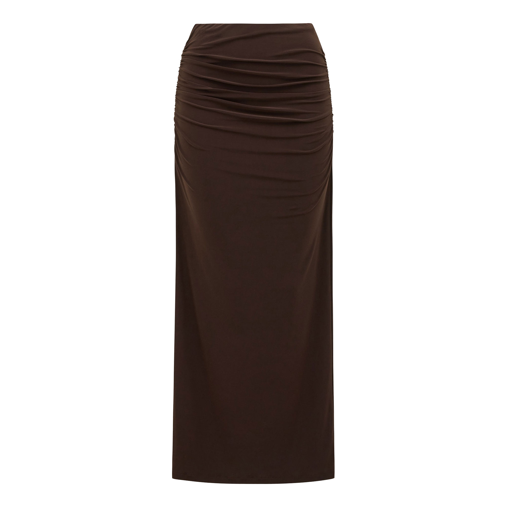 - Maxi length, elasticated waist, ruching, jersey fabrication