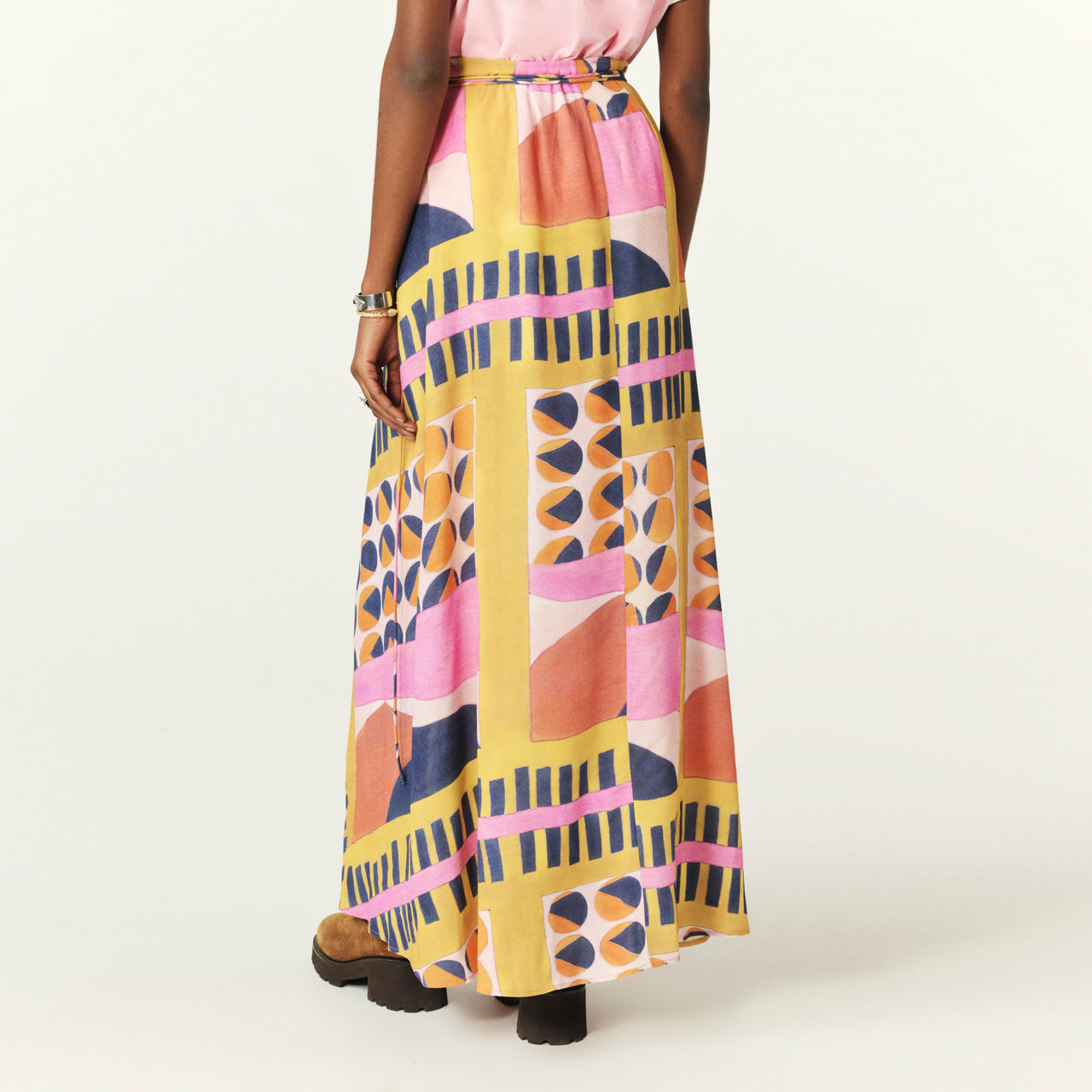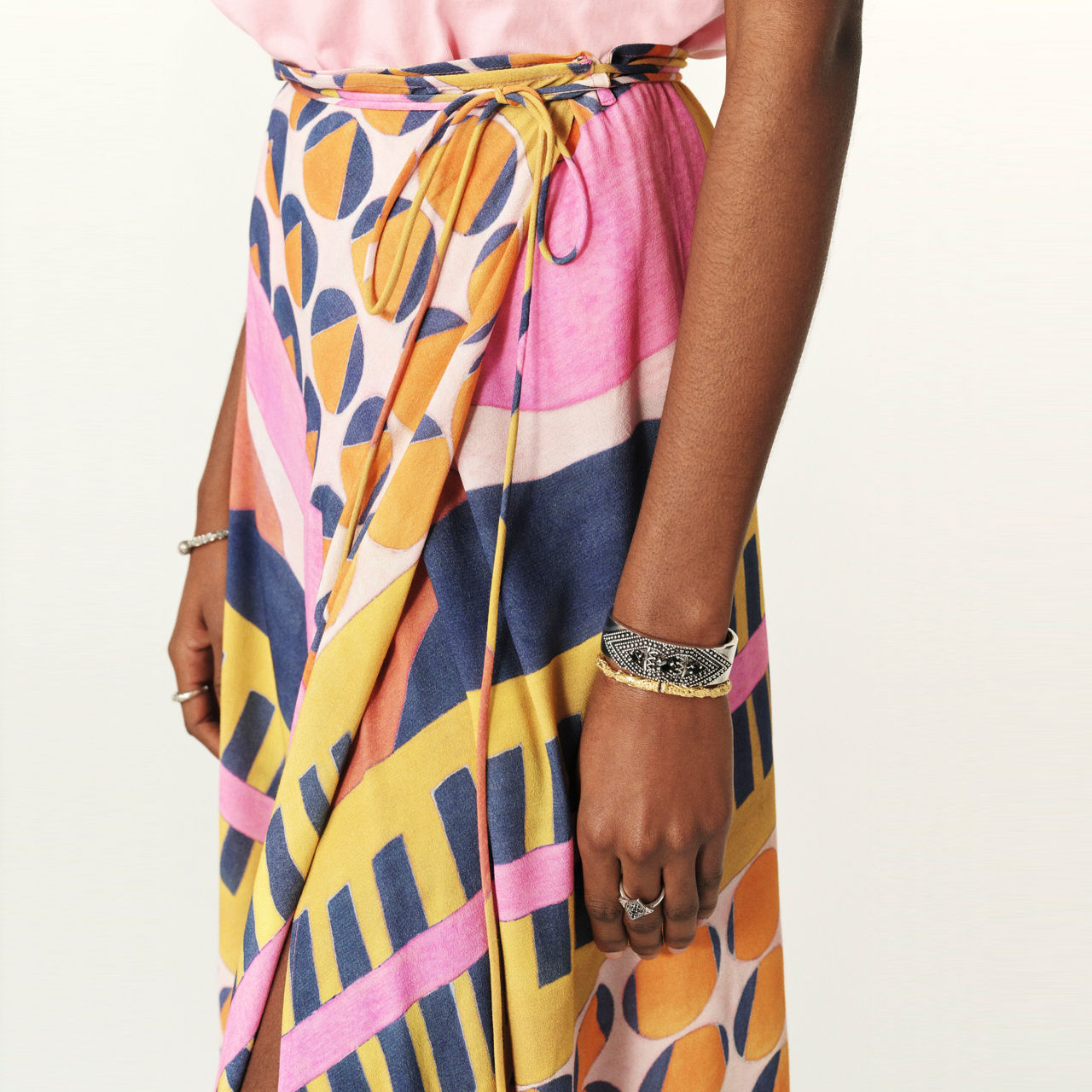 • Printed, wrap-style, self-tie detail, side slit, maxi length