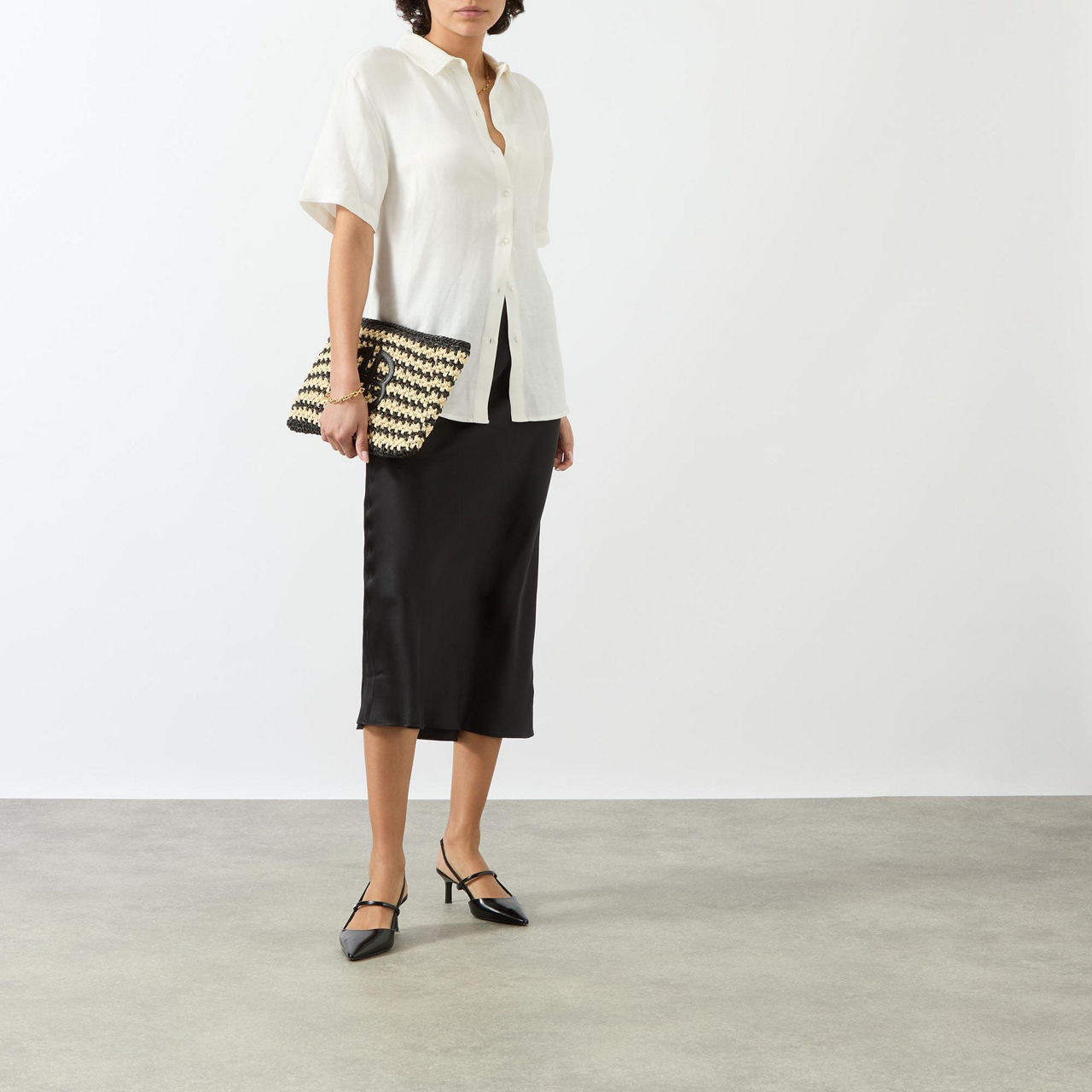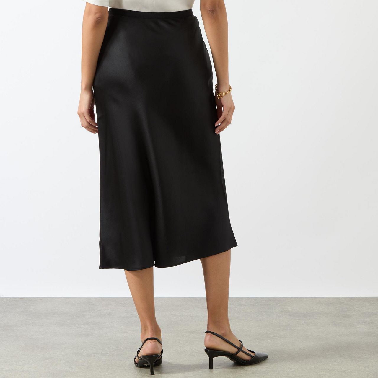 - Midi length, bias cut, high waist.