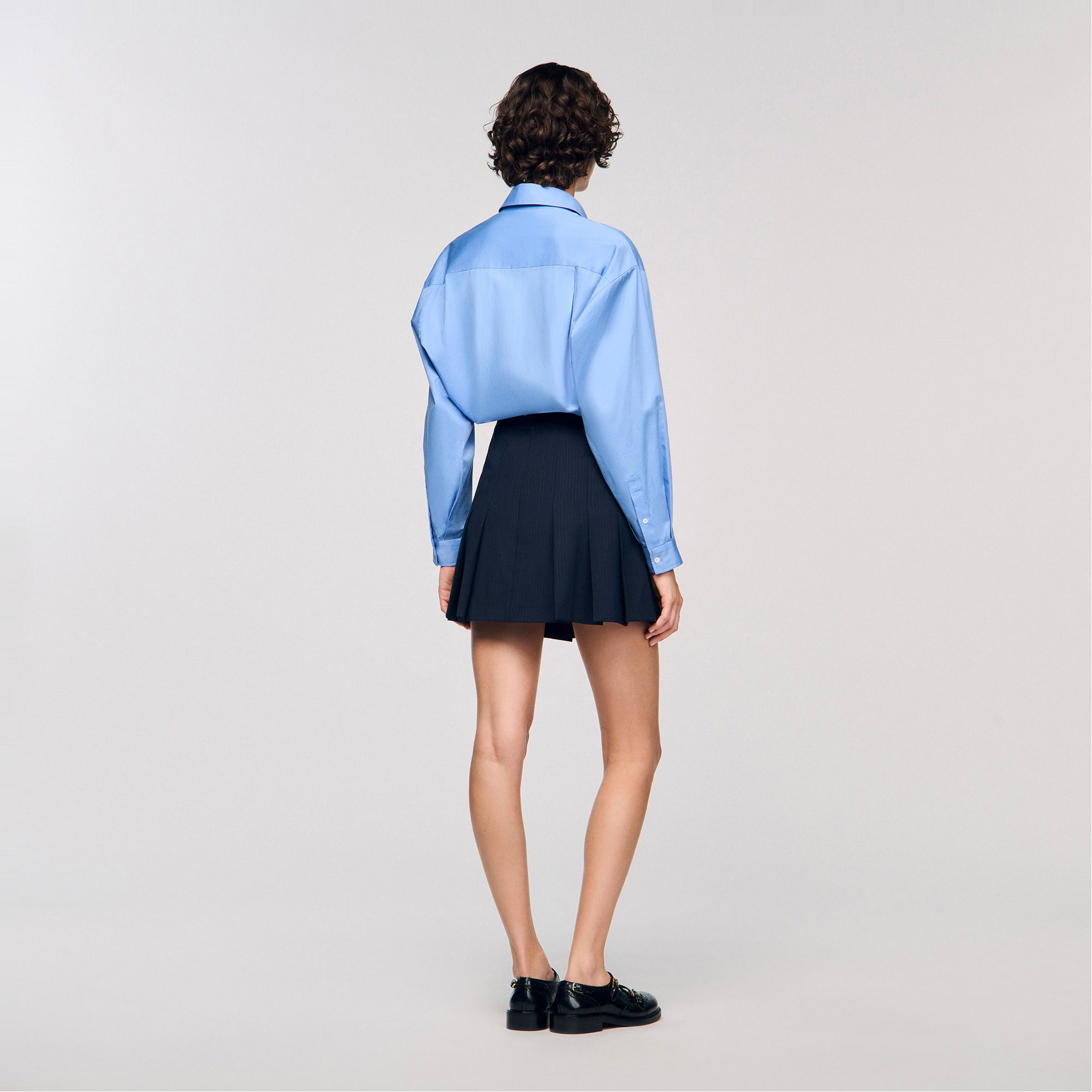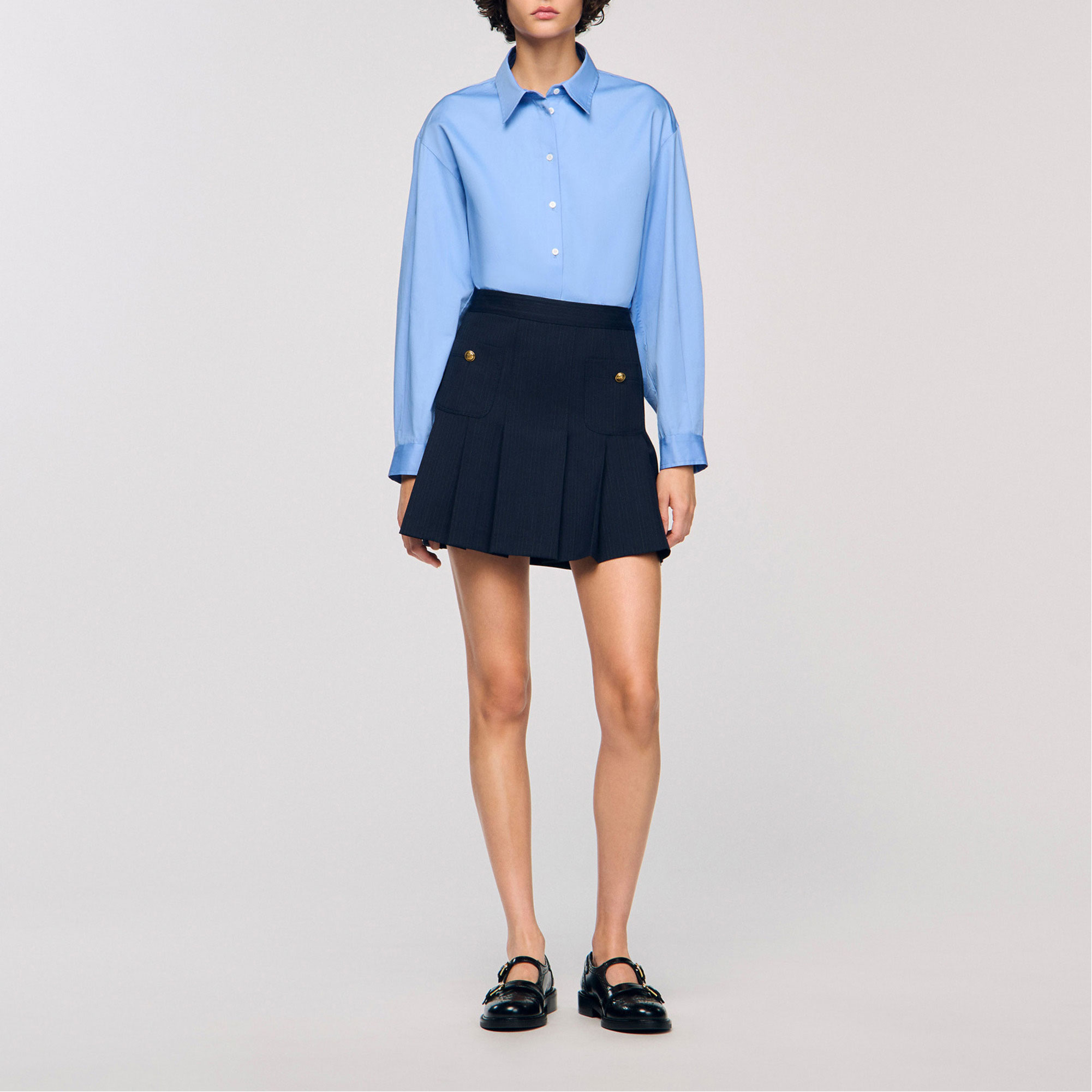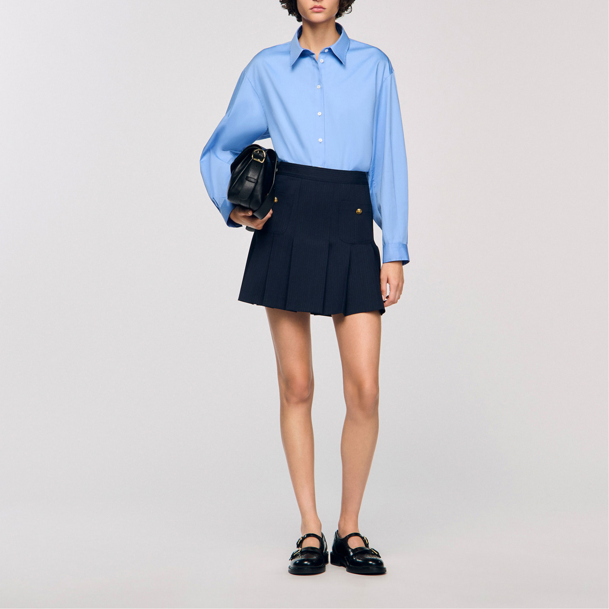 - Mini, fine stripes, rounded patch pockets with buttons, stitched flat pleats at the front and back, back zip fastening