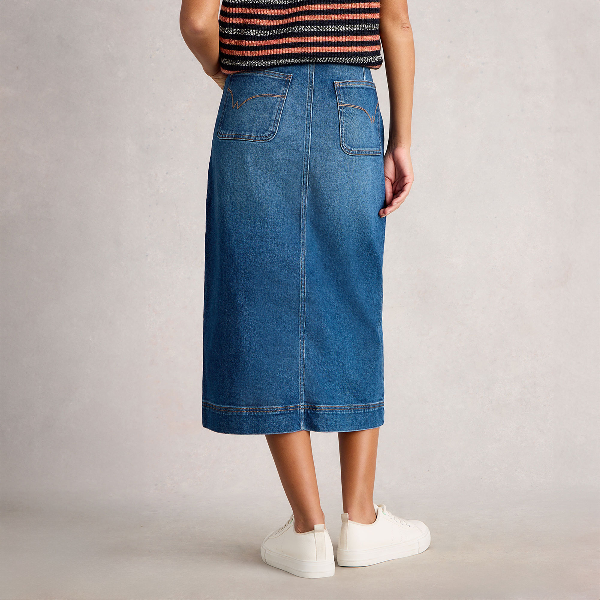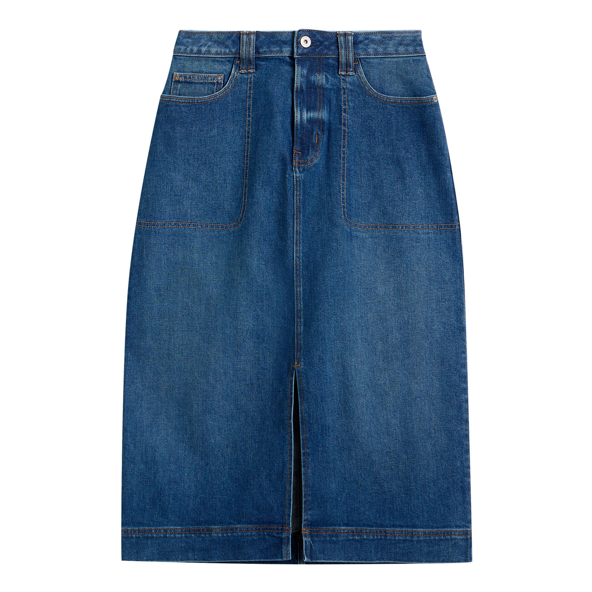 - Denim fabric, midi length, pocket profile stitch detailing