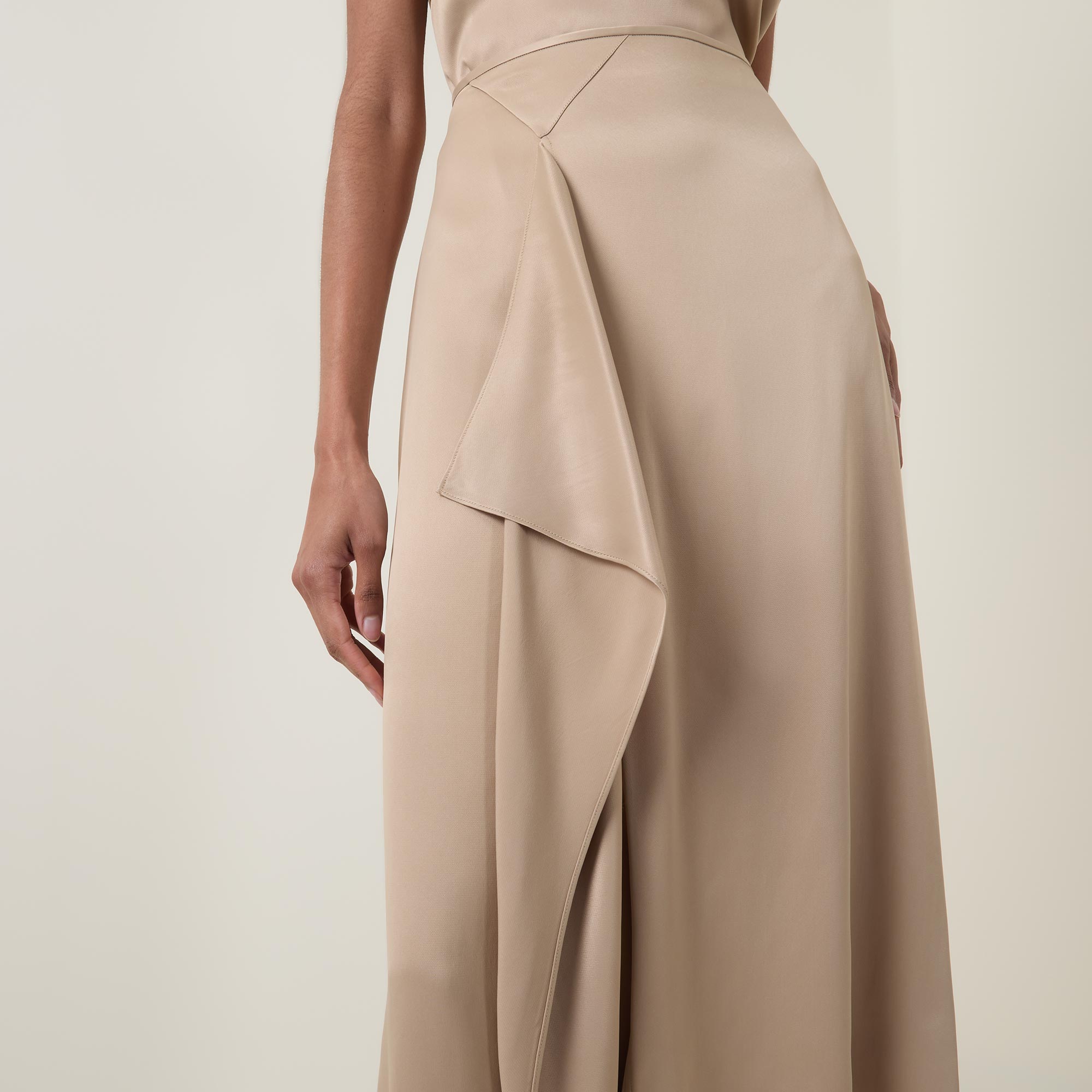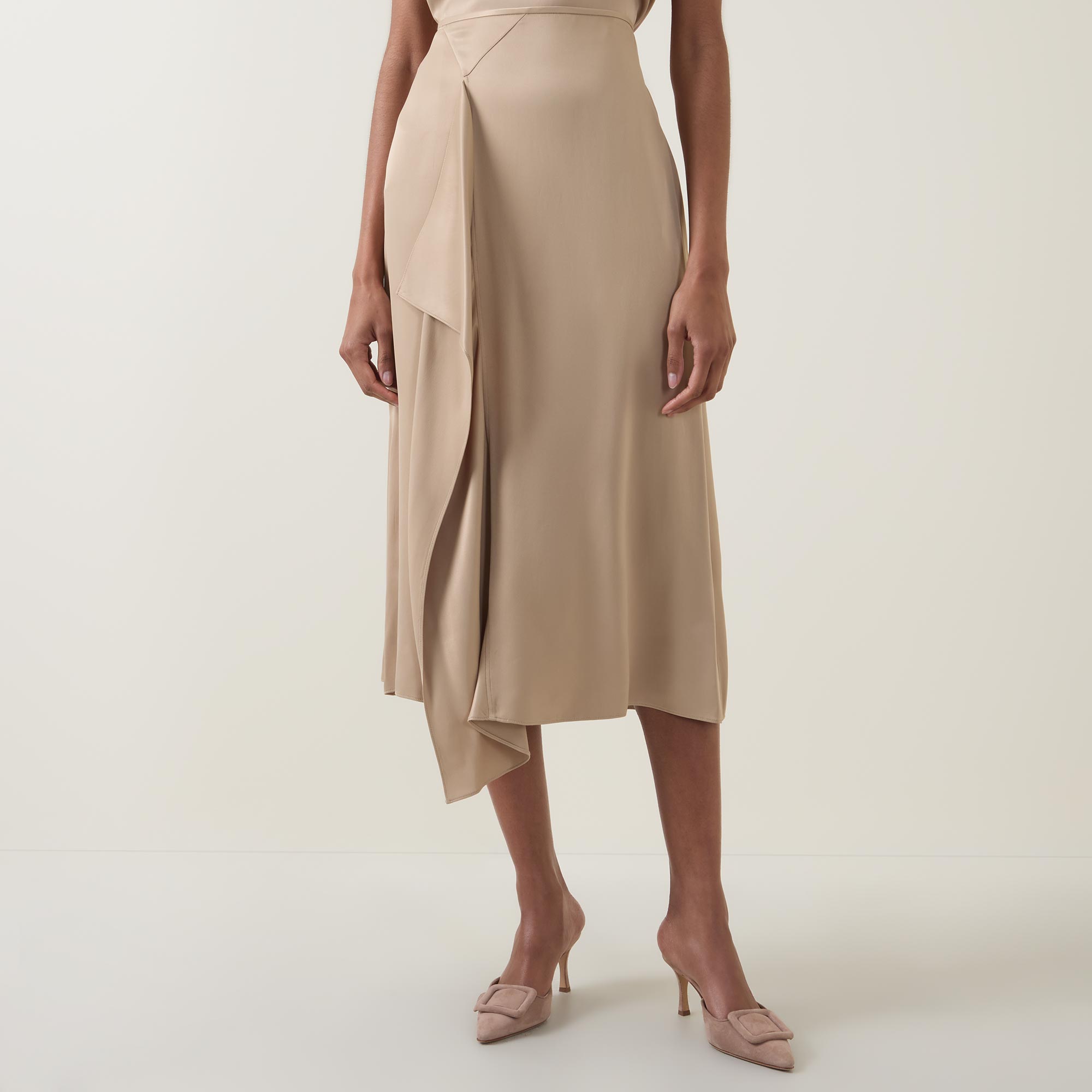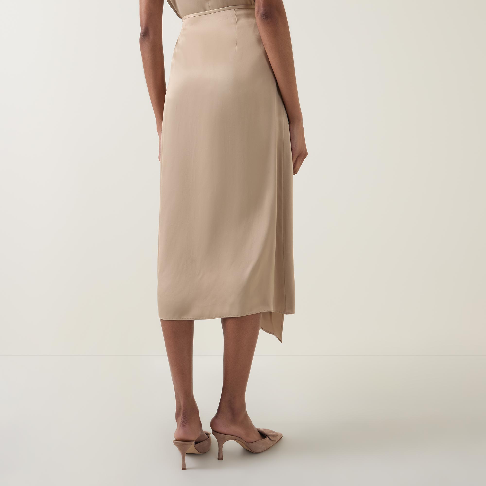 - Elasticated waistband, midi length, asymmetric hemline, draped details, fluid fabric