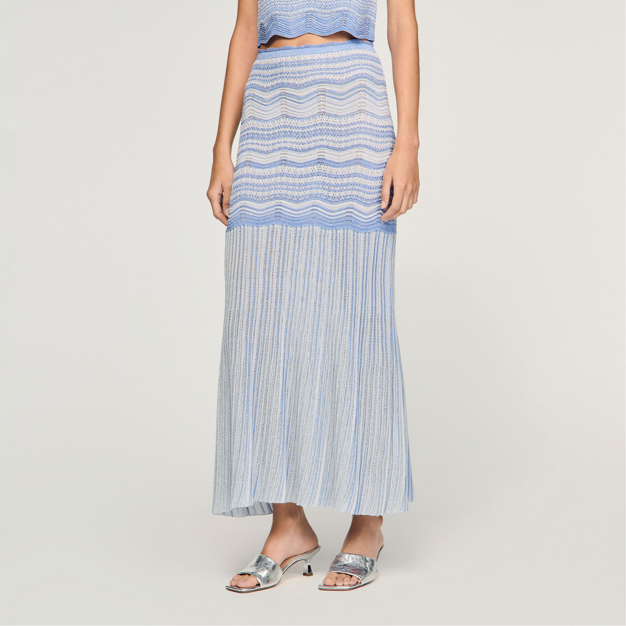 - Long length, flared cut, decorative knit, ombré effect, elastic waist
