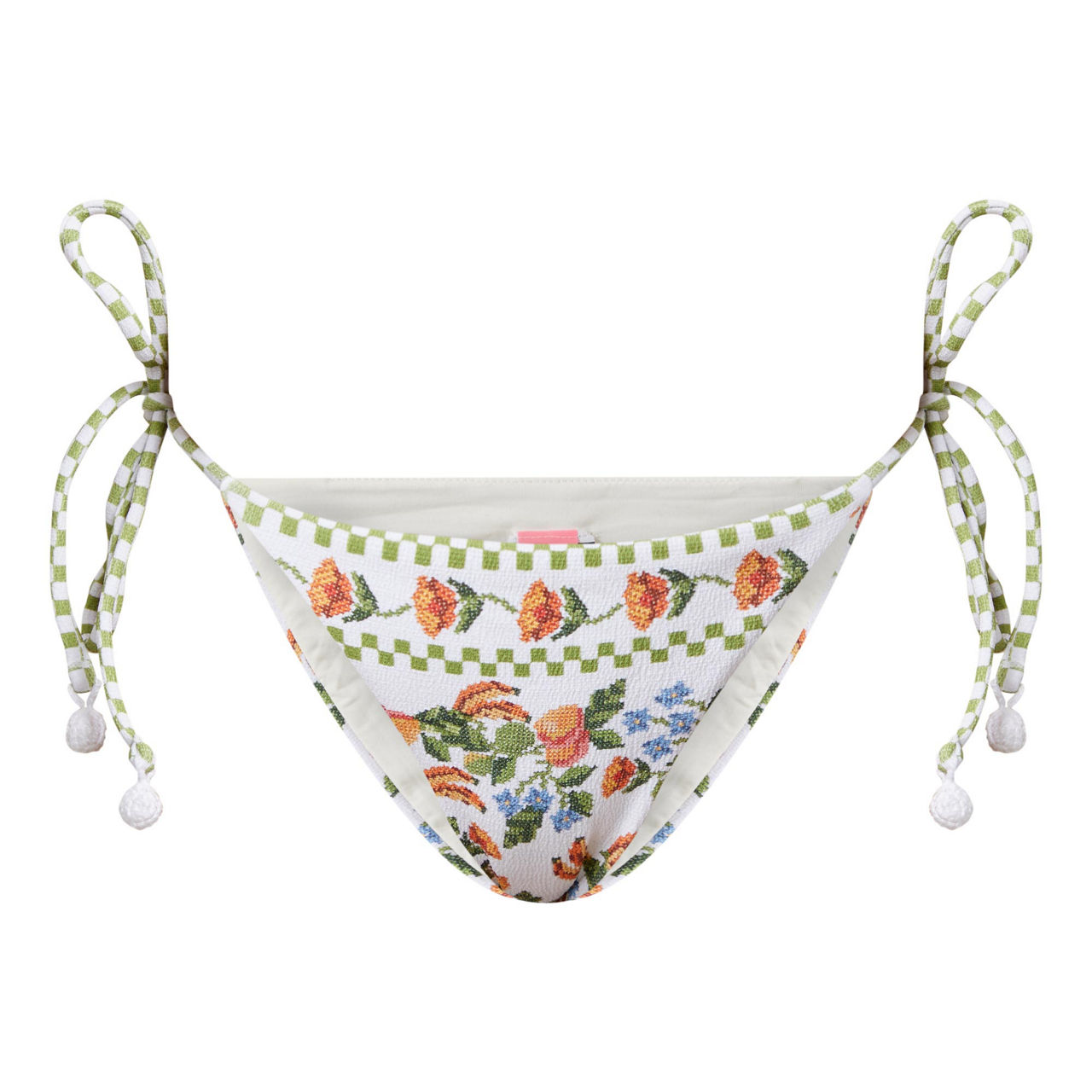 - Low-rise waist, high-cut legs, side-tie design with beaded tassels, cheeky-bottom, all-over fruity-floral design