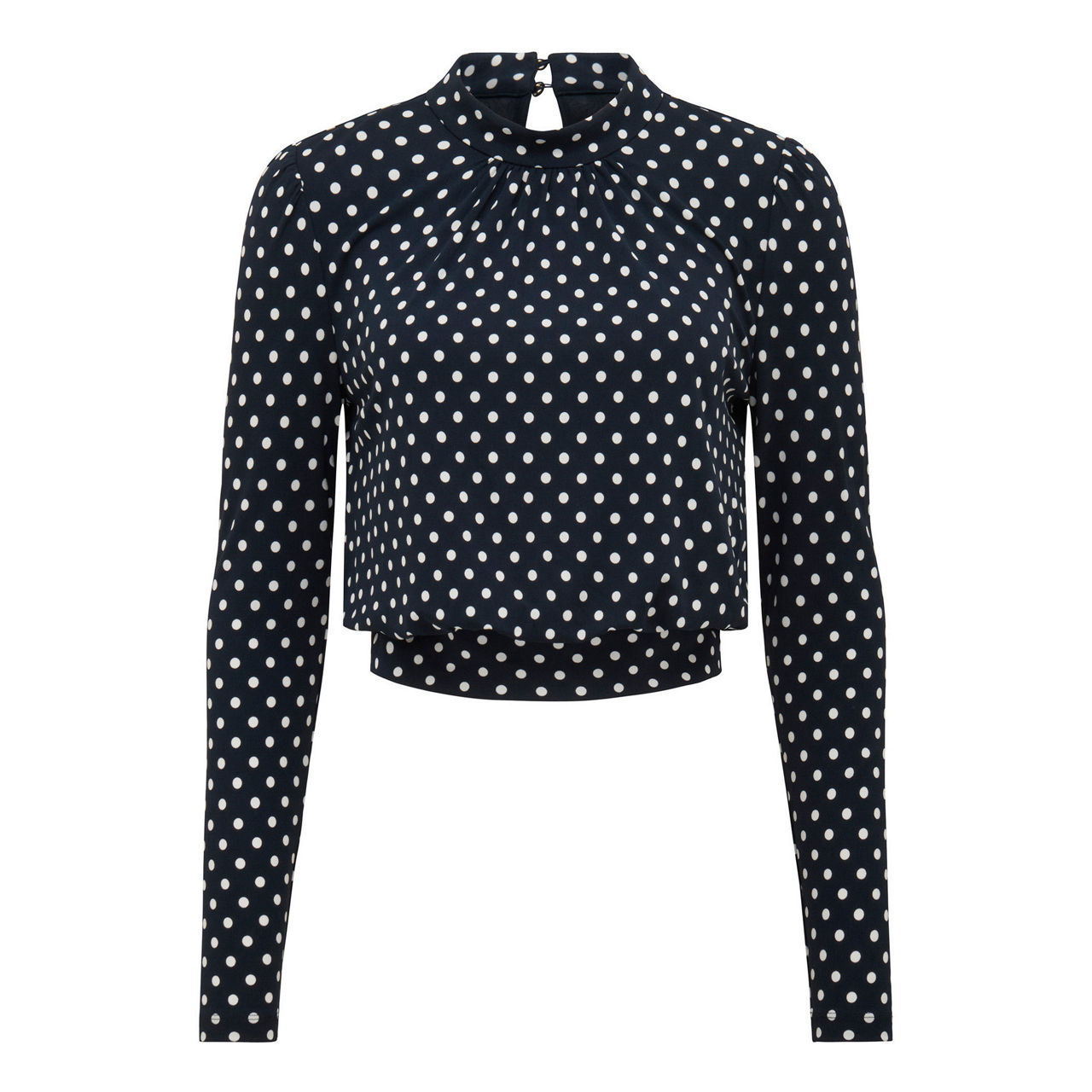 - Mock neckline with pleated details, button fastening at rear, long sleeves, double layered, polka dot pattern