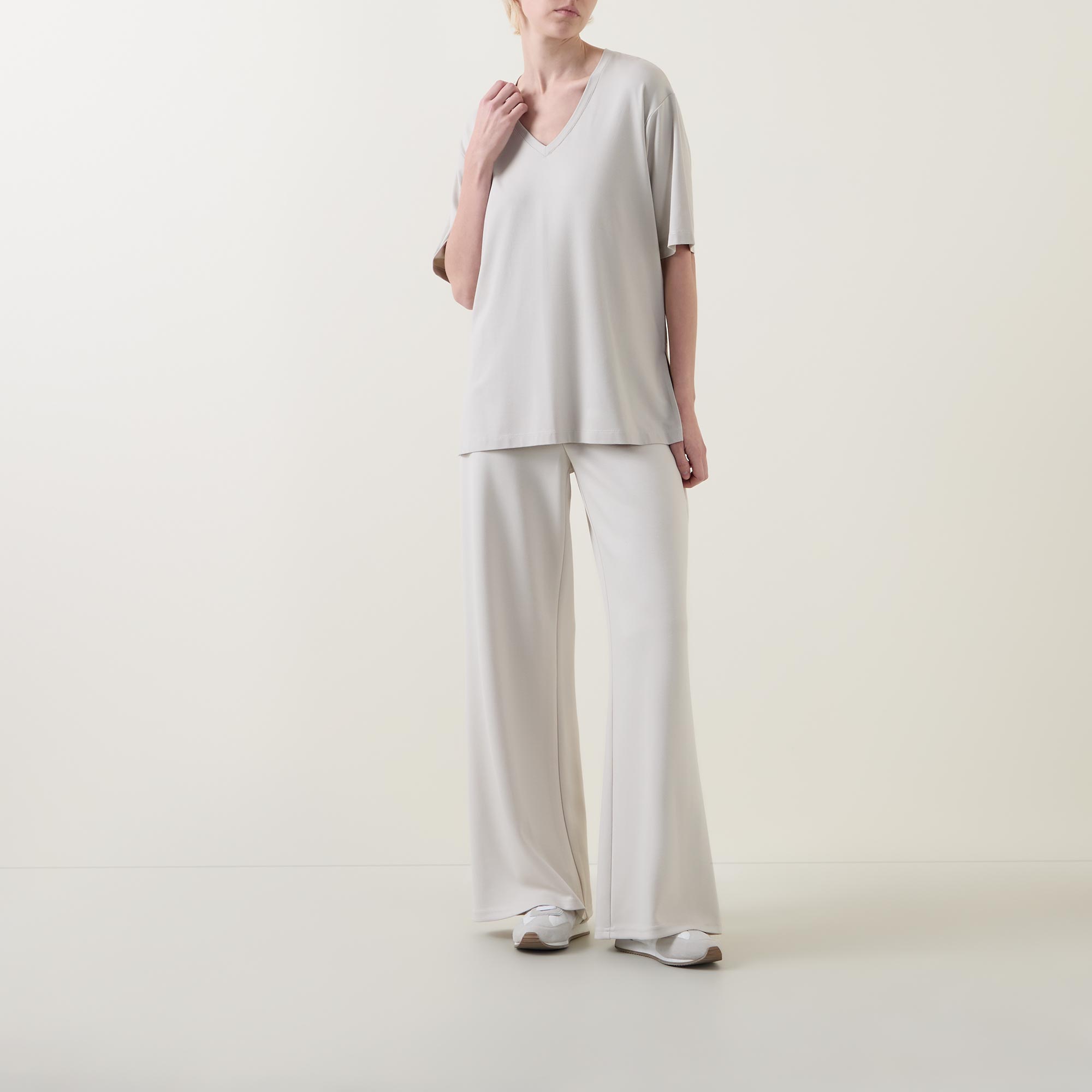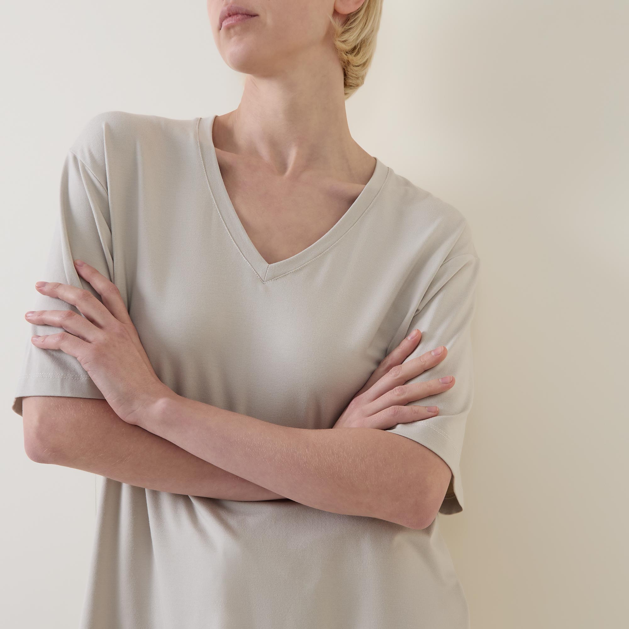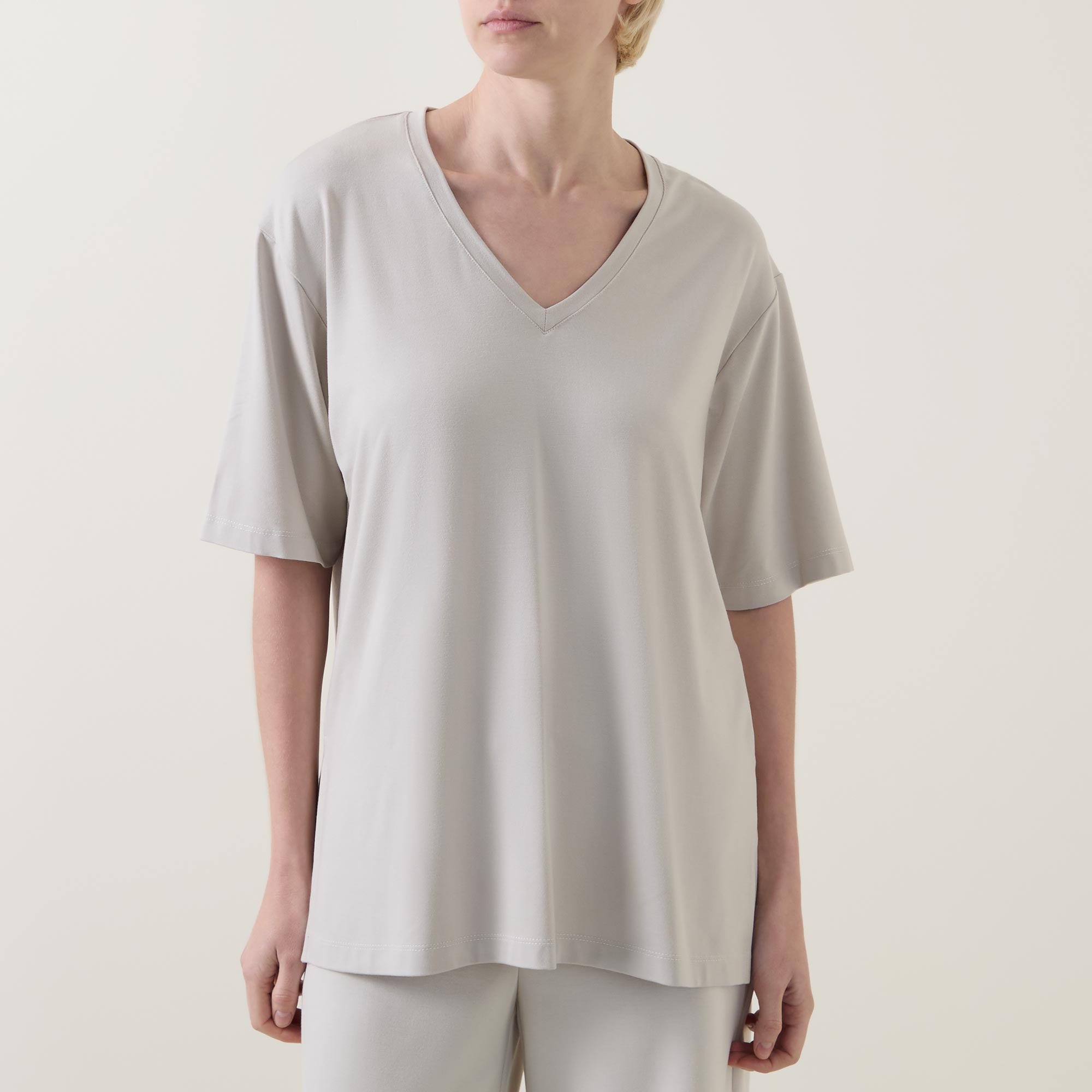 - Side slits, V-neckline, short sleeves, straight hemline