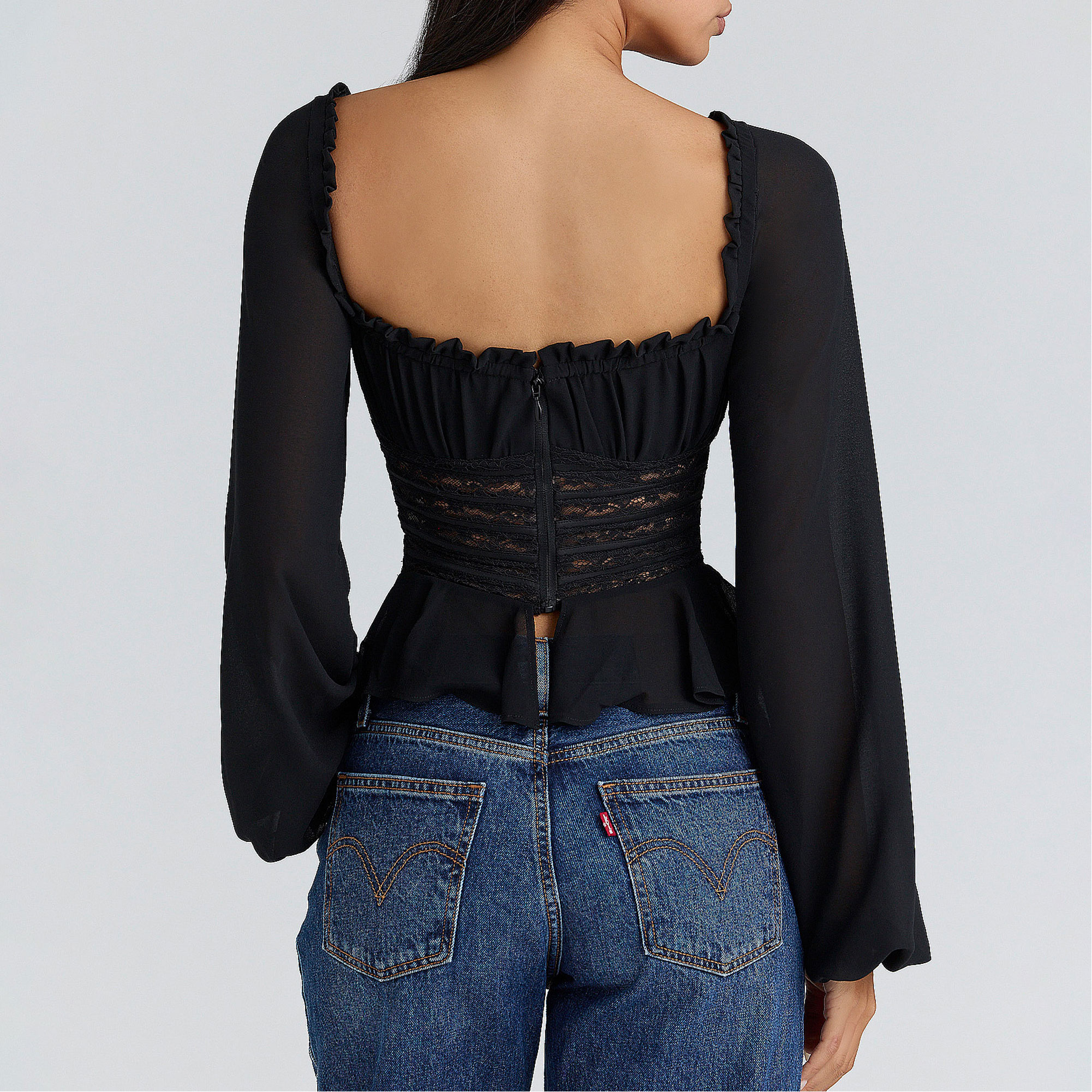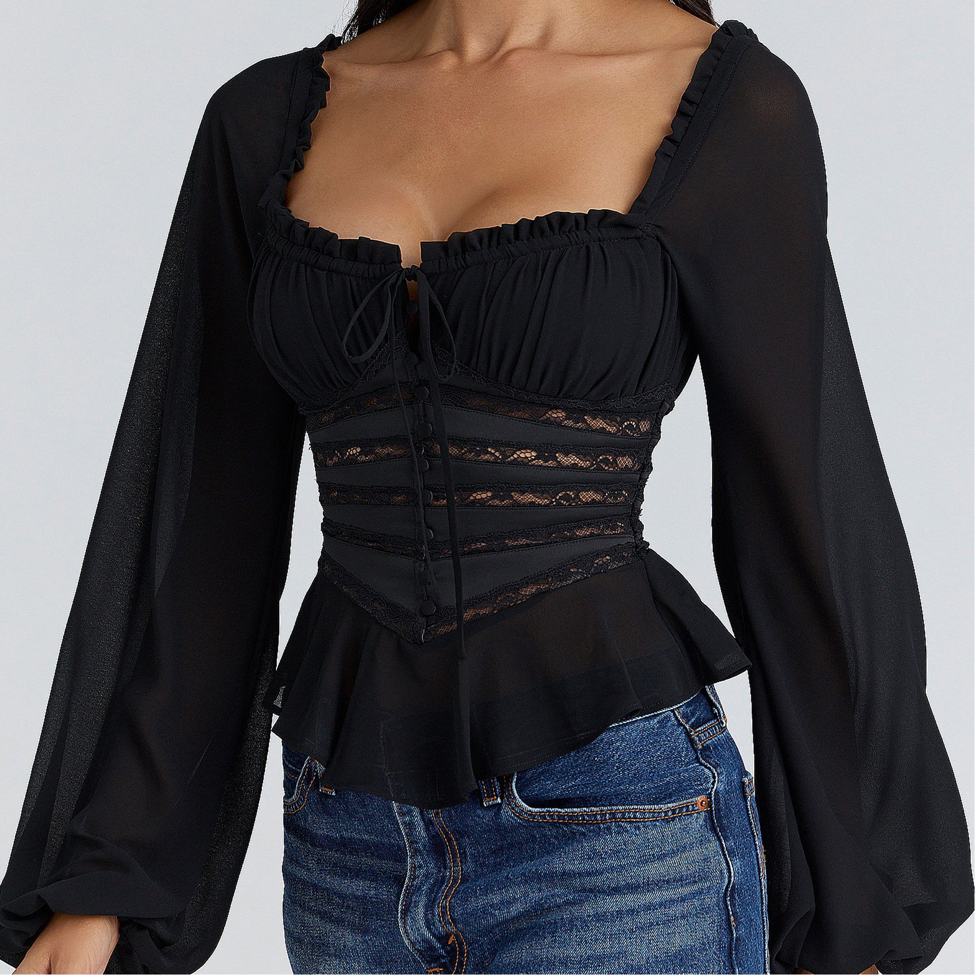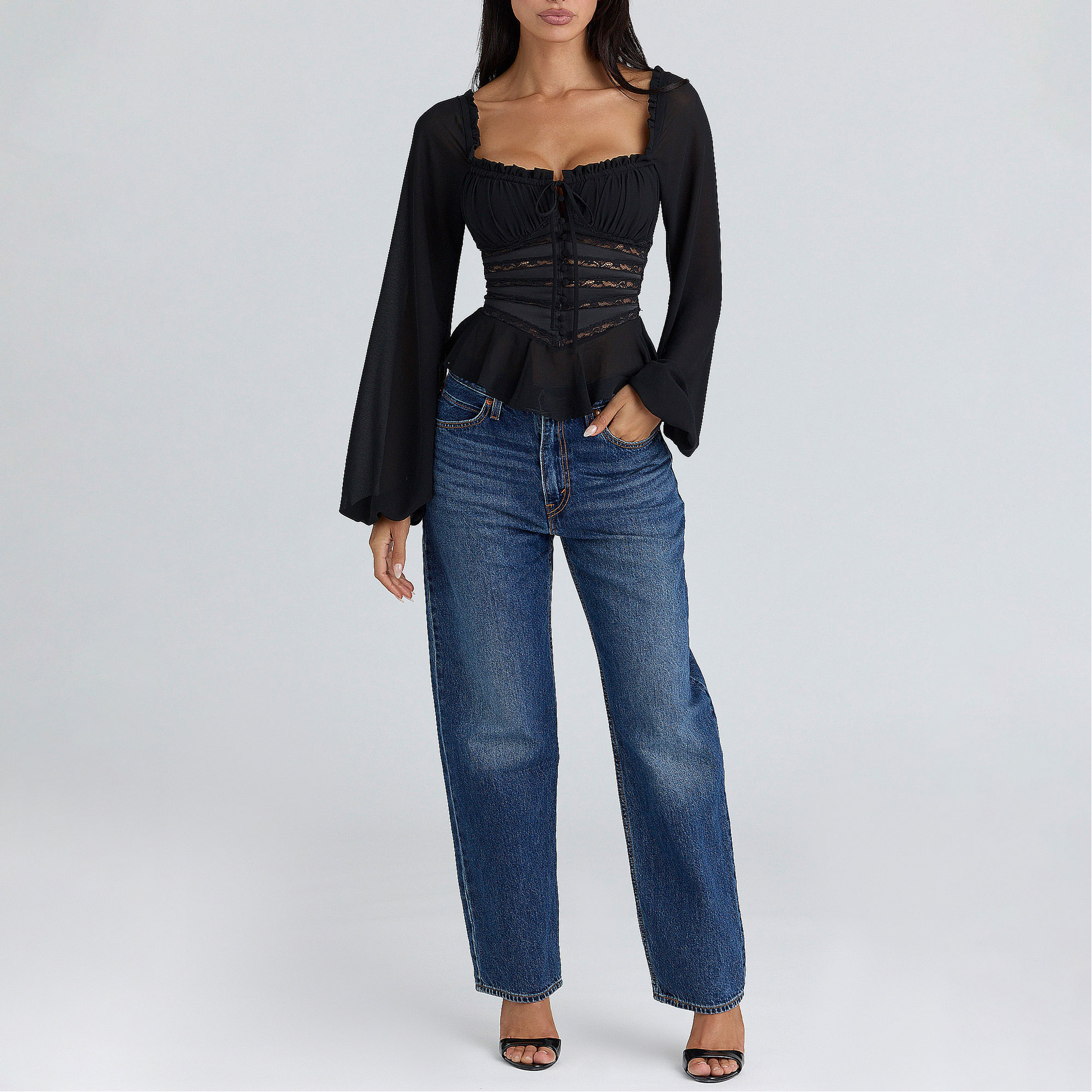 - Sweetheart neckline, long balloon sleeves worn on or off the shoulder, adjustable drawstring bust, back zip, plenty of stretch
