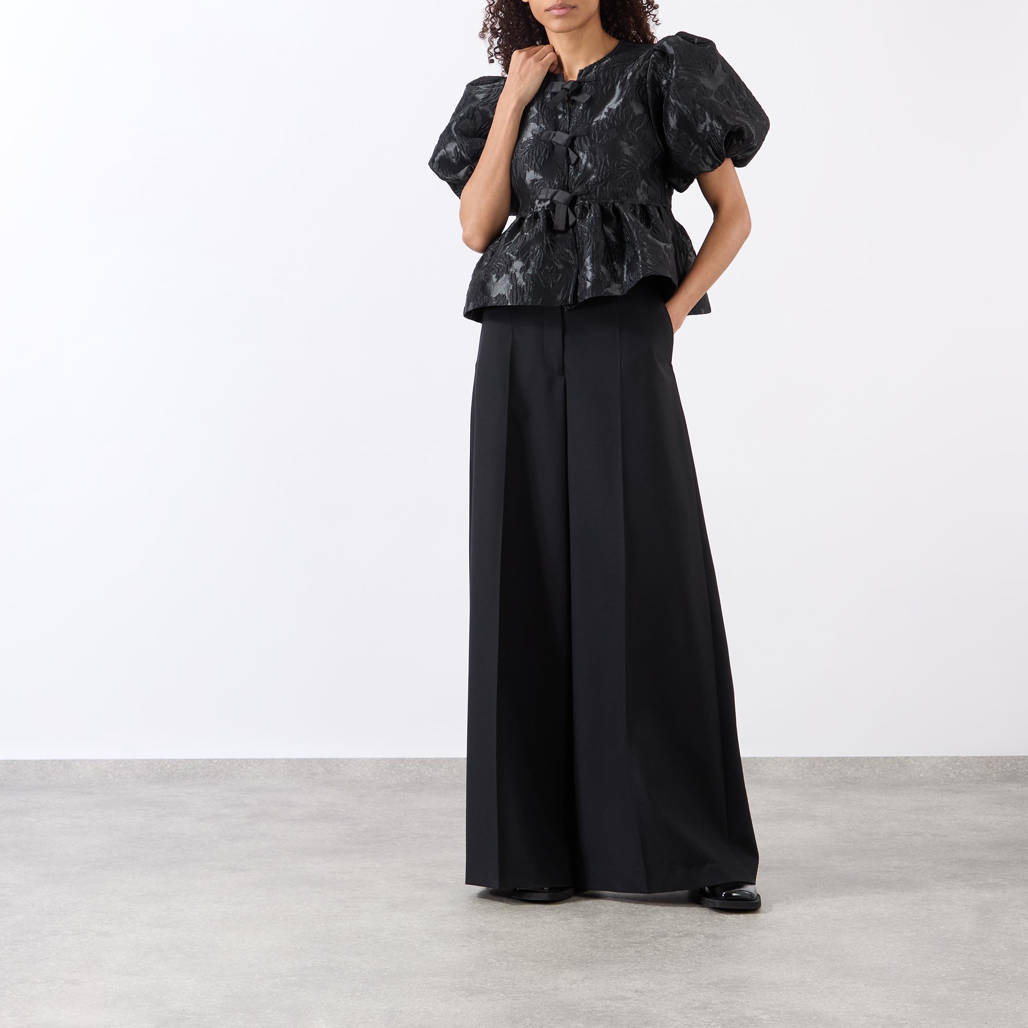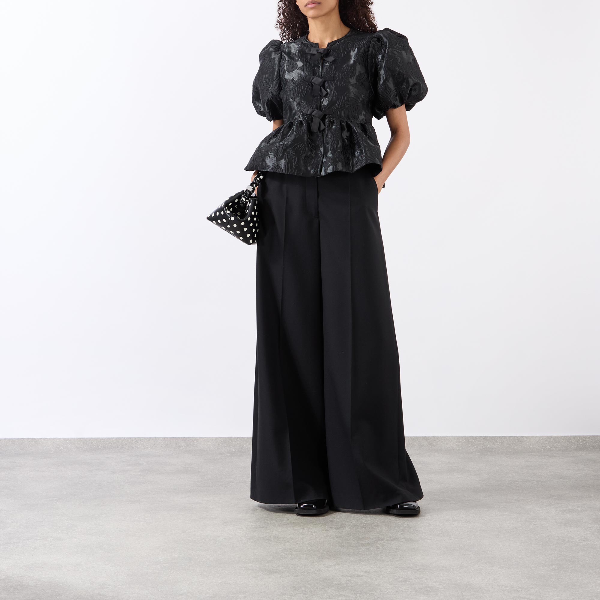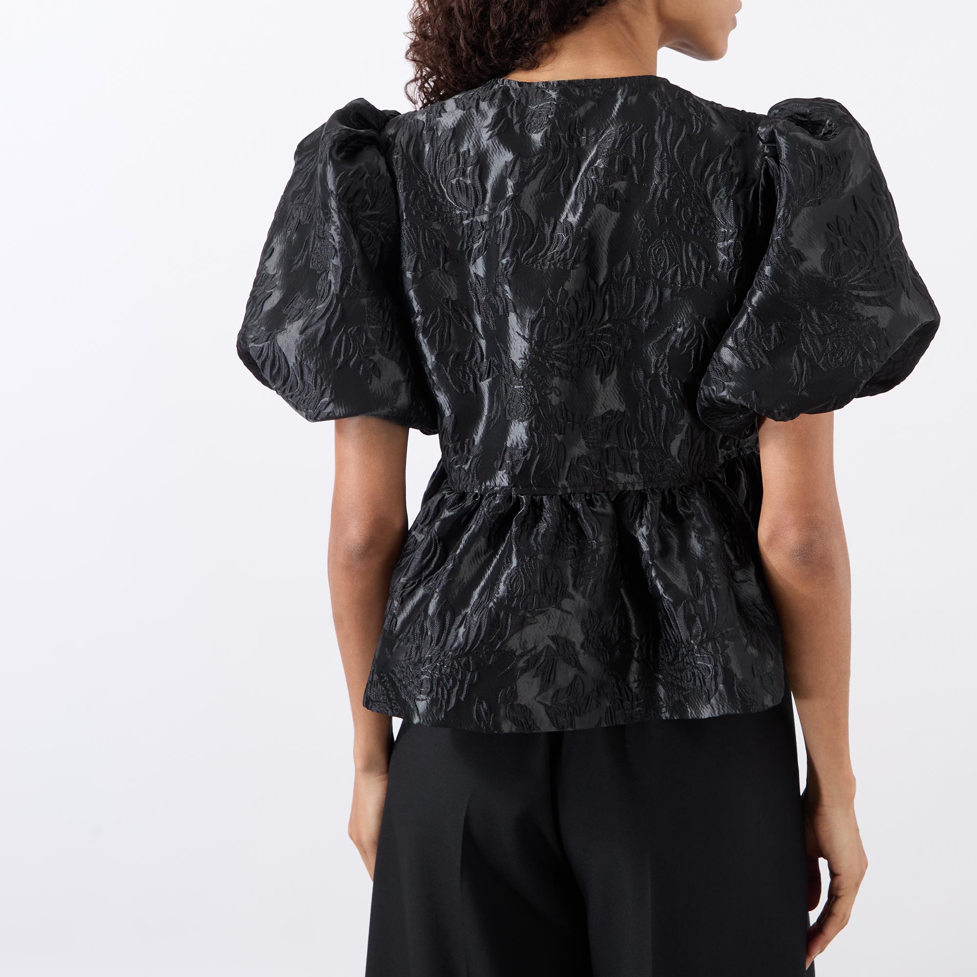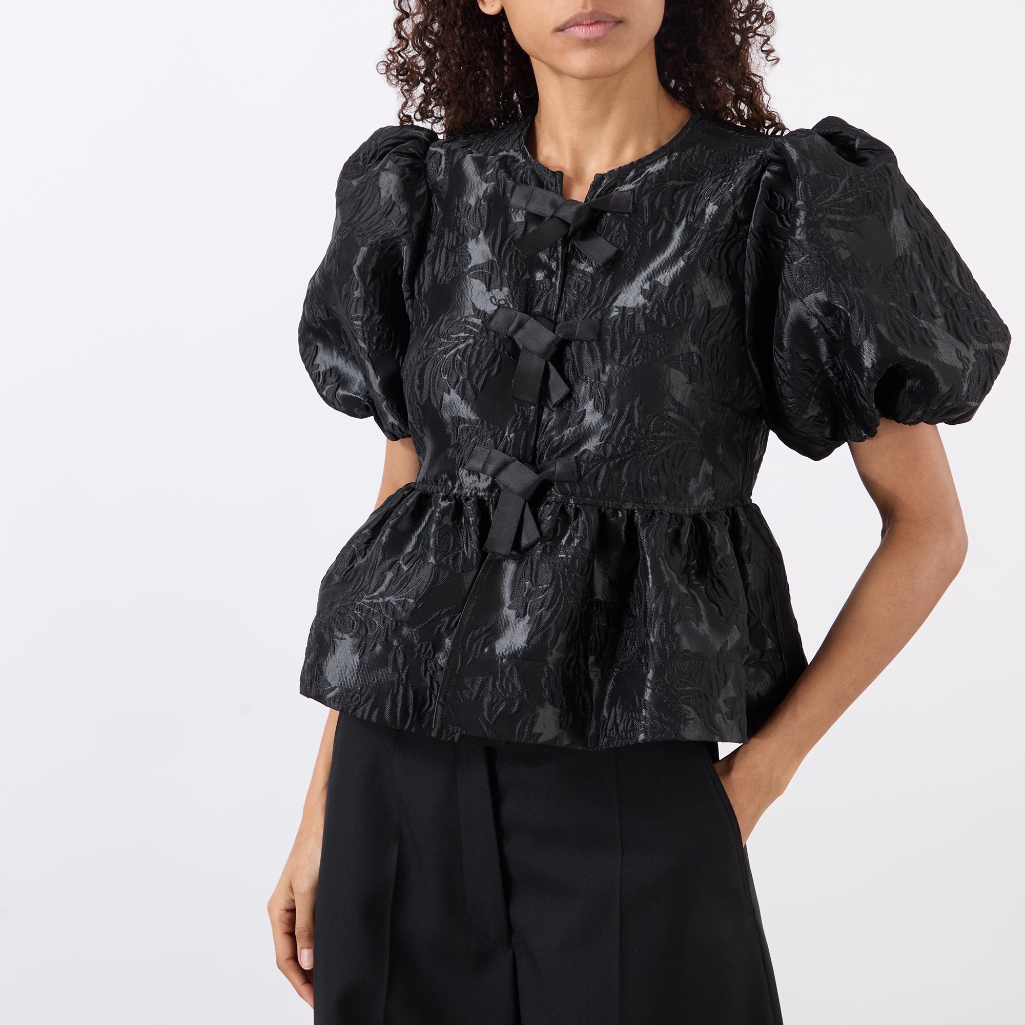 - Short puff sleeves, round neckline, three front bow fastenings, jacquard pattern, peplum hemline, textured finish