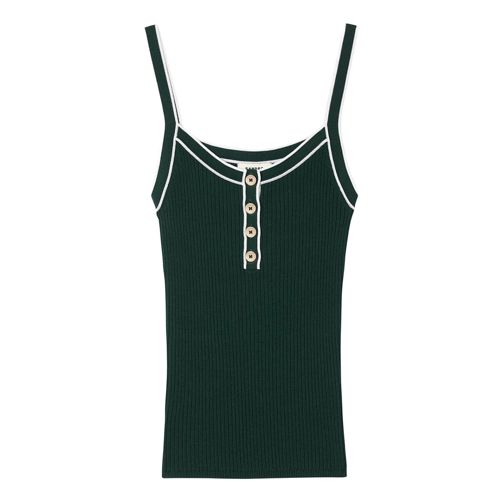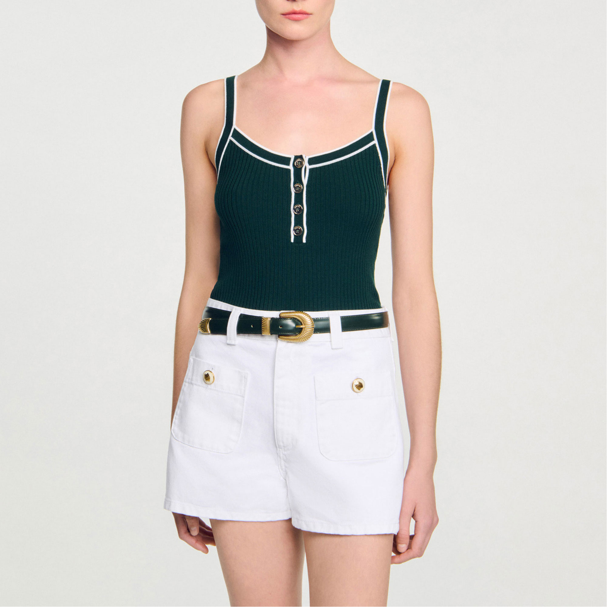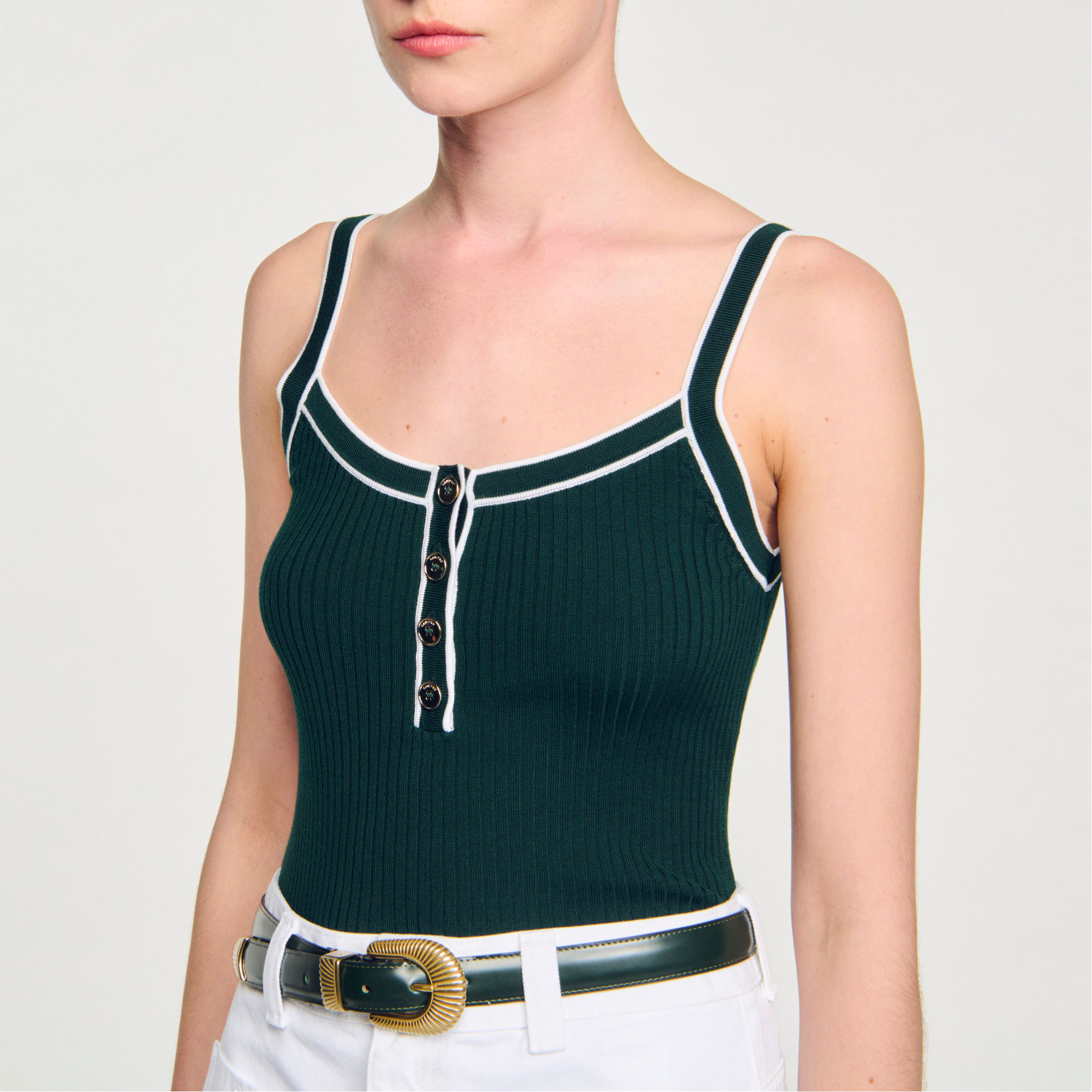 - Fine rib knit, contrast piping, straps, decorative button placket, slim fit
